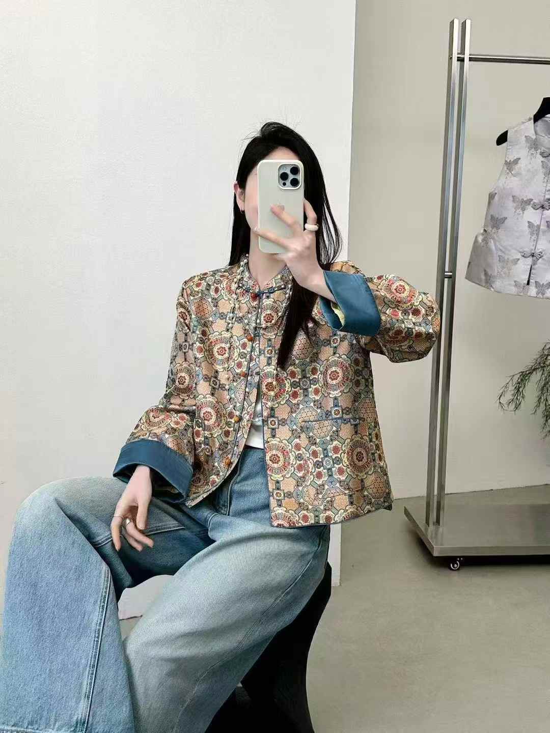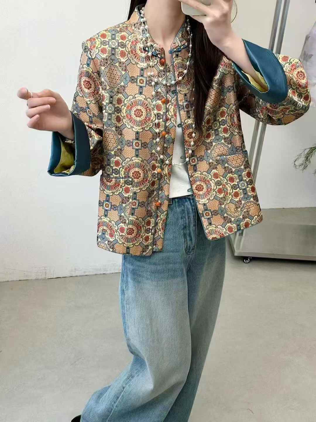 SC1A07 切蓝色外套【宋词】纹样还原南宋《营造法式》中的几何团花图案,立领盘扣保留了宋代服饰的雅致风骨,袖口采用撞色拼接,衣长为短款宽松,弱化了传统中式服装的厚重感,适配现代日常穿搭