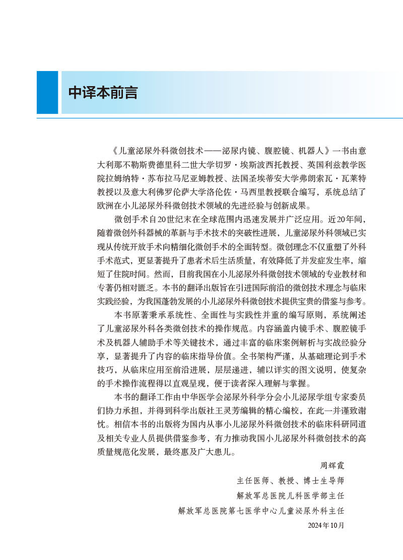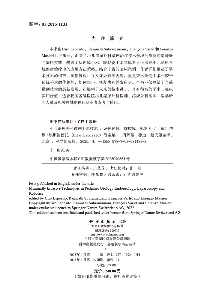 本书由Ciro Esposito、Ramnath Subramaniam、Fran.ois Varlet和Lorenzo Masieri共同编写,汇集了小儿泌尿外科微创治疗技术领域的最新前沿进展与临床实践,覆盖了从内镜手术、腹腔镜手术到机器人手术在小儿泌尿系统疾病治疗中的应用方法策略。结合丰富的临床案例,作者详细阐述了手术技术的细节、操作流程、并发症处理等内容,重点突出微创手术相较于传统手术的优越性,如创伤小、恢复快和并发症少。全书不仅总结了当前微创技术的最新发展,还展望了未来的技术进步,具有很高的学术与临床实用价值,适合我国各级医院小儿泌尿外科医师、泌尿外科医师、医学研究人员及相关领域的医疗从业者参考与使用。