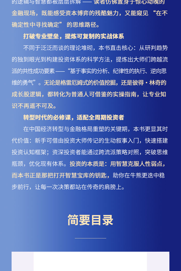 | 1.沉浸式叙事解码市场:以生动笔触还原投资大师关键战役,结合时政经济背景拆解决策逻辑,让读者置身金融现场,既感受资本博弈魅力,又掌握 ;在不确定性中找确定 的思维,理解市场本质;2.实战体系可复制:打破专业壁垒,提炼全球顶尖投资者跨越流派的共性成功要素(基于事实分析、纪律性执行、逆向思维勇气),将价值投资、成长股策略等转化为普通人可借鉴的实操指南,避免理论堆砌;3.适配全周期投资者:贴合中国经济转型与金融格局重塑背景,新手可借传记入门搭建投资认知框架,资深投资者能跨流派对照突破思维瓶颈,满足不同阶段投资者需求;4.直击投资本质:紧扣 ;用理性对抗人性弱点 核心,通过大师实战心法与制胜哲学,传递 ;基于事实分析、纪律性执行 等对抗人性弱点的关键能力,助读者在牛熊更迭中稳步前行,让决策依托大师智慧。 |