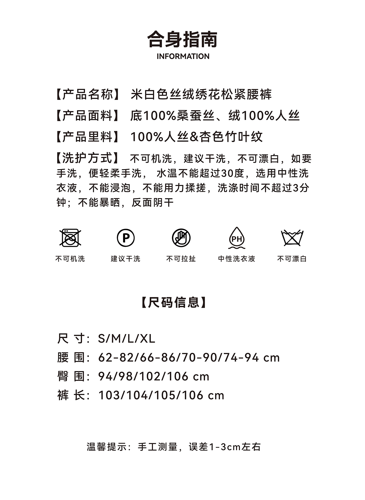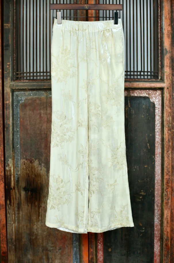 盛唐牡丹 | 米白色丝绒绣花松紧腰裤(有内衬)