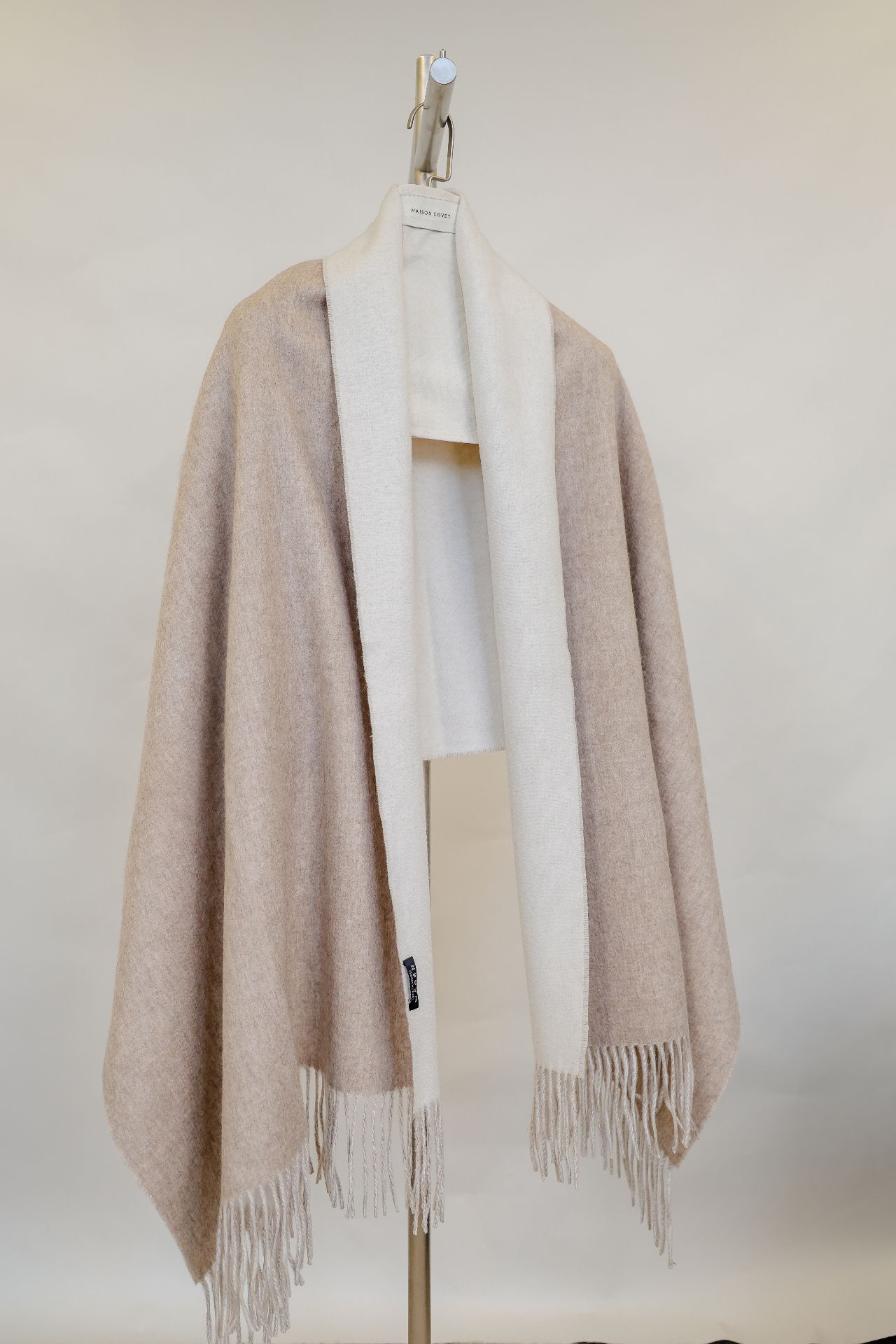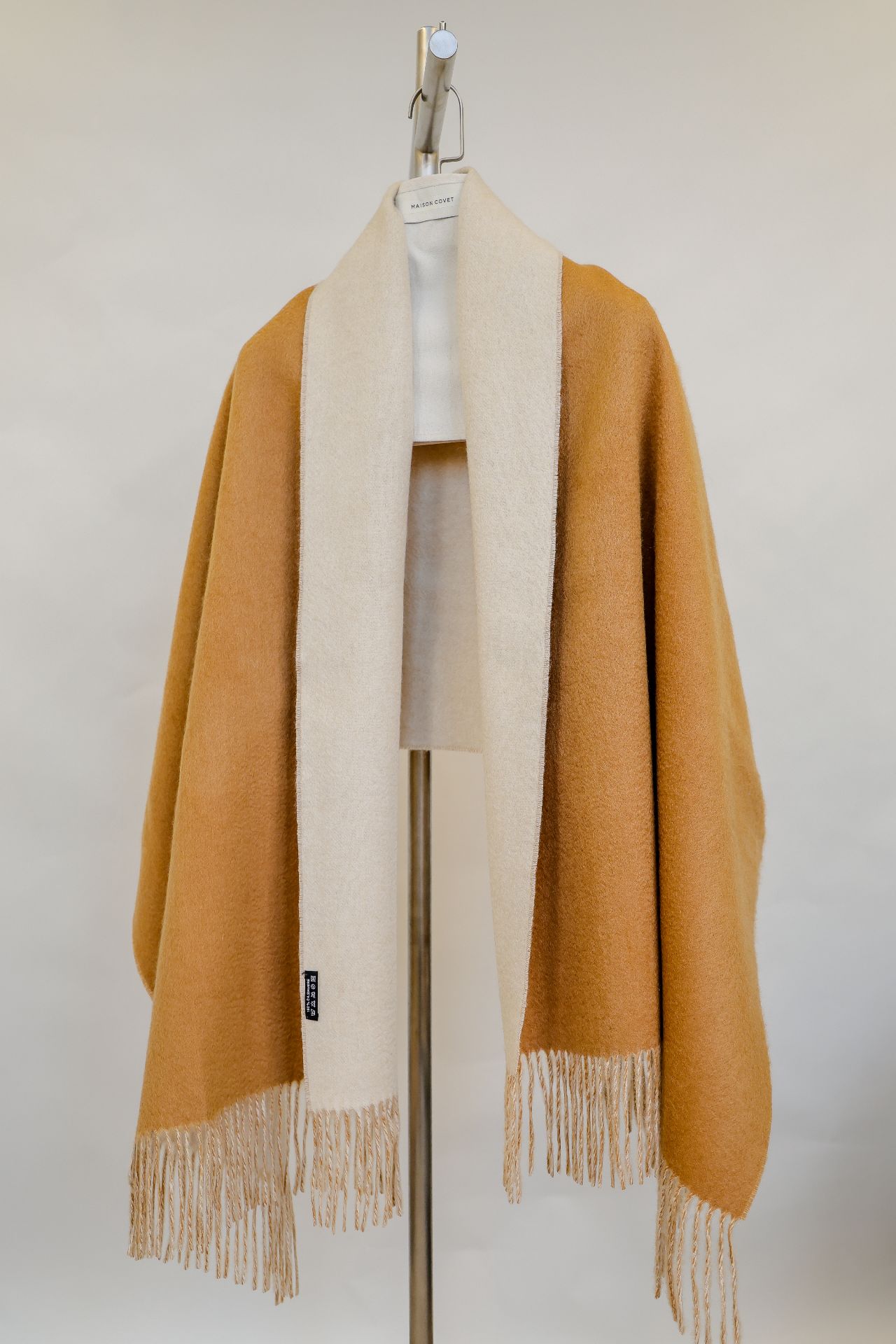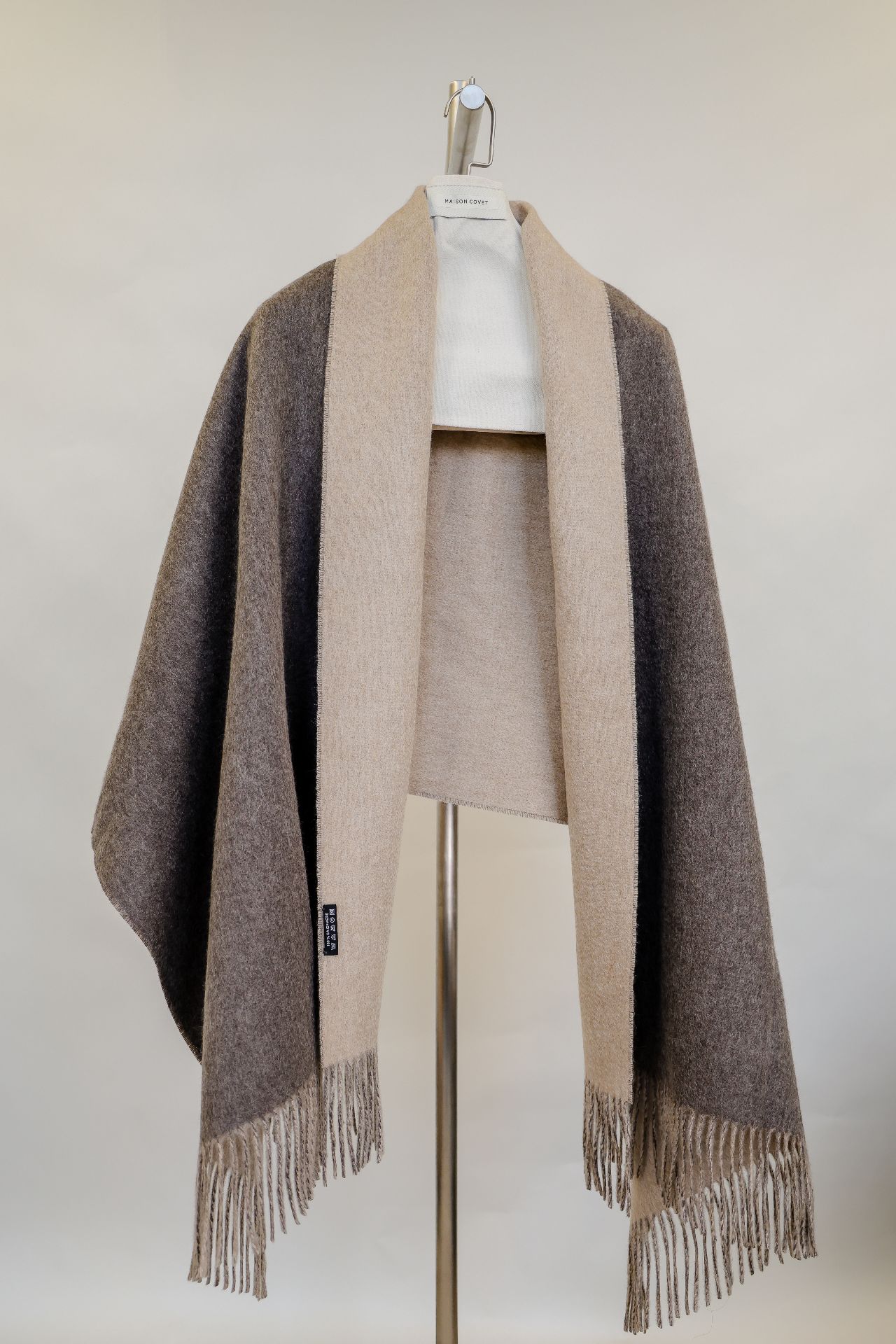 此款双色披肩采用精致的纯山羊绒制成