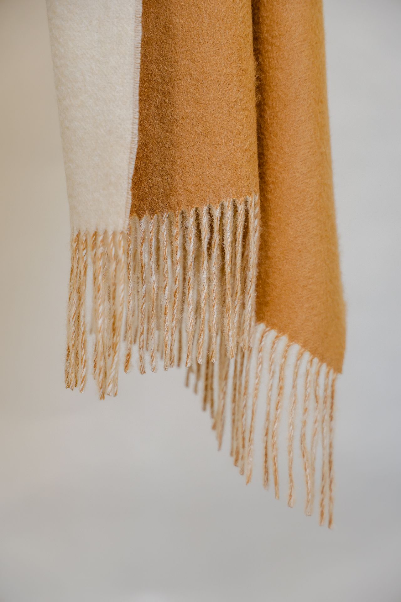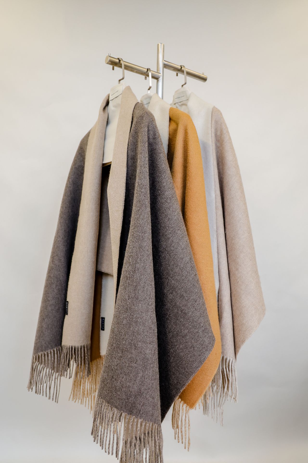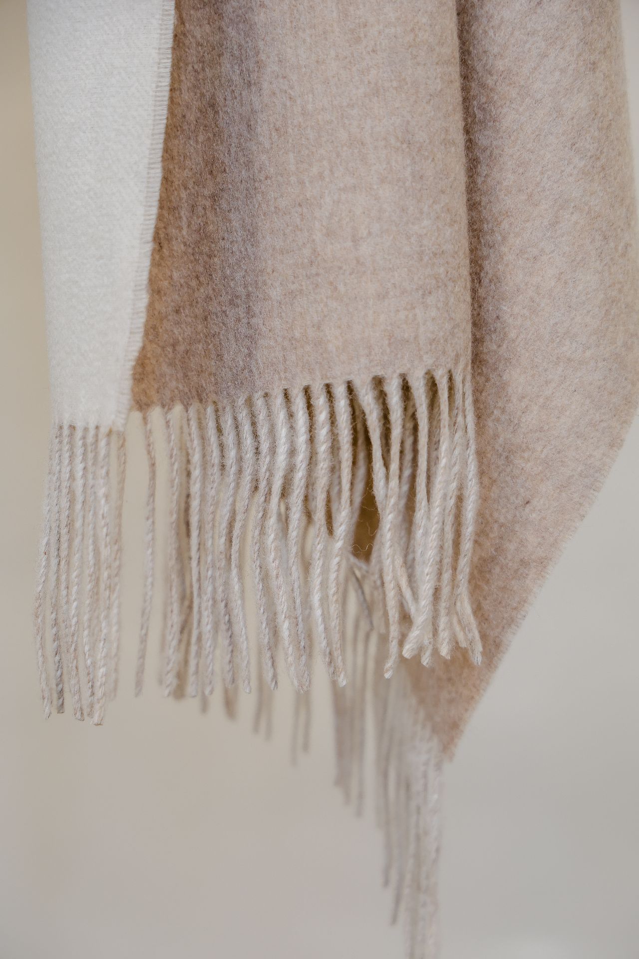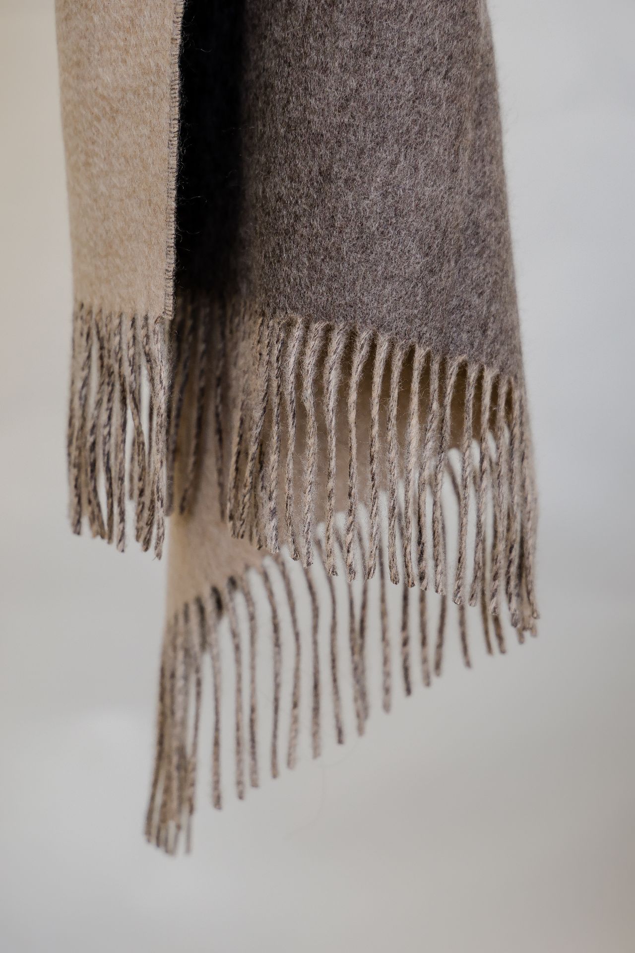 此款双色披肩采用精致的纯山羊绒制成