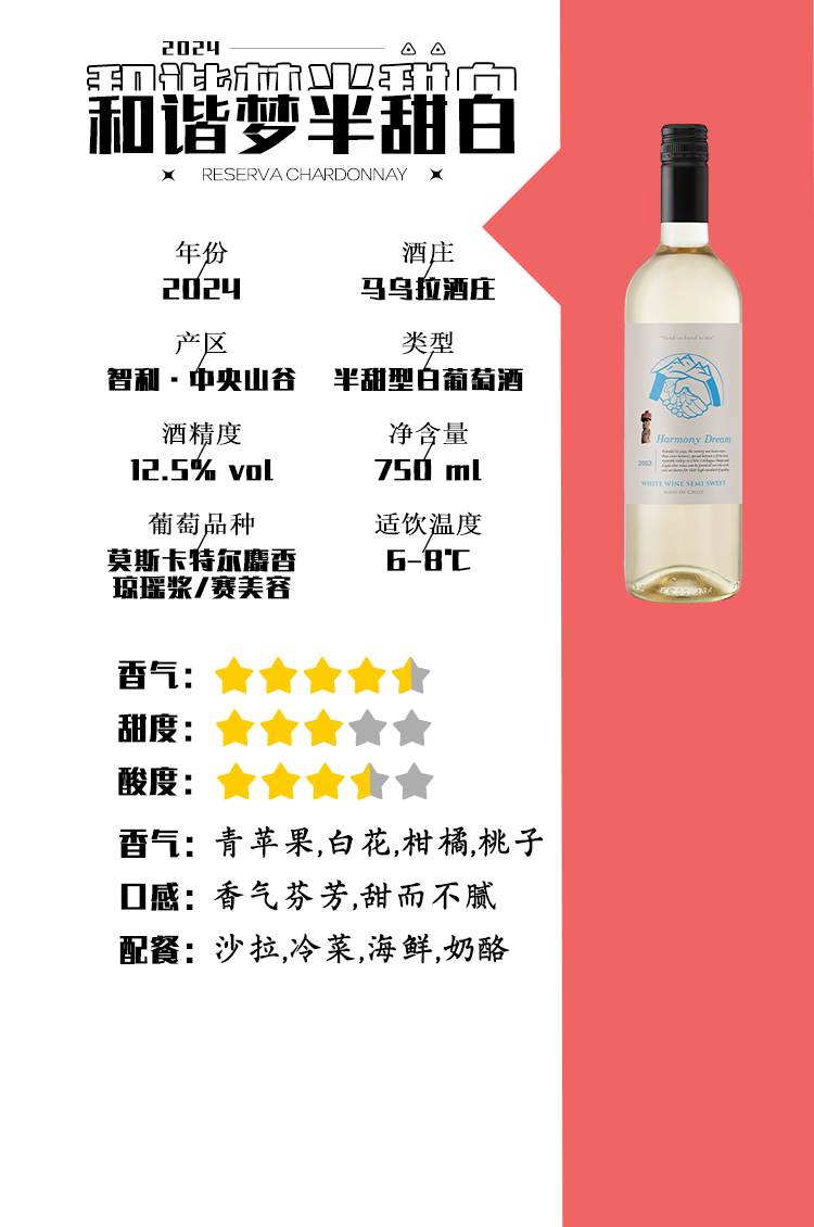 【智利精选】马乌拉酒庄和谐梦半甜白葡萄酒 750ml 2024