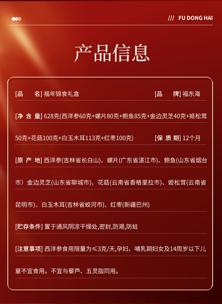 福东海 福年锦食礼盒628克/盒 山珍海味礼盒 大鲍鱼西洋参灵芝响螺片姬松茸八拼 高端实用干货补品送父母长辈