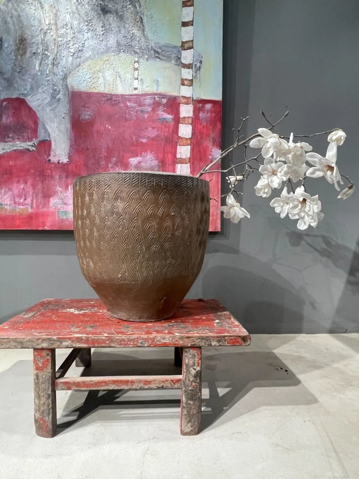 此褐釉刻矛头纹罄型大缸体型碩大,制作严谨、刻划纹饰犹如抽象艺术,形式优雅端庄,器底内凹露褐灰胎,快刀修胚痕迹处处可见,依其胎、釉与造型之气质,可断为清代的佳器,此大缸广口深腹,是插花摆设或是盛水养鱼种莲花的美器,表面使用磨损痕迹自然,别具旧物“用之美”特质。