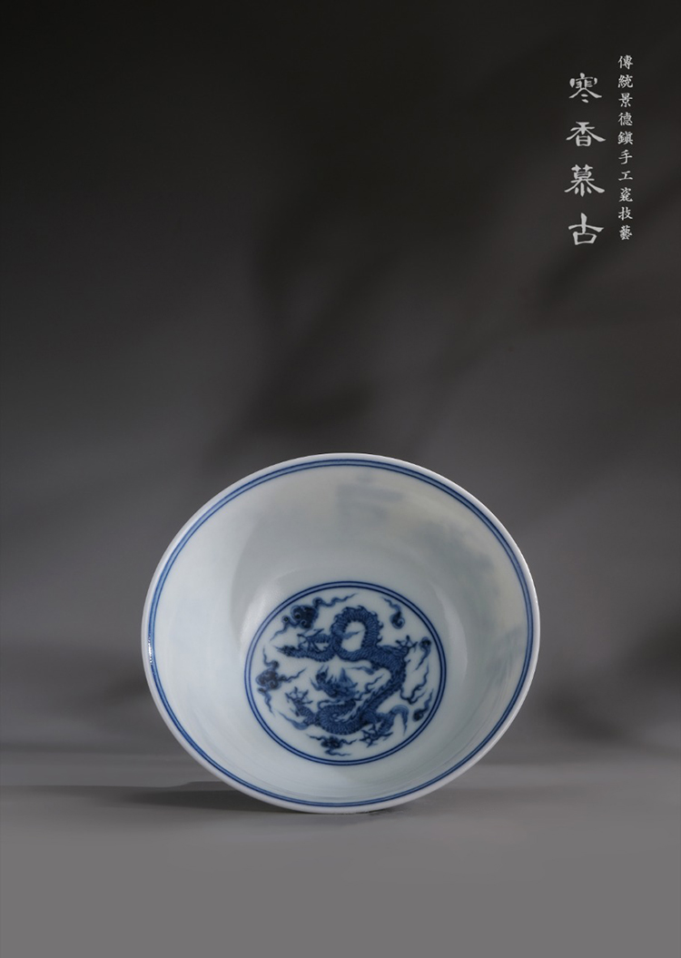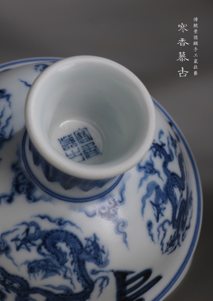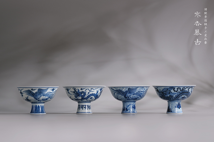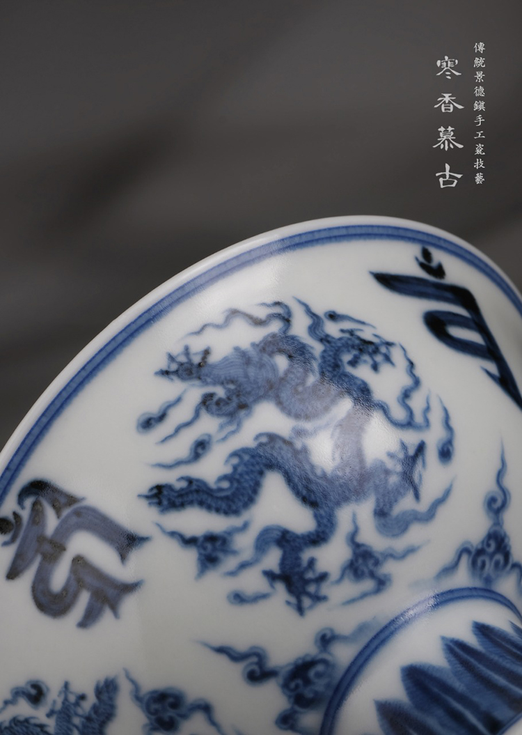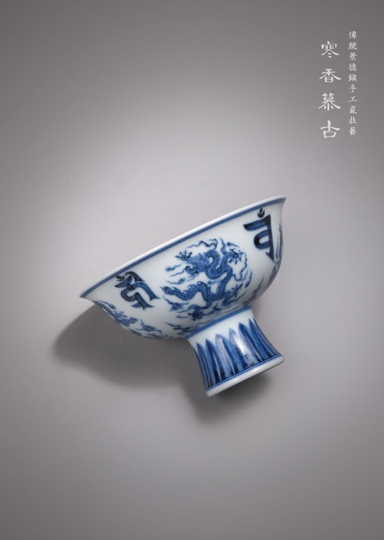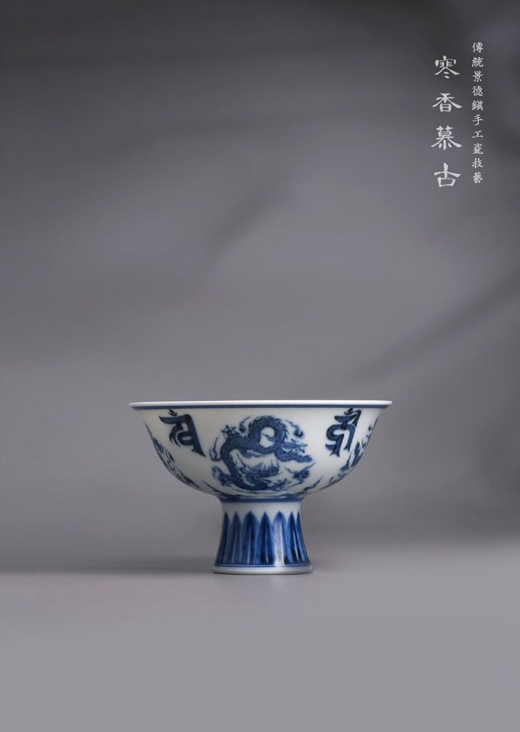 寒香慕古元明青花糯米釉团龙梵文高足杯(缺货)