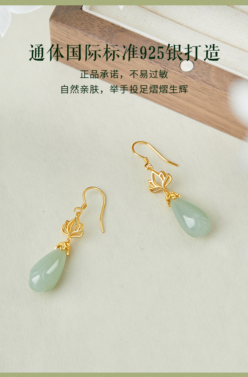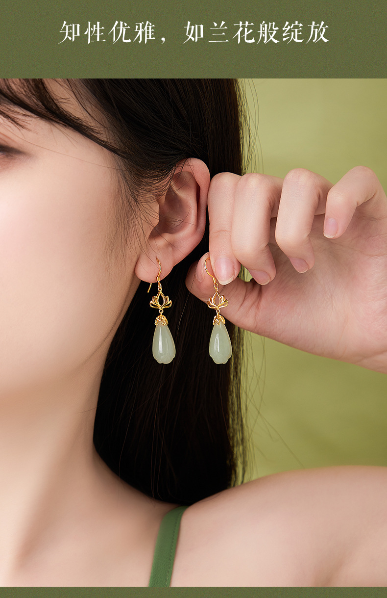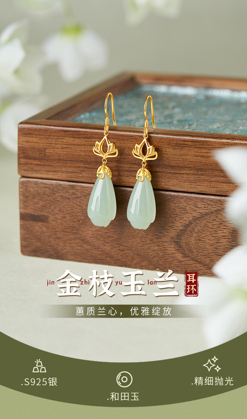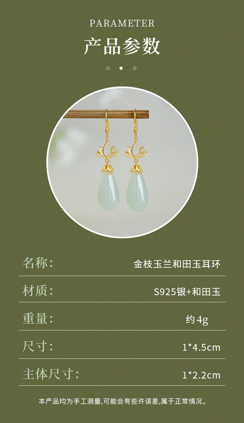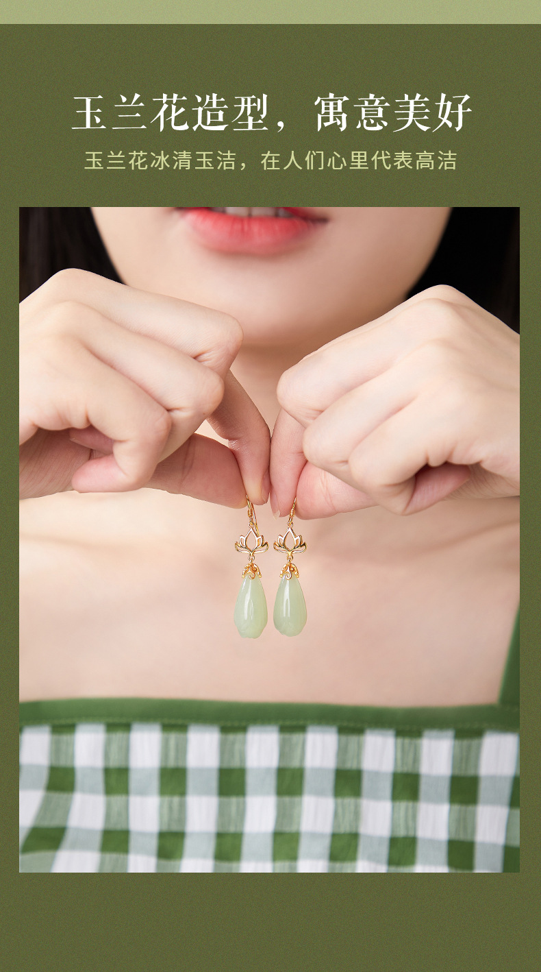 六鑫珠宝 金枝玉兰S925纯银和田玉兰花耳坠 百搭古风