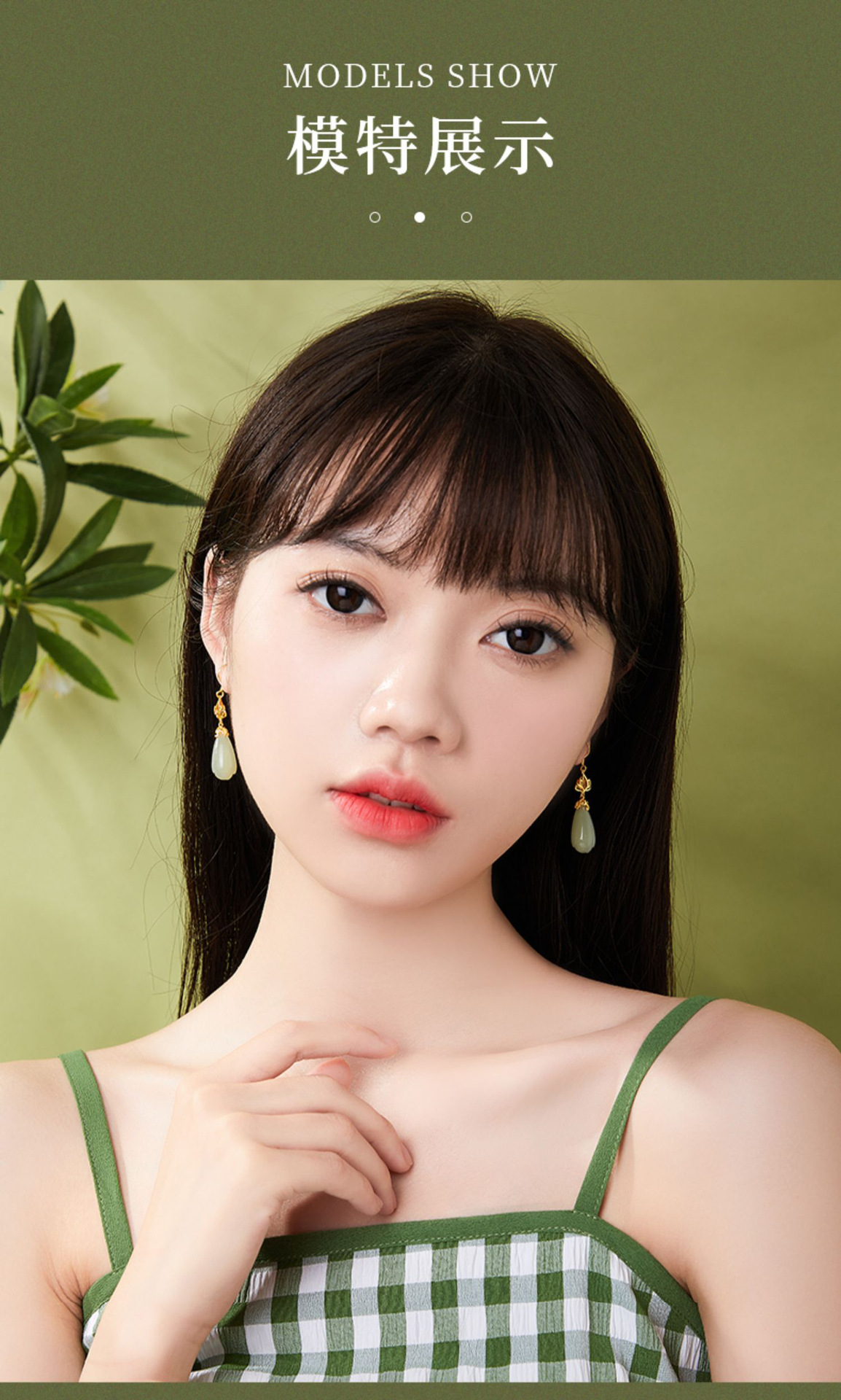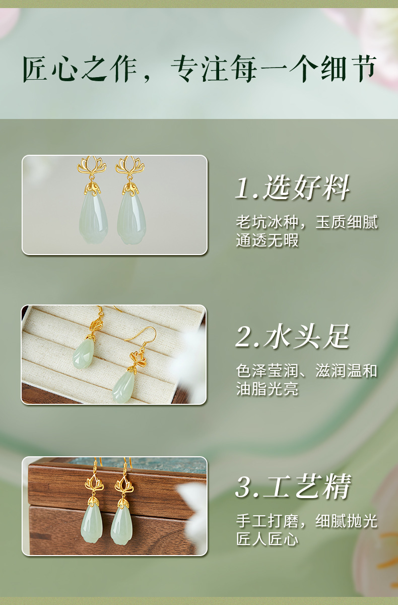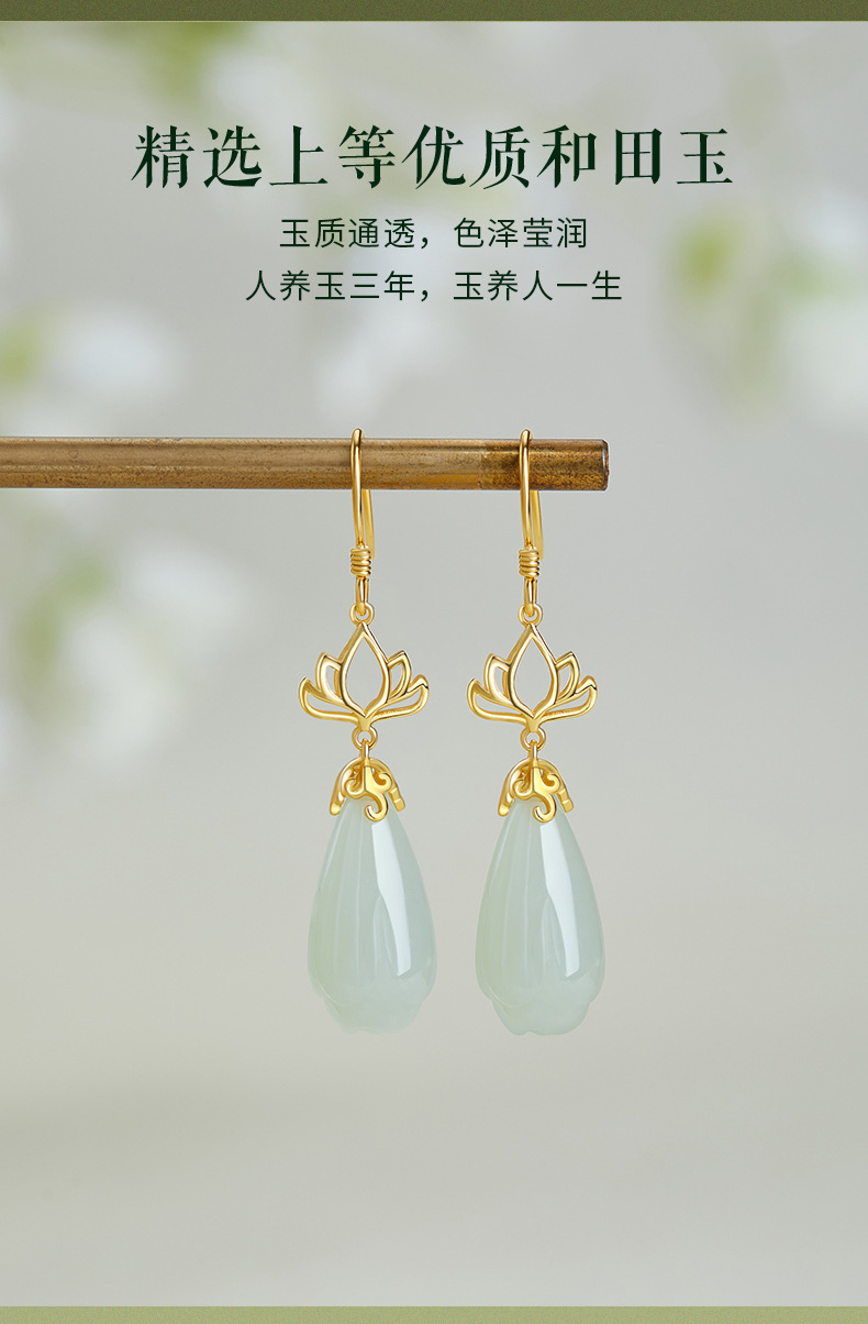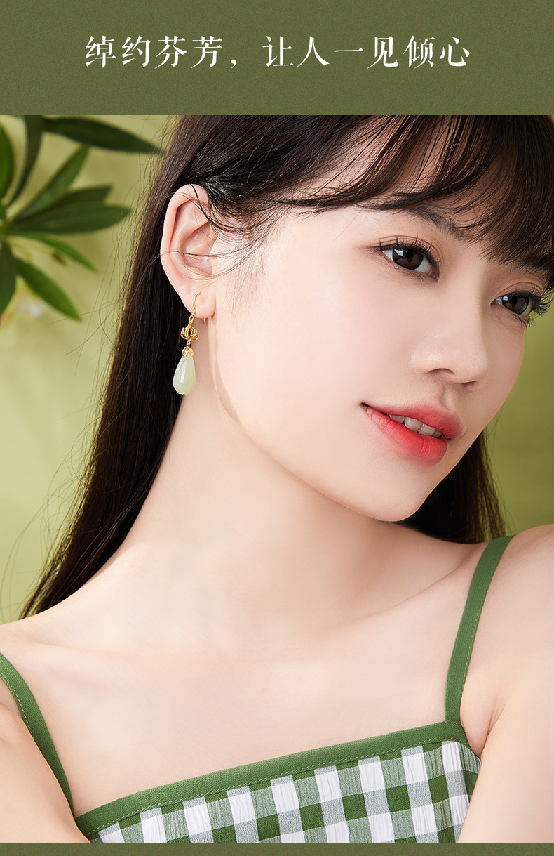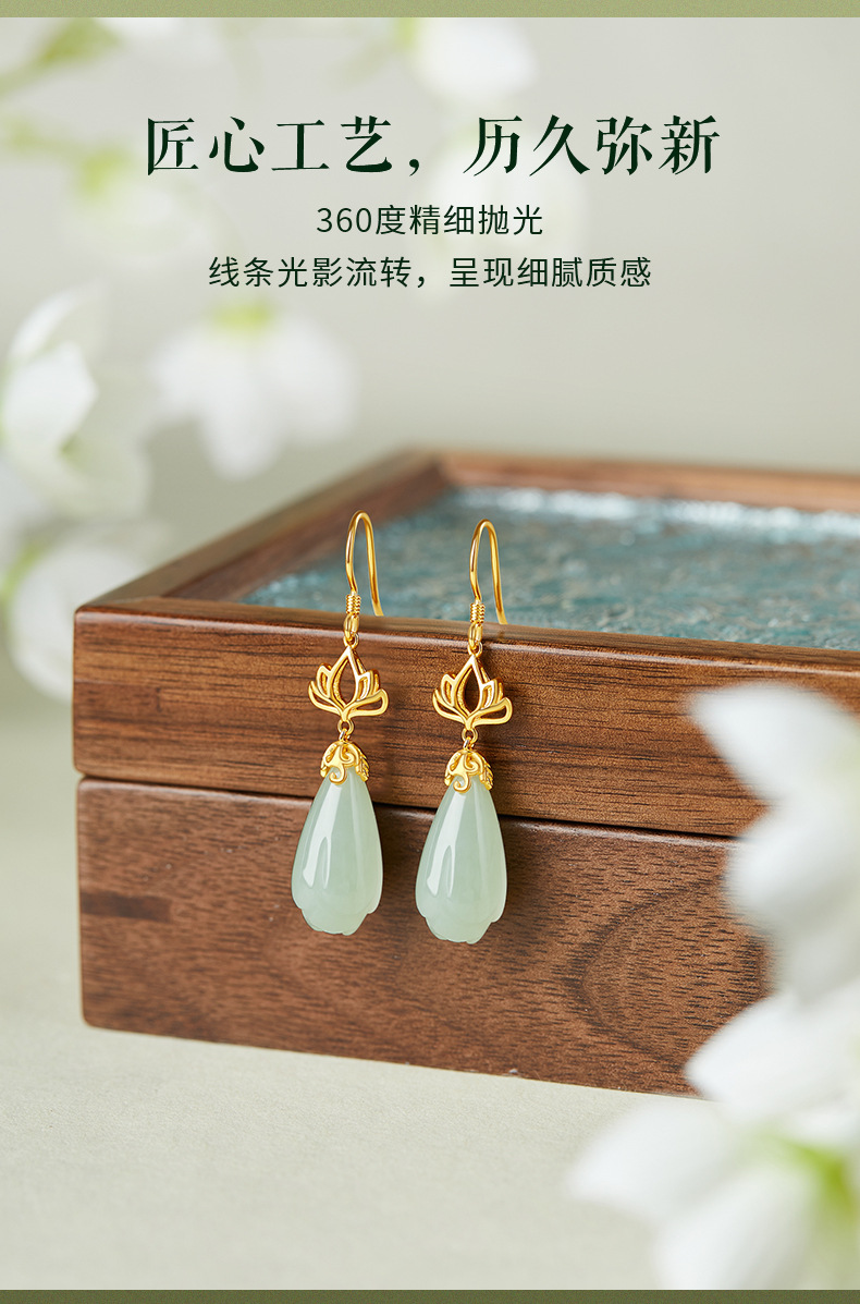 六鑫珠宝 金枝玉兰S925纯银和田玉兰花耳坠 百搭古风