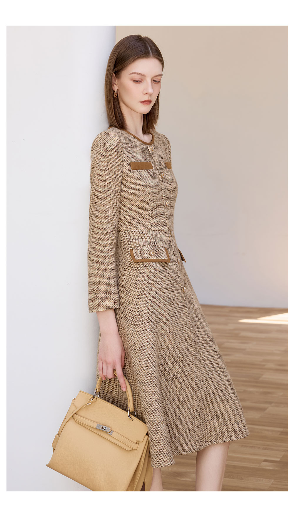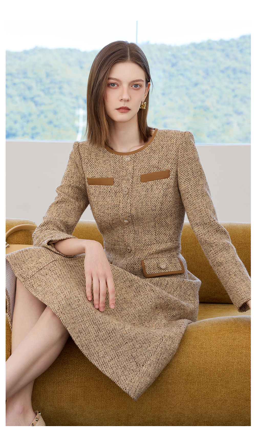 AD秋冬新款卡其色小香风连衣裙精致名媛法式粗花呢轻奢气质中长裙