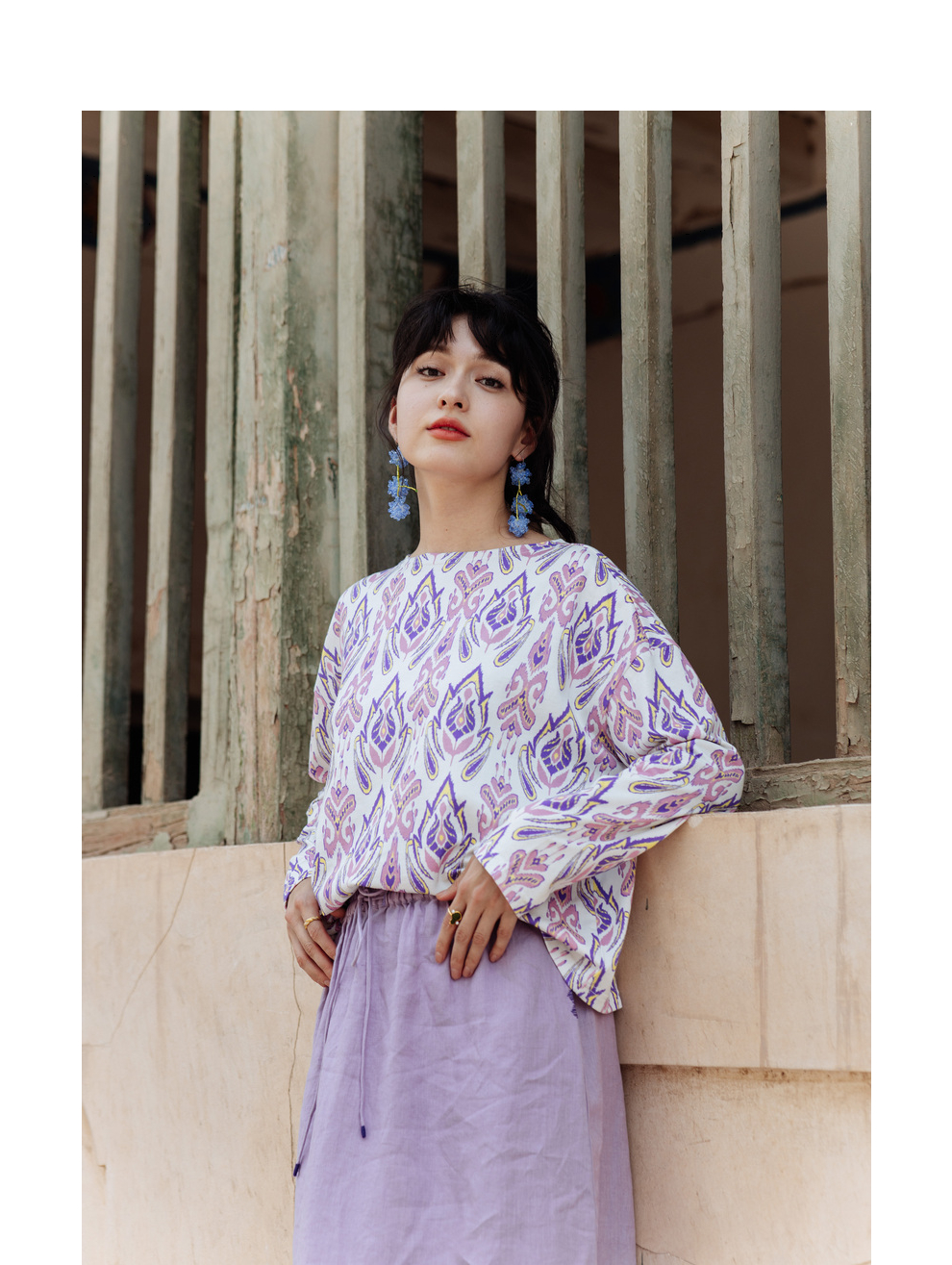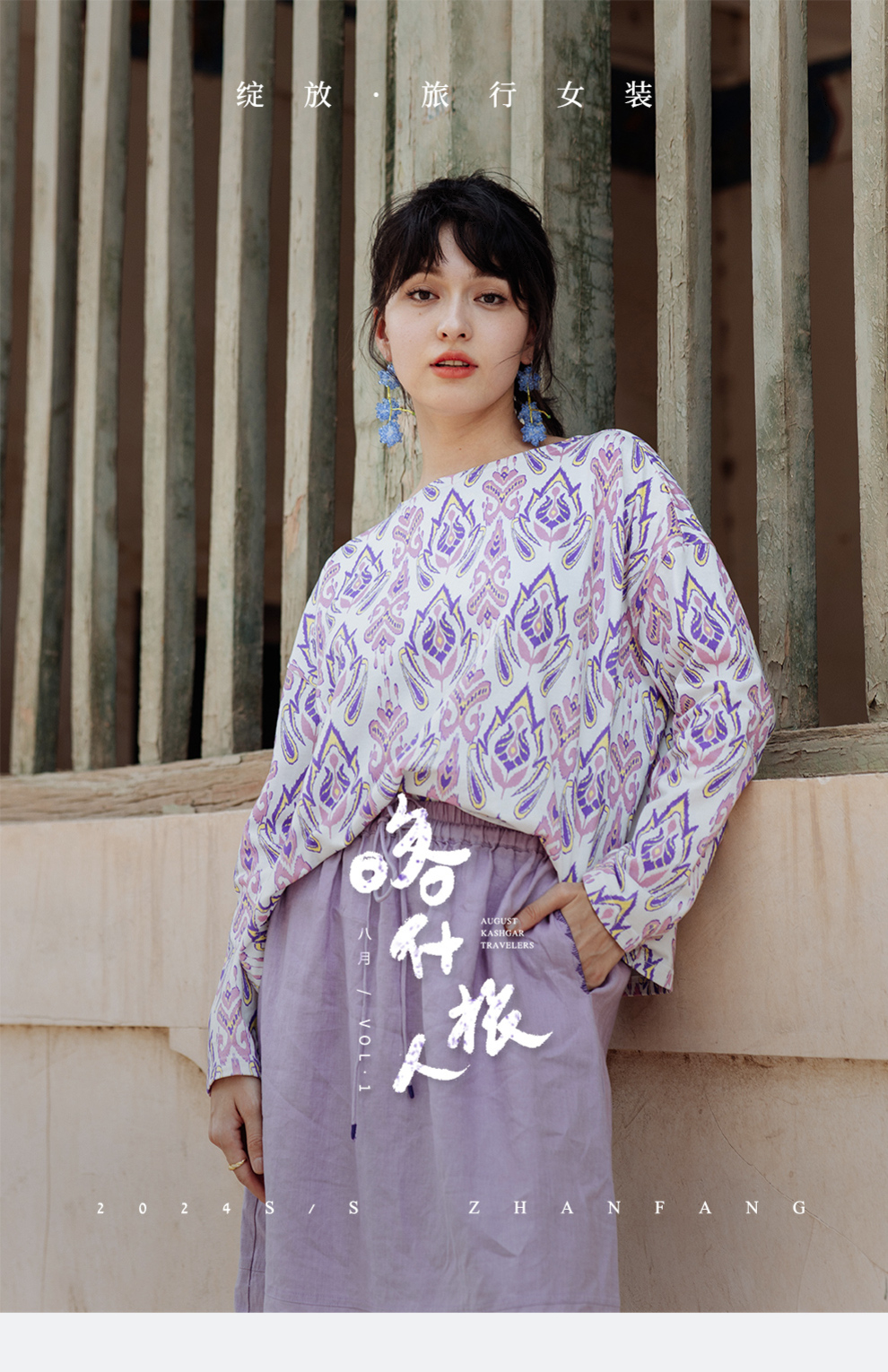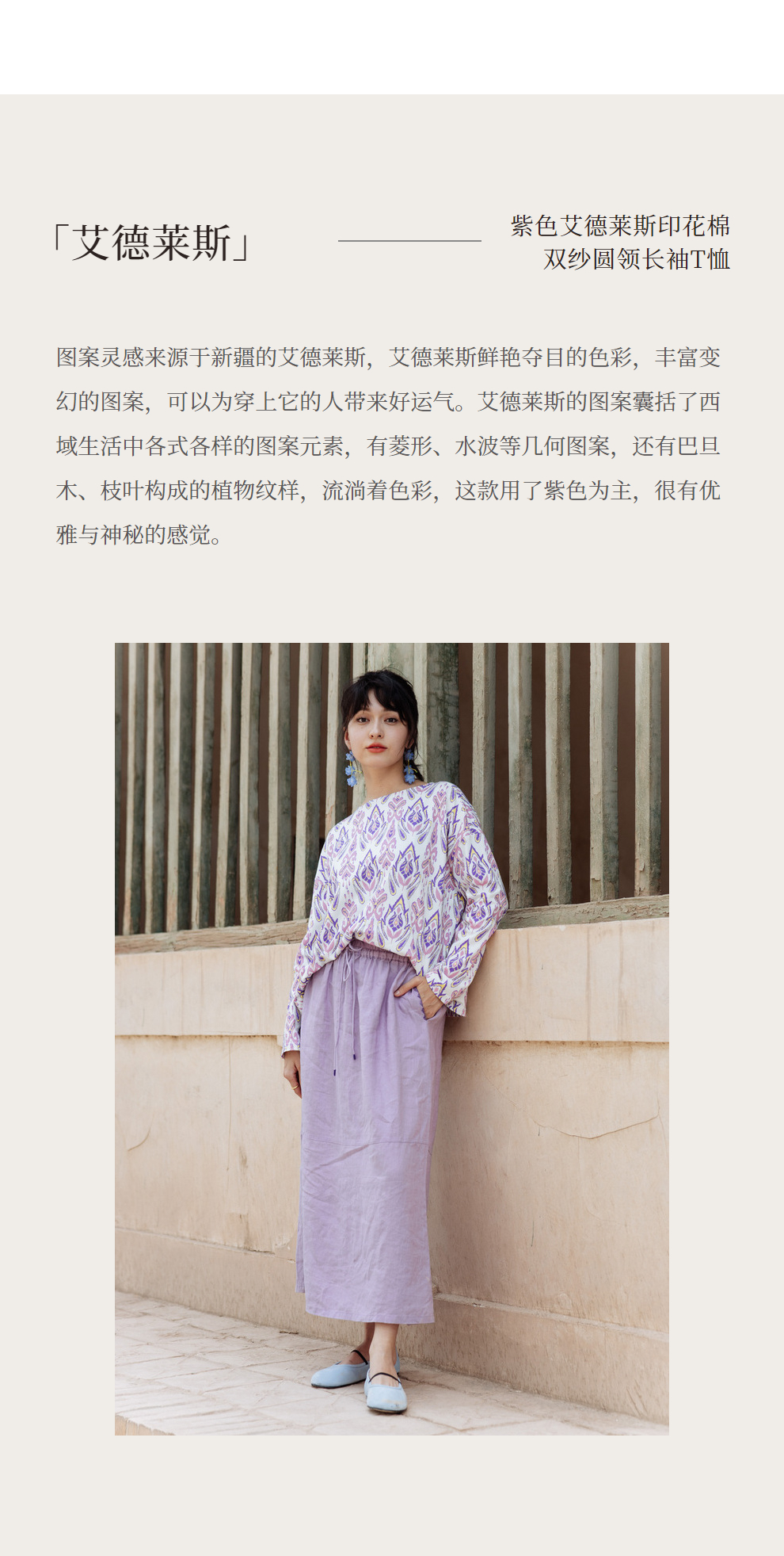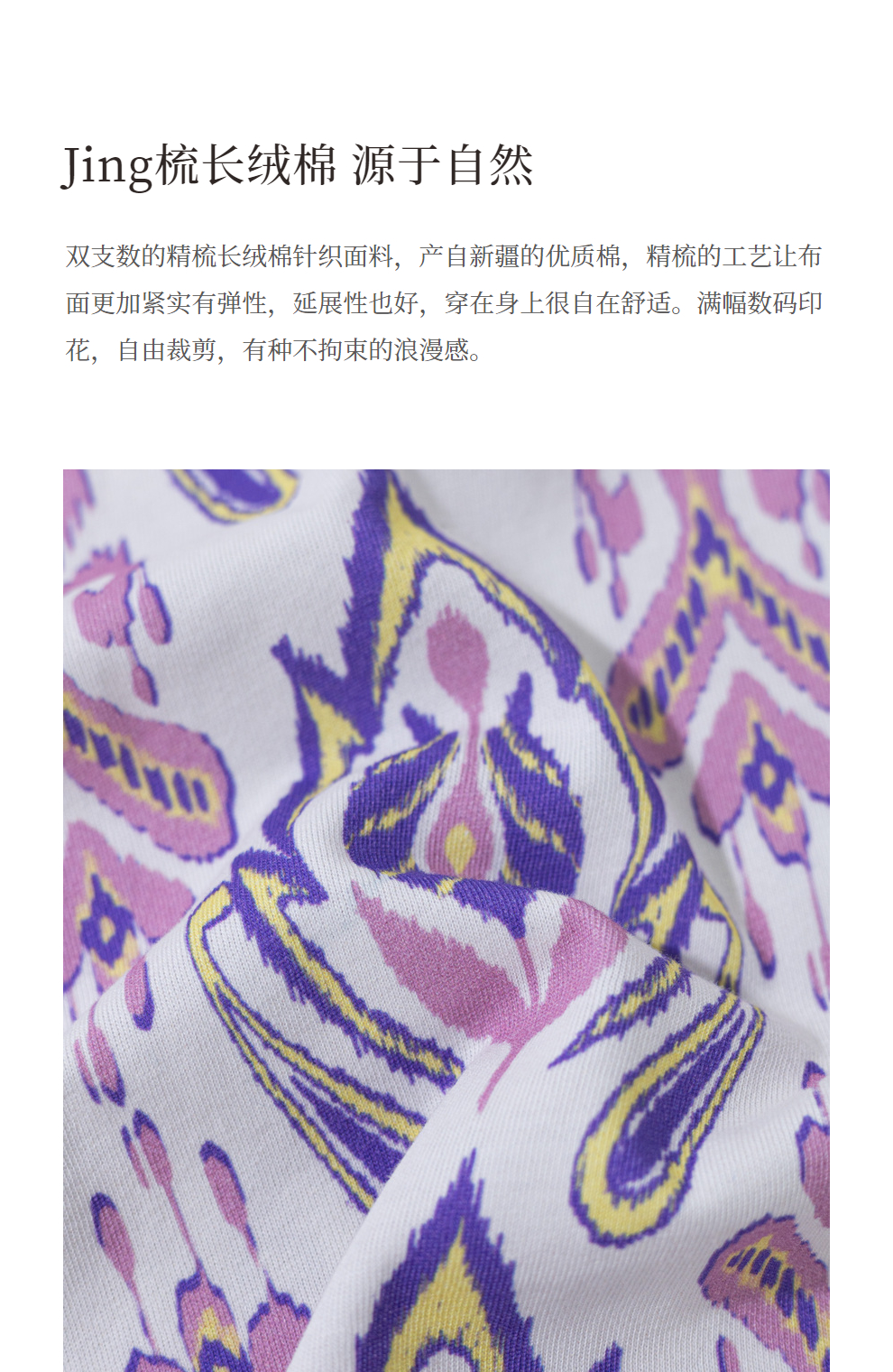 绽放旅行女装594朵/紫色艾德莱斯印花长绒棉双纱圆领直筒长袖T恤