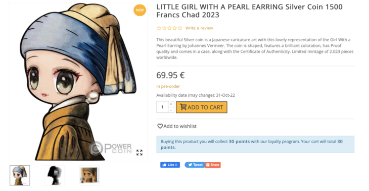 预定!2023 戴珍珠耳环的少女纪念币(10克银币) 乍得发行量2023枚