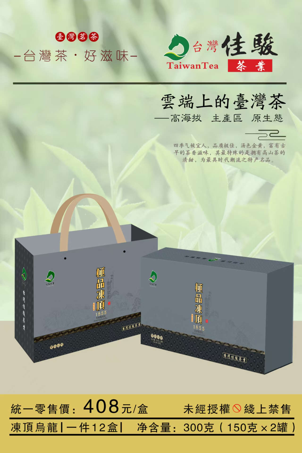 台湾极品冻顶乌龙茶,新乌龙,不是陈茶,墨绿品质,健康养生首选,图片是手机实拍,淘宝天猫基本在500-800元不到一斤规格,销量巨大,我们出货价低到让你怀疑人生,这个价格绝对是批发商几百斤起批都拿不到的价格,随便全国比价,多少懂点茶叶的朋友应该也都知道,台湾茶属于中高端茶系列价格自然不低,欢迎茶商来批发,成功的新一代台湾茶代表作,产于终年云雾缭绕600-800海拔,除延续一般茶叶的意知味台湾茗茶,台湾乌龙茶一直以香水闻名,这款礼品装礼品冻顶乌龙,保证原产地,保证台湾进口原装,保证原箱原封,进出口贸易关单,检验检疫报告!
