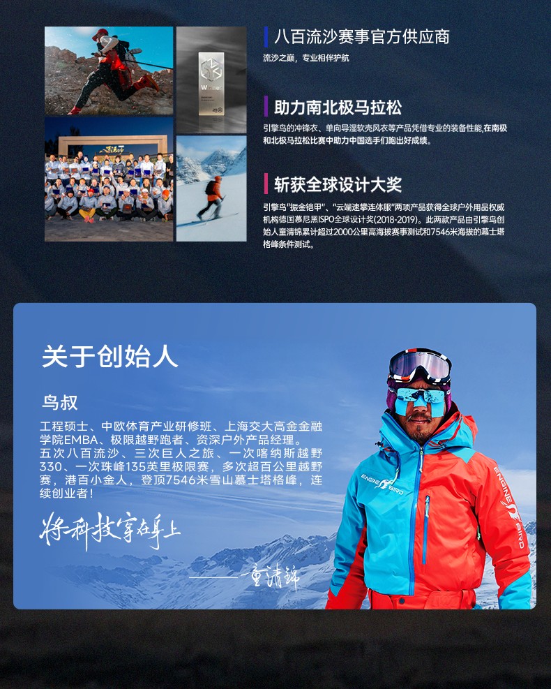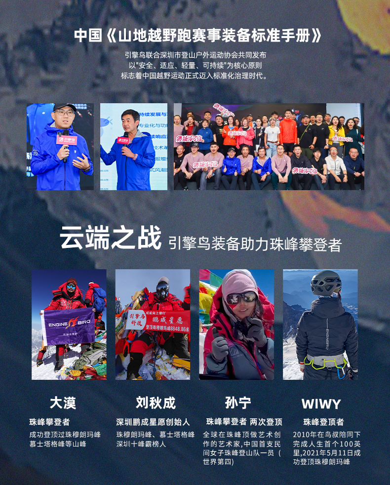 - 始创于2012年,引擎鸟户外(深圳)有限公司旗下的中国原创专业跑步服装品牌,以国际一线专业标准设计、研发、生 面世以来,引擎鸟不断追求产品的轻量化革命和特种运动的专业性,持续推出符合运动科学和大众需求
