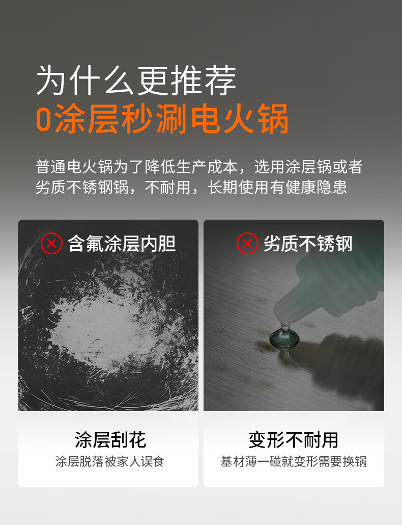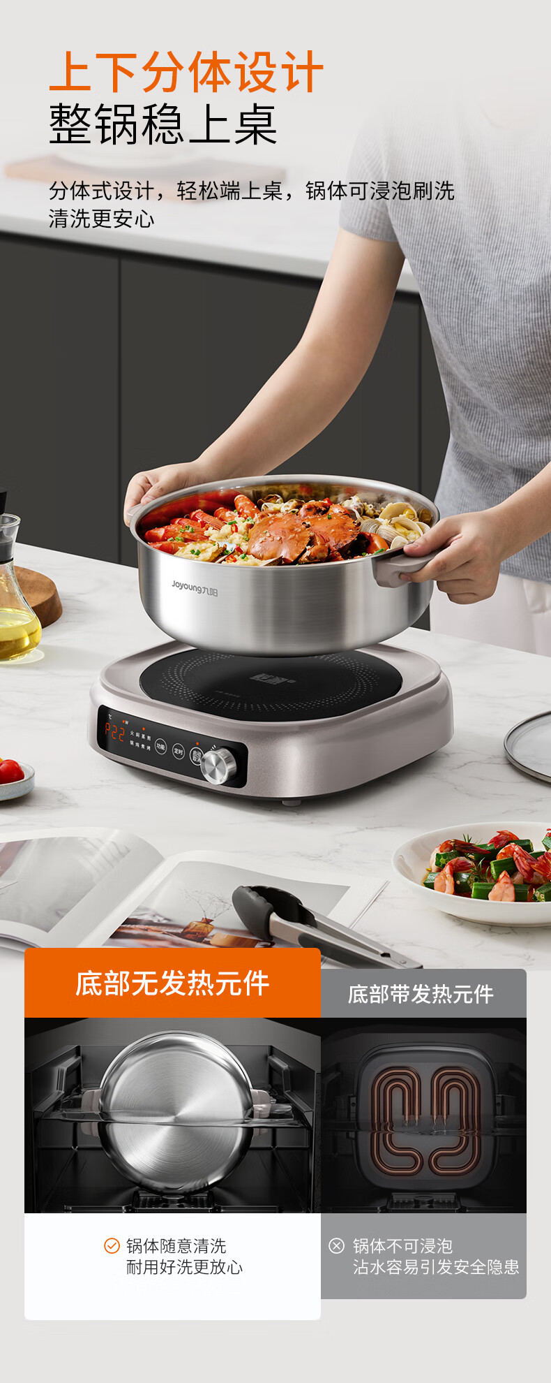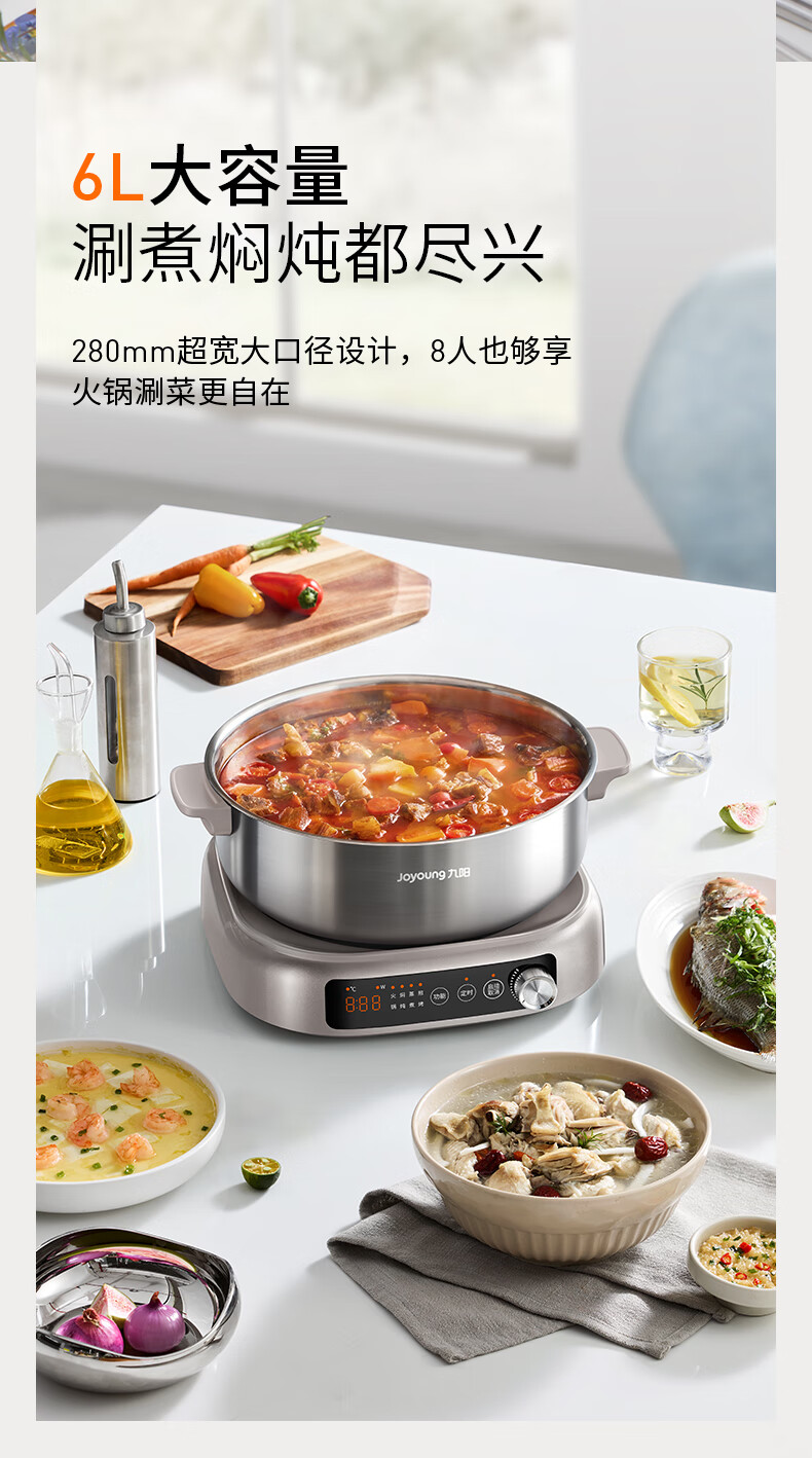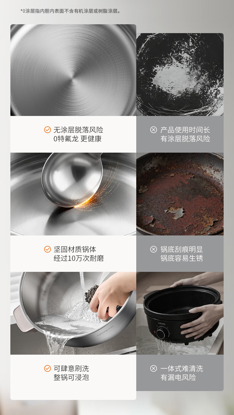九阳电火锅0涂层IH秒涮6L分体式不锈钢可拆洗多功能电煮锅电热锅