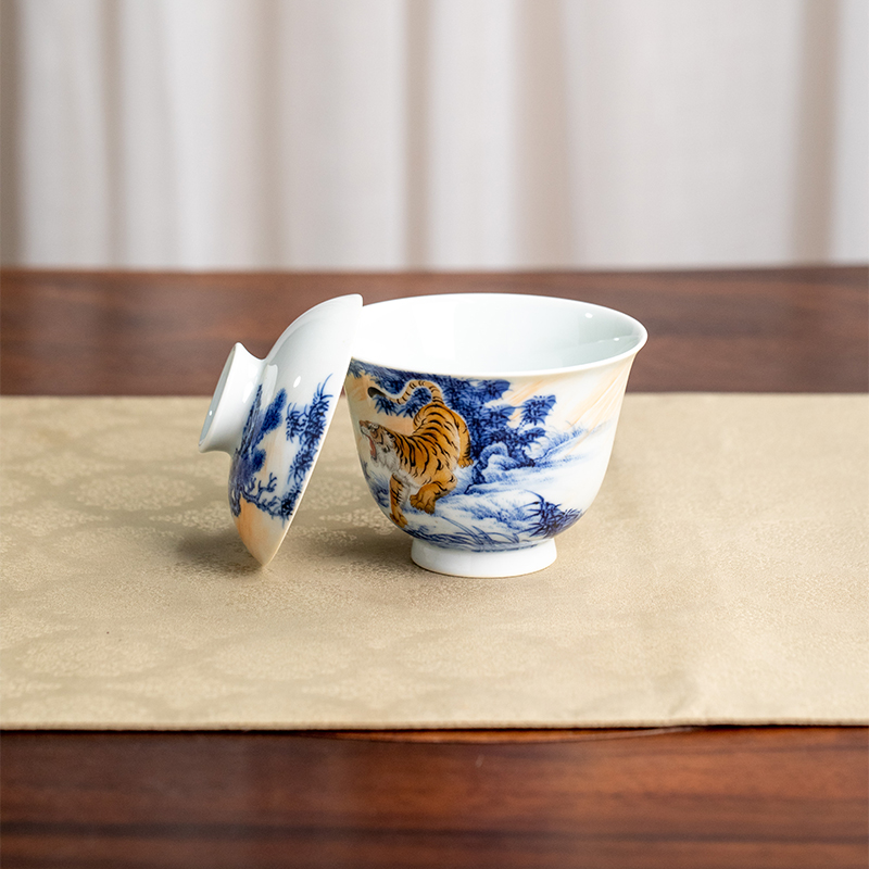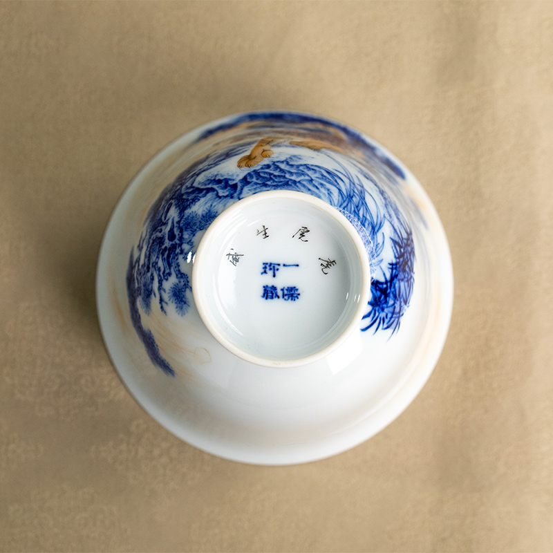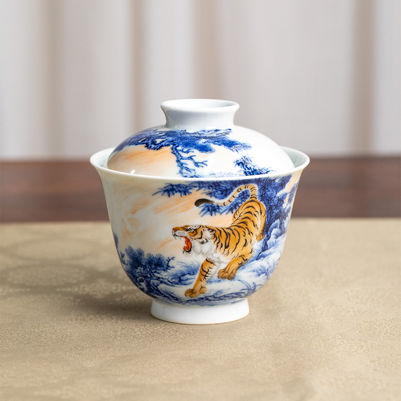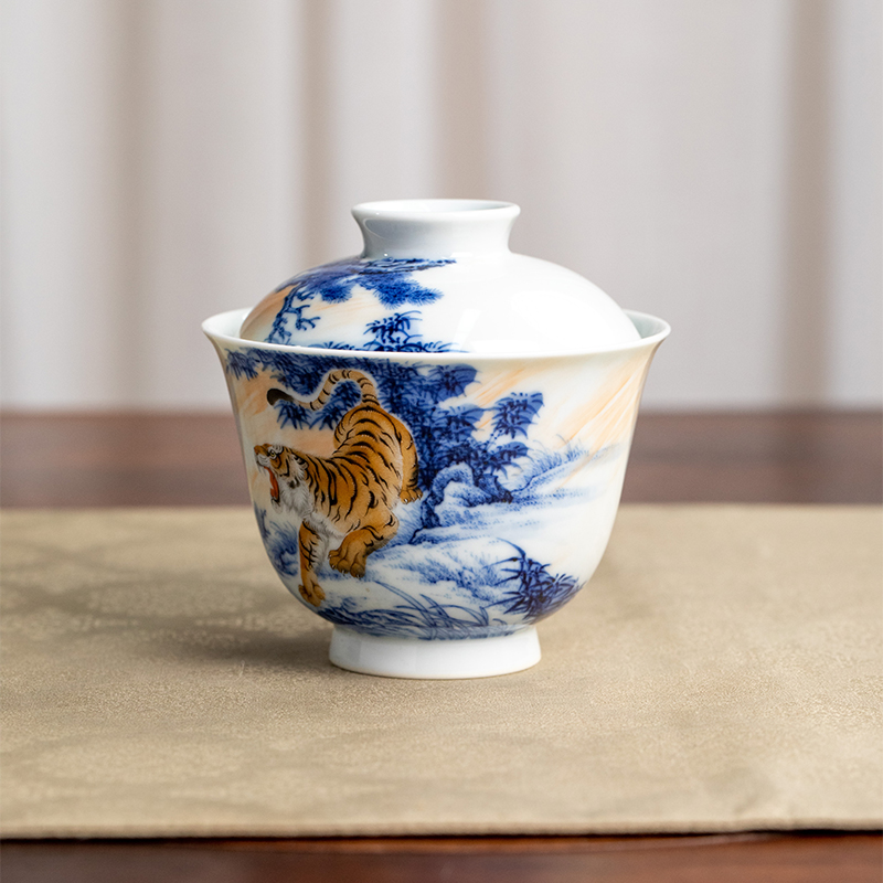 一儒堂青花加彩老虎盖碗