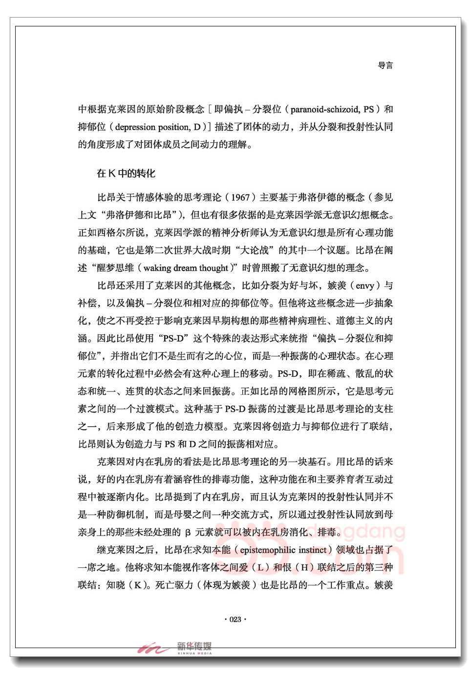 本书的第二部分将涉及后期的比昂,那时他仍然依赖克莱因,但引入了一种全新的方法,聚焦于体验水平上的在O中的转化,从而促使新的体验从基本的不知状态中萌生,而不再受理解和推论的约束。克莱因的不同之处是,她特别强调对内容的理解和解释。透过克莱因的描绘,内在世界看起来熙熙攘攘,仿佛一个剧院中挤满了彼此影响的整体客体和部分客体(梅尔泽称其为;小矮人们)。比昂则处处留白,充满了未知和不确定。如果将弗洛伊德的模型比作机械物理的驱力、动力和阻力,那么克莱因的模型则是有正负之分的电气科学,而比昂的模型则类似于近代物理学,有着广阔的空间和不确定的原则。