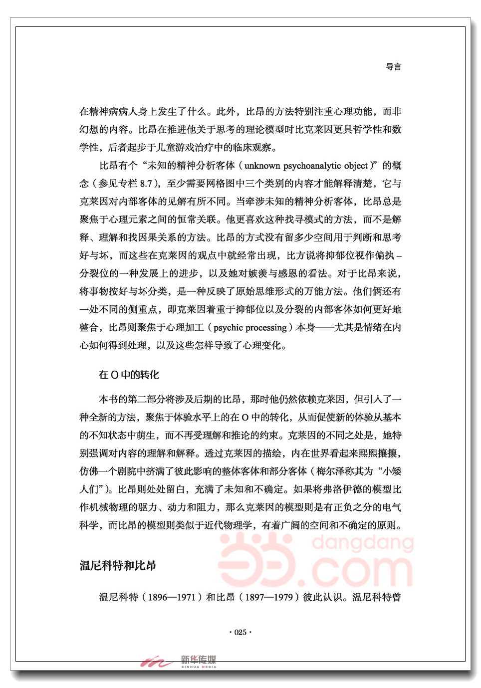 作者鲁迪弗莫特按时间顺序将比昂的生平与作品分为两部分:转韵之前和转韵之后。转韵之前,比昂关注情感体验的加工,他称之为在知晓中的转化,或在K 中的转化;转韵之后,比昂转向对非表征层面的转化,即在O中的转化。在每一部分,弗莫特都首先阐述了比昂在对应阶段的人生经历,然后梳理并介绍了比昂在此阶段的重要作品与思想,以及比昂提出的大量极具想象力的概念。为了方便读者深入理解比昂思想的形成与转变,作者用专栏的形式补充了对比昂产生了影响的故事、人物、哲学观等。