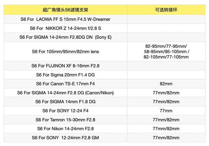 大家如果已经拥有S6支架,也可以增加选购不同适配的后接盘进行通用转接。针对类似105、95和82这样镜头体系,也可以通过购买后接圈+转接环进行更多镜头的适配使用。