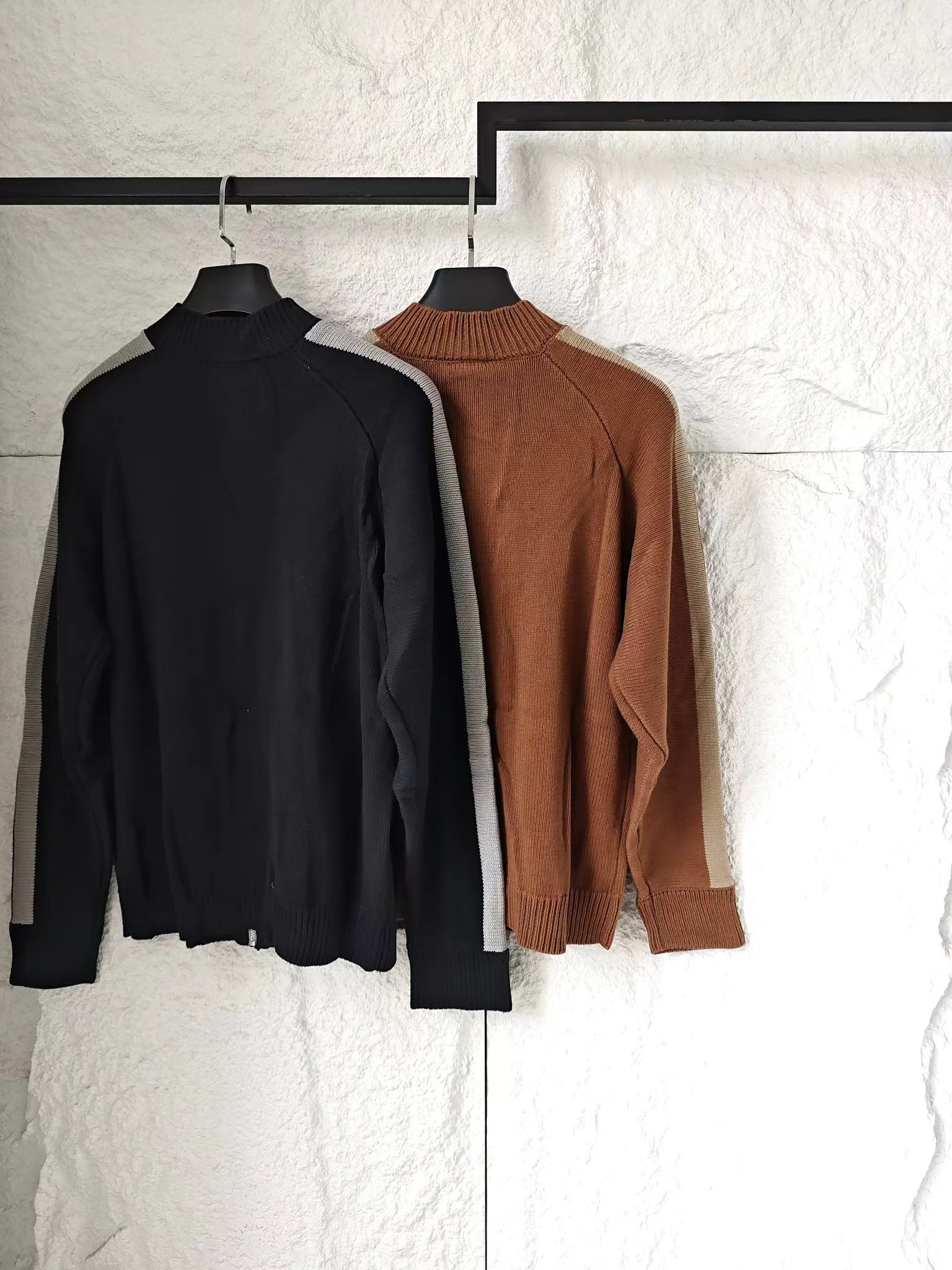 拉链立领针织版型:金属拉链顺滑开合,立领设计利落防风,拉合打造干练高领造型,拉开又能营造随性V领效果,一衣多穿适配不同风格;针织面料软糯亲肤,保暖性与透气性兼具。