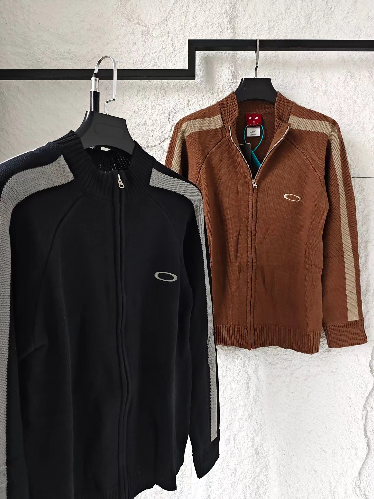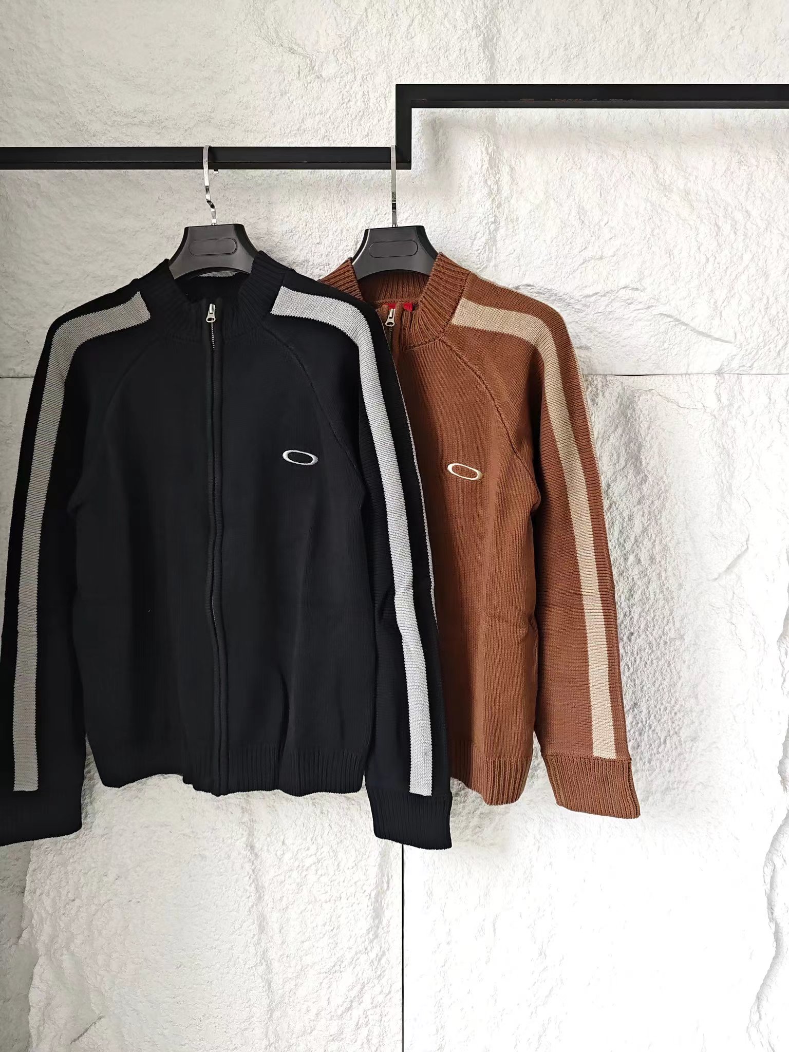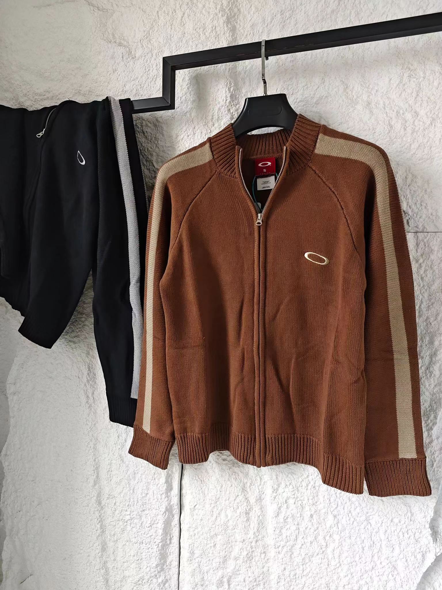 刺绣标识古着色织拼接拉链针织毛衣外套 男女同款复古机能风拉满!欧克利针织外套重磅登场将复古街头风格与机能针织工艺融合,撞色拼接设计打造视觉焦点,是秋冬打造个性穿搭的潮牌尖货!