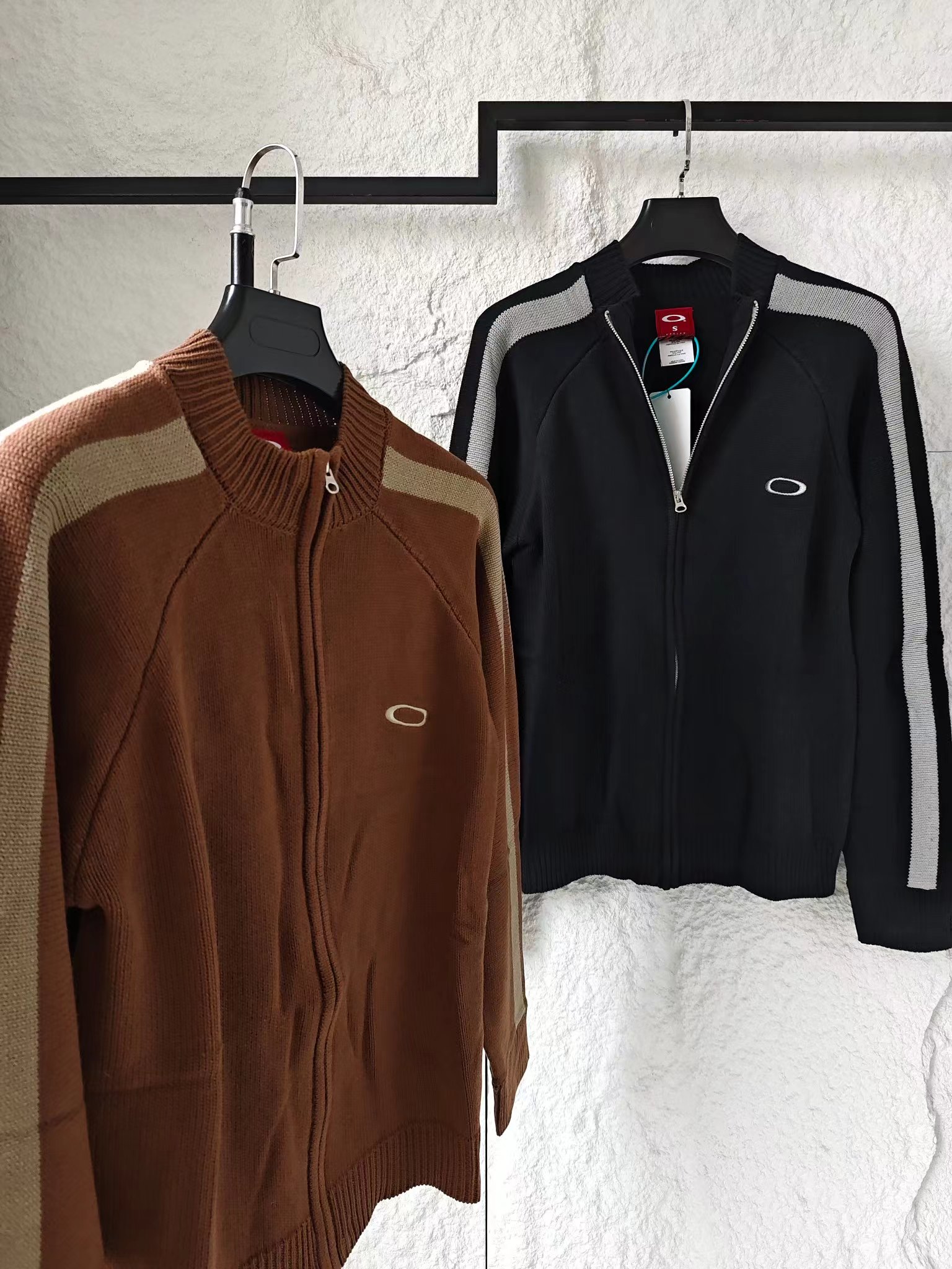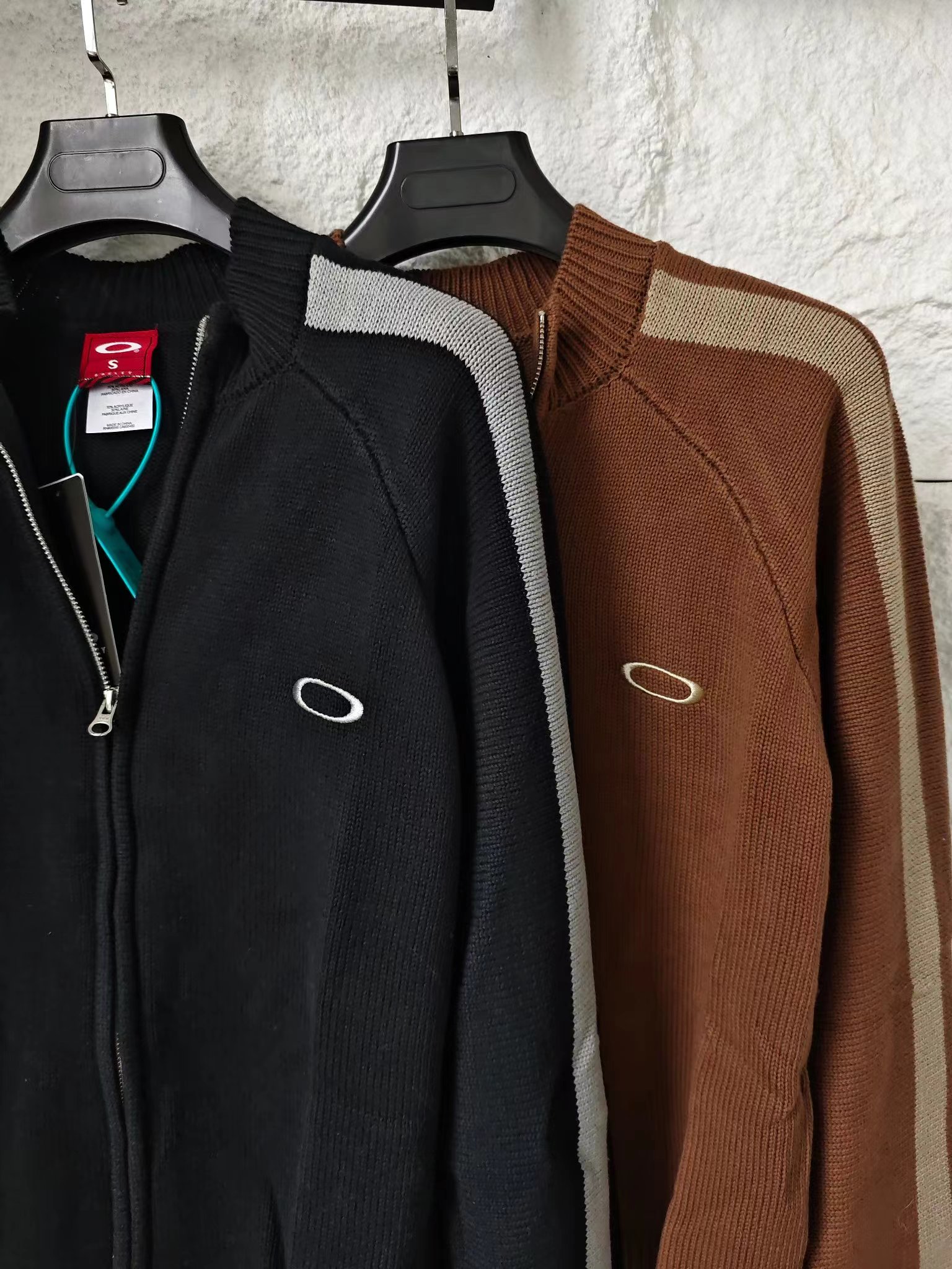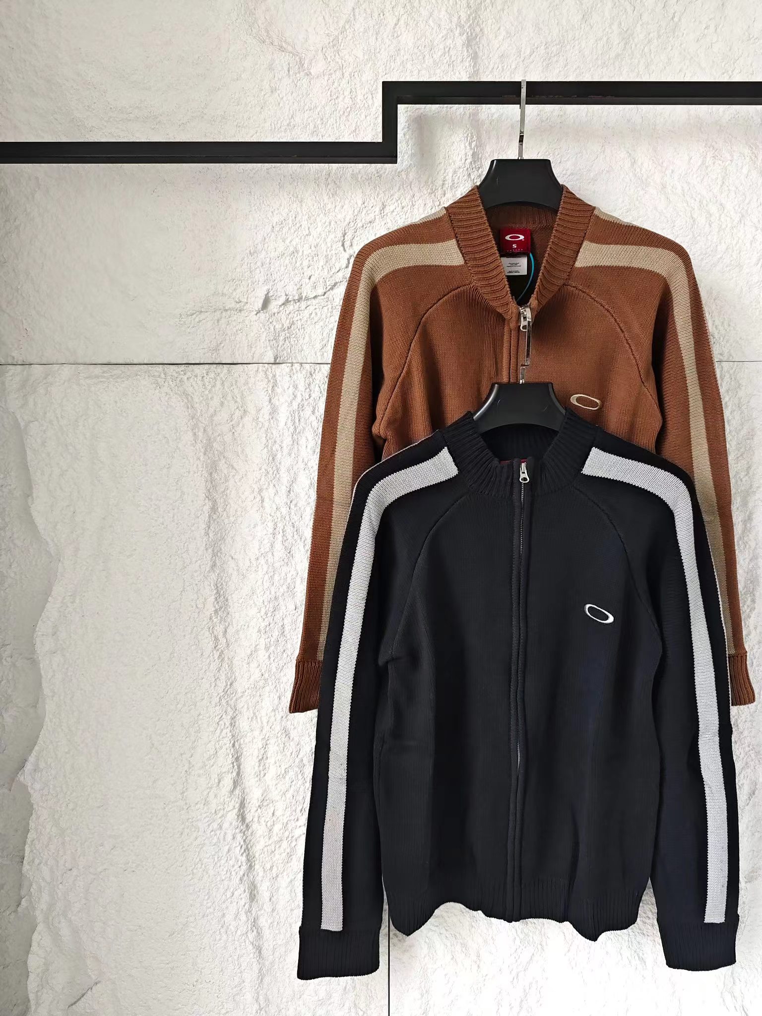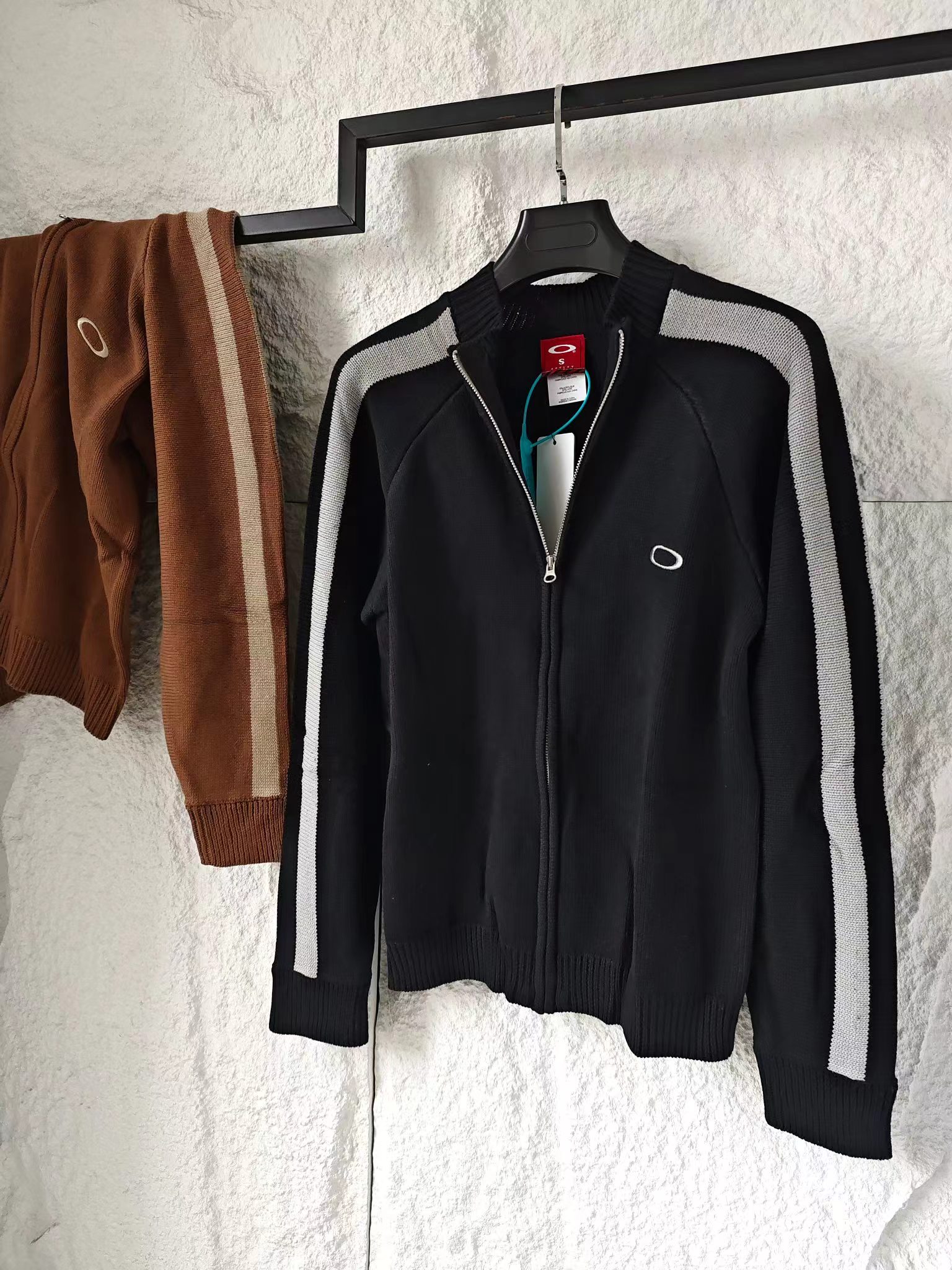 刺绣标识古着色织拼接拉链针织毛衣外套 男女同款复古机能风拉满!欧克利针织外套重磅登场将复古街头风格与机能针织工艺融合,撞色拼接设计打造视觉焦点,是秋冬打造个性穿搭的潮牌尖货!