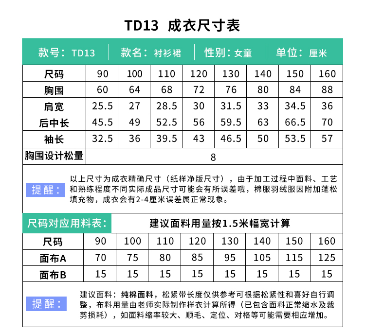 裁缝学苑 TD13儿童衬衫连衣裙1:1实物服装纸样剪裁图纸牛皮纸样