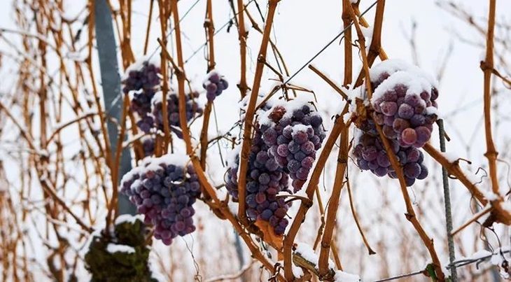 与贵腐酿造无二,成熟的葡萄不可避免需要经历虫害/霉腐/鸟类啄食等风险,真正能留存下来的果实糖分更高、风味浓郁。而当酒园内温度降至-8℃且持续两周以上时,这些完全冰透的葡萄将在夜间进行人工手采,之后在冷藏室中破壁压碎,再发酵成冰酒。