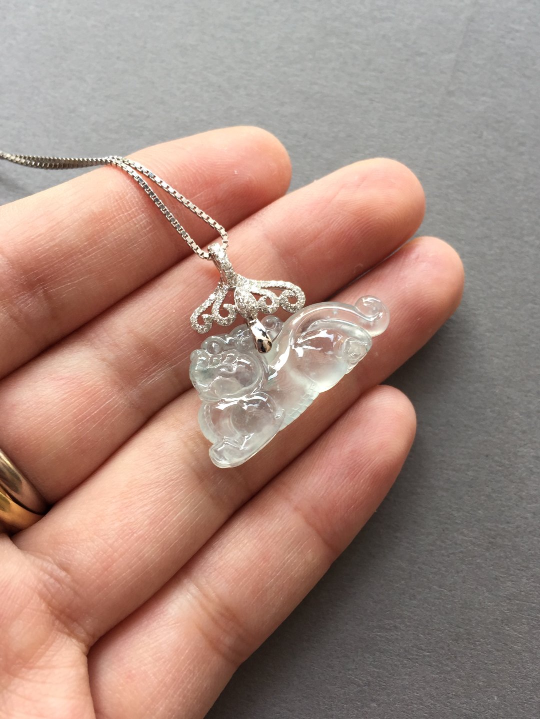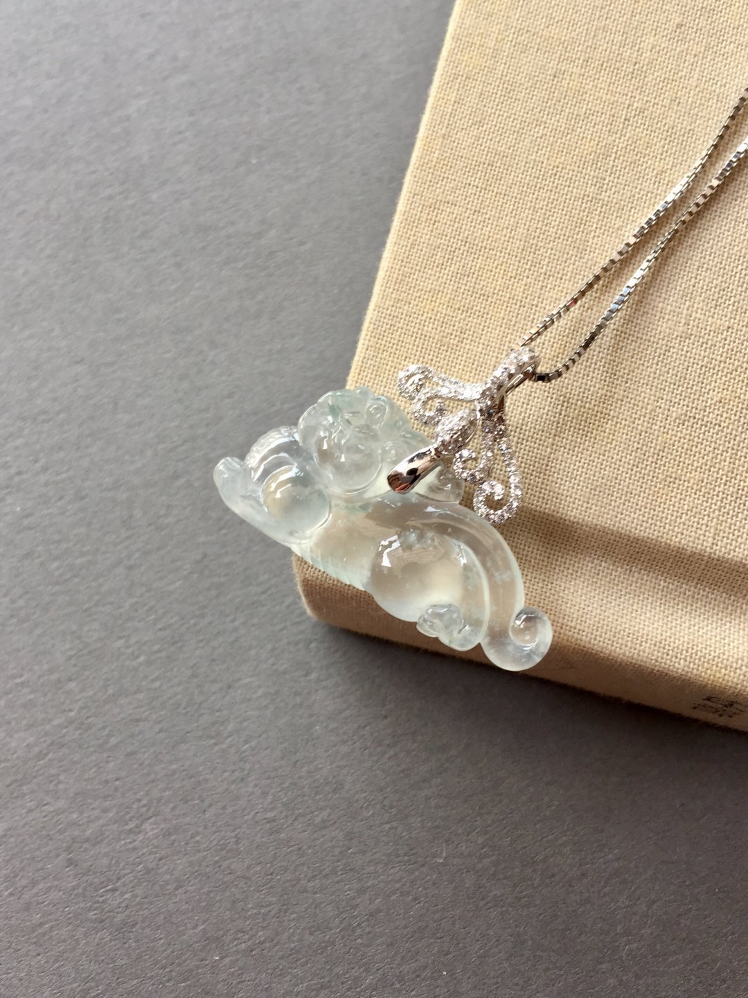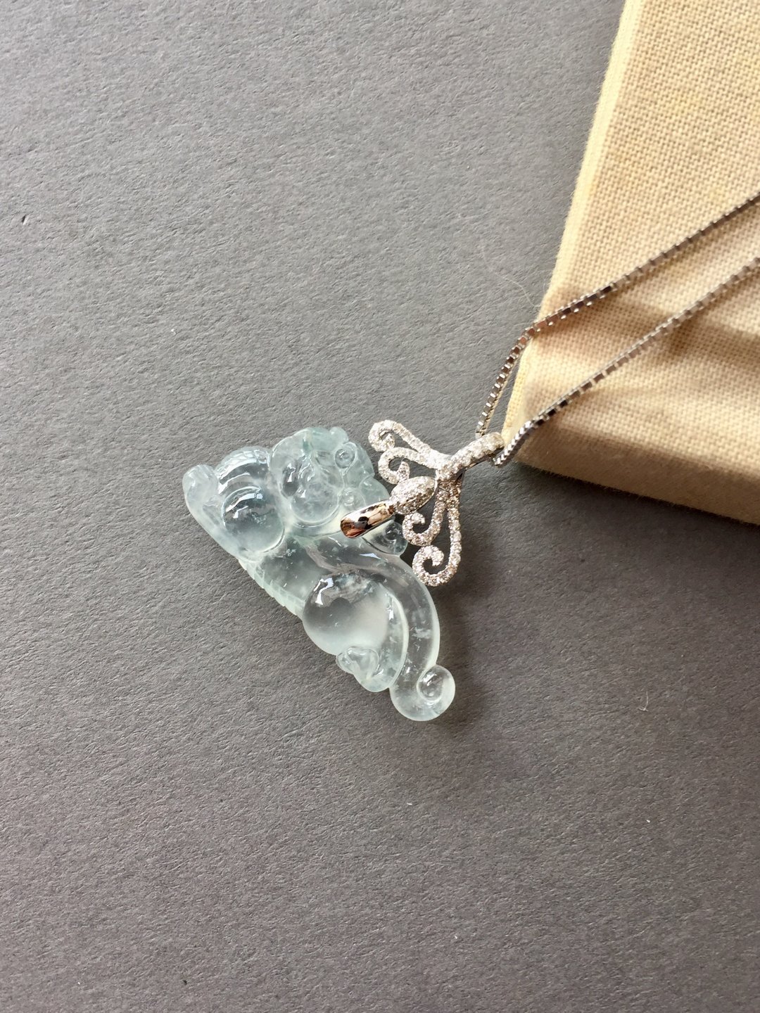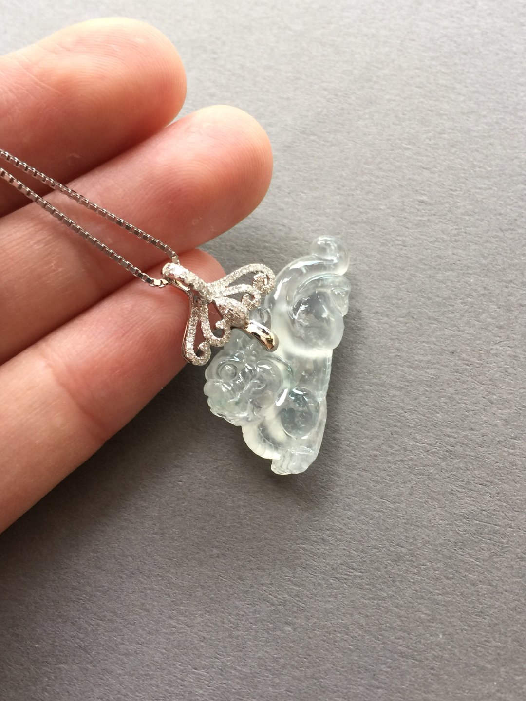 太漂亮了,翡翠玻璃种貔貅,30×14.8×6.6mm,镶嵌后24×31×6.6mm。设计师款,18k白金钻石镶嵌,这样的款式没见过吧,玻璃种貔貅荧光四射,寒气逼人。白金的运用更凸显纯美质感。扣头是一个个浪花的汇聚,水是财运,财富的汇聚。古典和时尚相结合,招财进宝,推荐