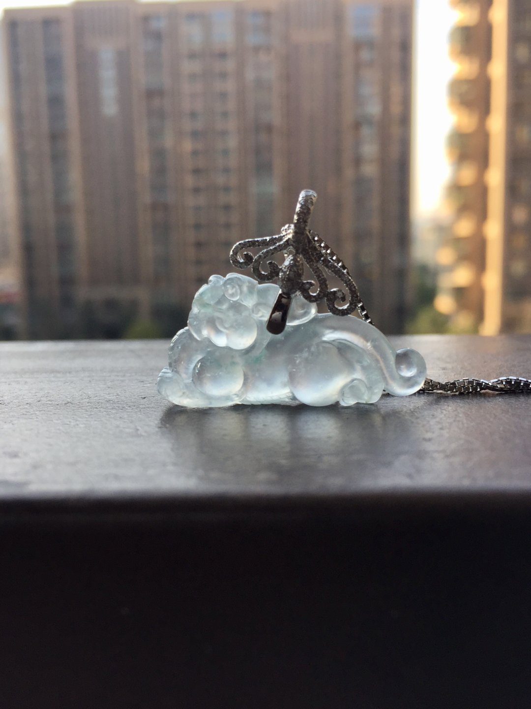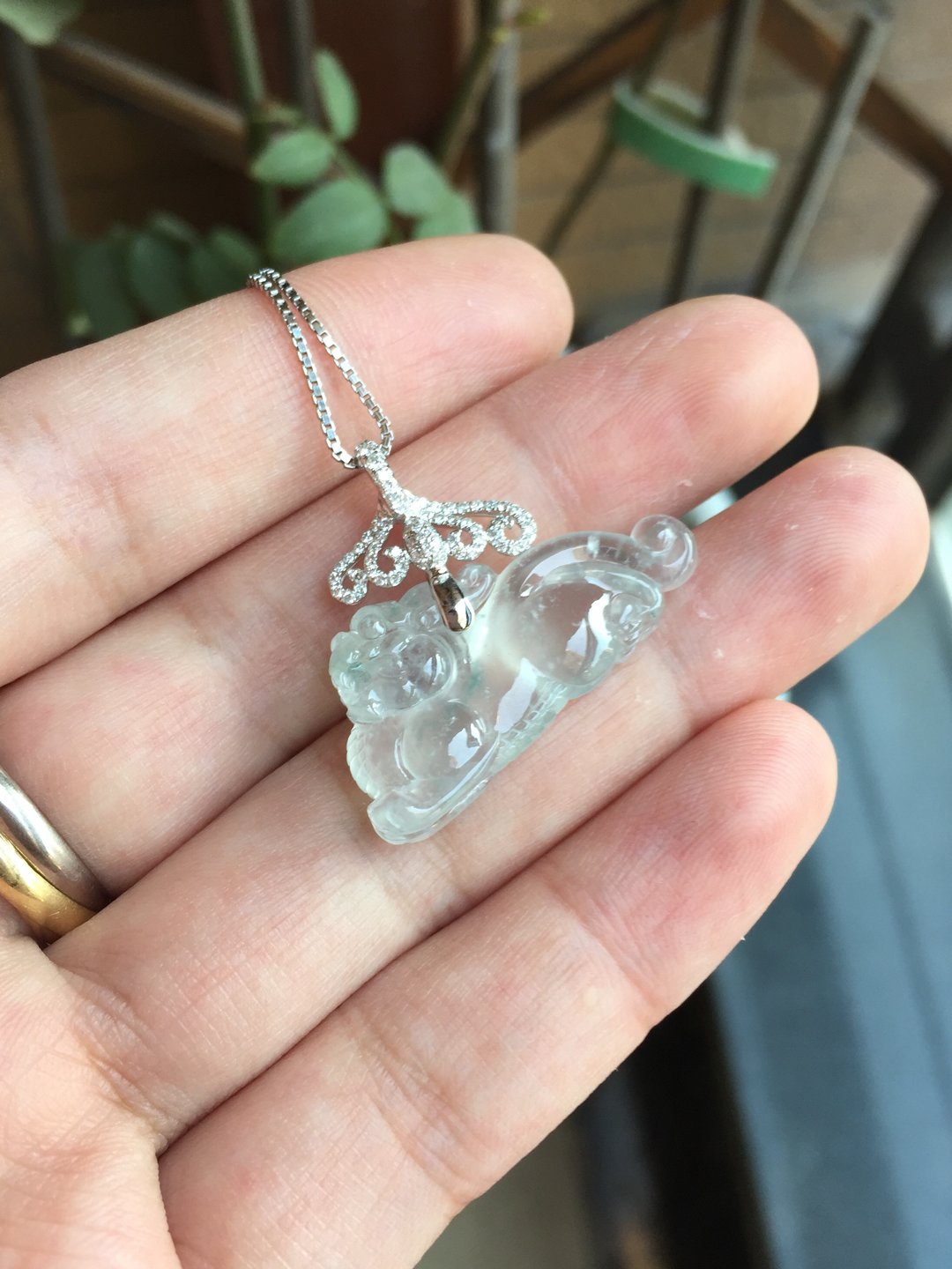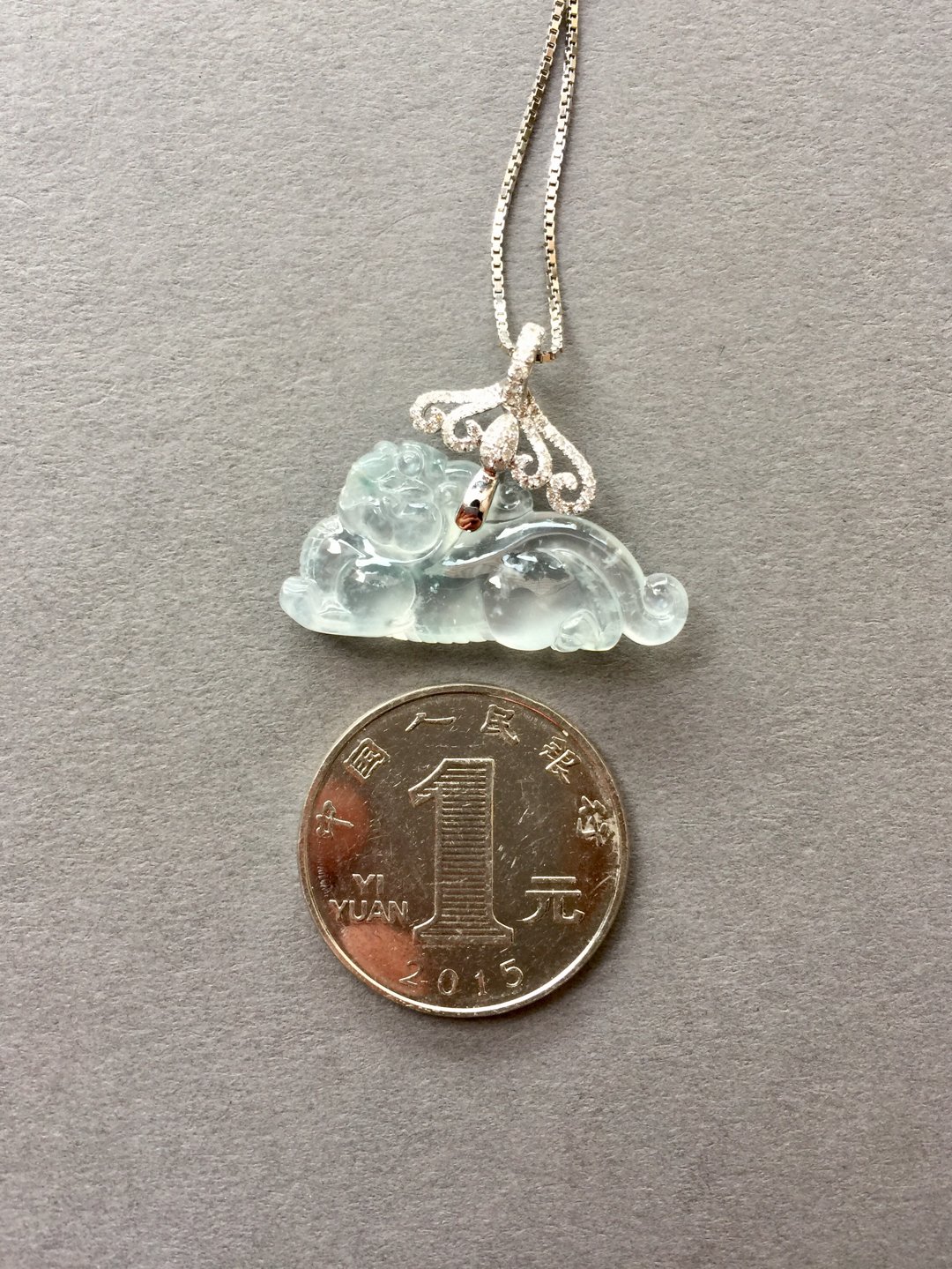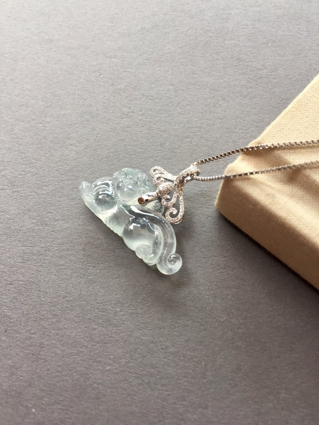 太漂亮了,翡翠玻璃种貔貅,30×14.8×6.6mm,镶嵌后24×31×6.6mm。设计师款,18k白金钻石镶嵌,这样的款式没见过吧,玻璃种貔貅荧光四射,寒气逼人。白金的运用更凸显纯美质感。扣头是一个个浪花的汇聚,水是财运,财富的汇聚。古典和时尚相结合,招财进宝,推荐