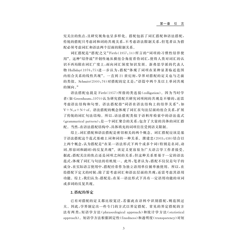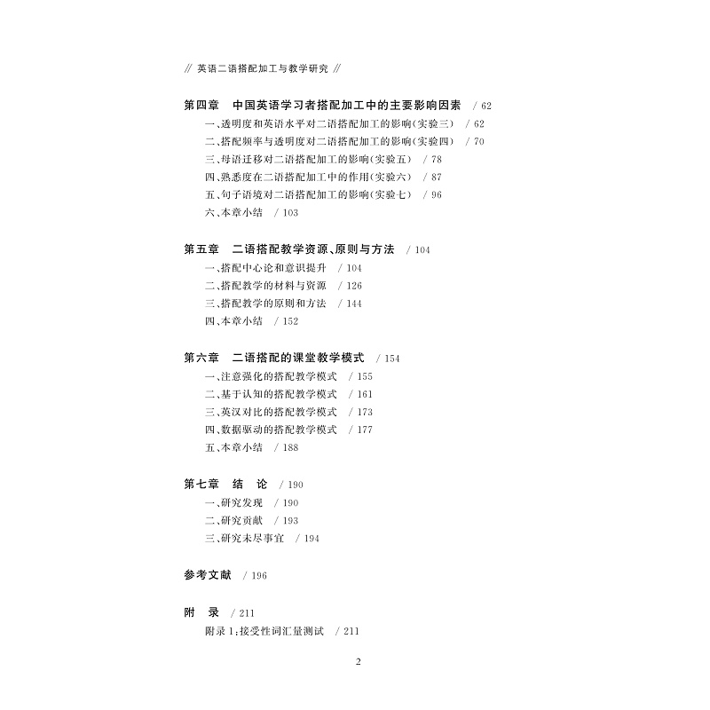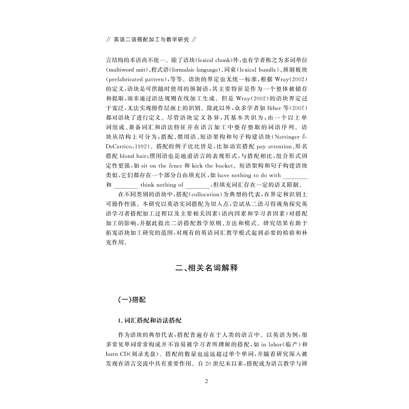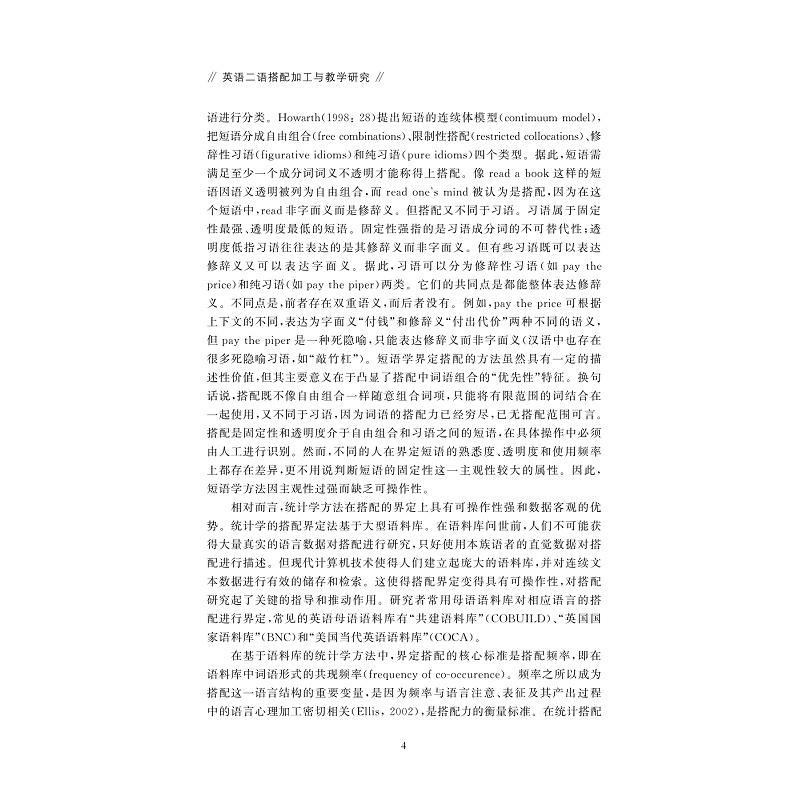 本教材主要内容包括:(1)学习者搭配知识现状和搭配整体加工效应;(2)主要影响因素在搭配加工的作用;(3)搭配教学的资源、原则和方法;(4)搭配的课堂教学模式。本书在理论介绍和应用方面均有创新:(1)从二语习得、语料库语言学和心理语言学多学科交叉视角研究中国学习者的外语搭配;(2)通过揭示搭配加工过程中语言使用背后的深层机理,并提出摆脱目前“费时低效”现状的重要路径在于通过摆脱传统的“词汇-语法”两分法和提升学习者的搭配意识,确立搭配教学在外语教学中的中心地位。