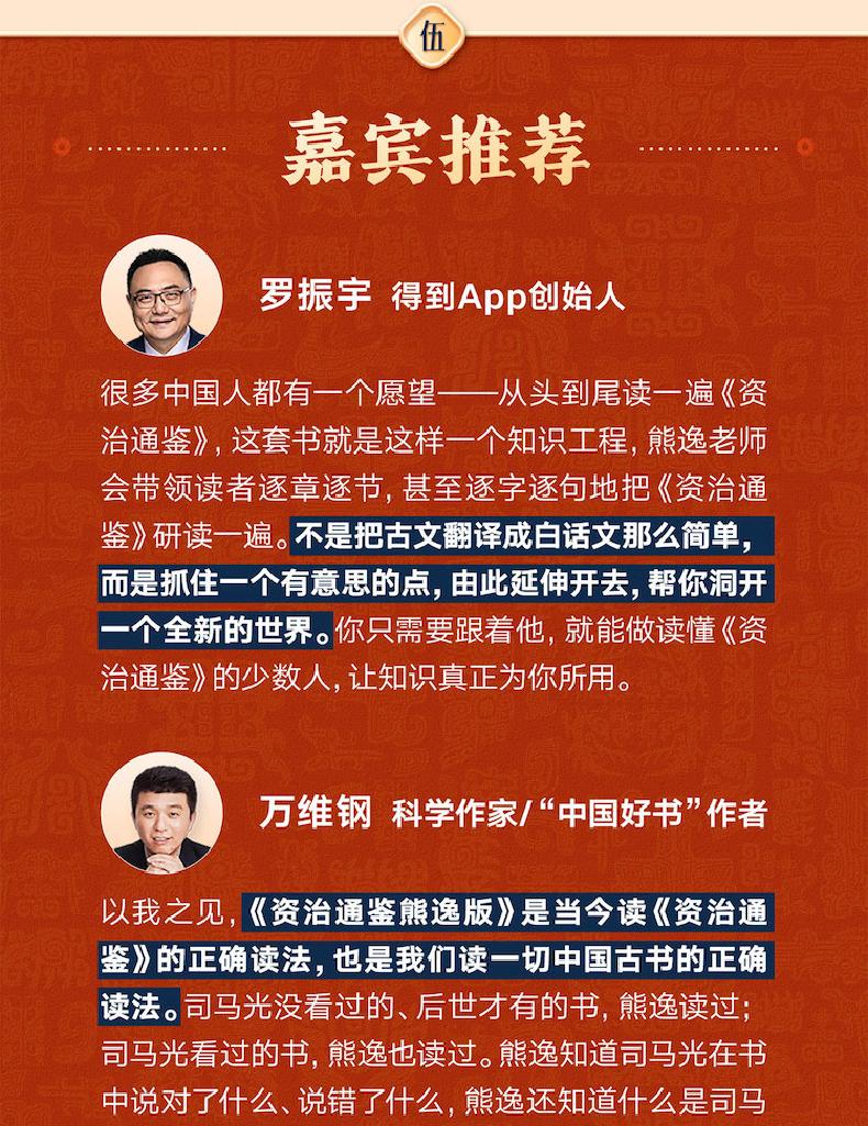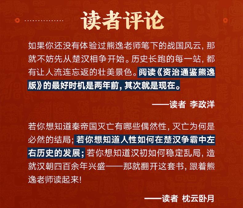 很多中国人都有一个愿望——从头到尾读一遍《资治通鉴》,这套书就是这样一个知识工程,熊逸老师会带领读者逐章逐节,甚至逐字逐句地把《资治通鉴》研读一遍。不是把古文翻译成白话文那么简单,而是抓住一个有意思的点,由此延伸开去,帮你洞开一个全新的世界。你只需要跟着他,就能做读懂《资治通鉴》的少数人,让知识真正为你所用。以我之见,《资治通鉴熊逸版》是当今读《资治通鉴》一正确的读法,也是我们读一切中国古书的正确读法。司马光没看过的、后世才有的书,熊逸读过;司马光看过的书,熊逸也读过。熊逸知道司马光在书中说对了什么、说错了什么,熊逸还知道什么是司马光故意说错的。这种多视角、多维度的讲解,熊逸对中国的历史叙述、包括中国文化进行了祛魅。这个更鲜活的历史只会让你更加热爱中国历史——不是那种“我家祖上特厉害”的爱,而是实在的亲切感。