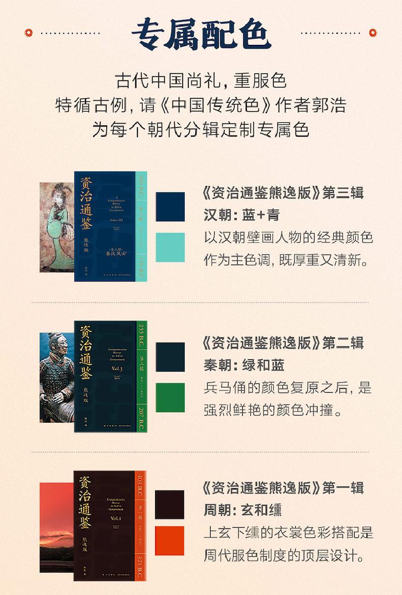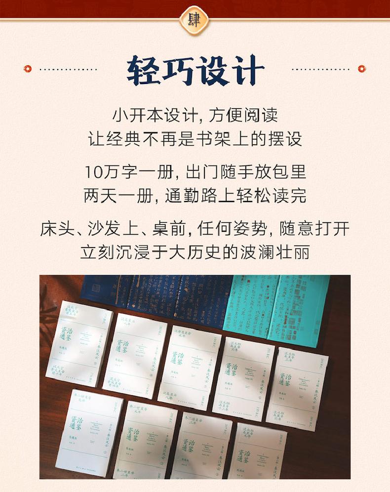 ●特别的装帧,值得珍藏。特别邀请《中国传统色》作者郭浩老师为这套书定制了每个朝代的专属颜色。一辑讲述周朝没落,标志性颜色是玄和纁。第二辑讲述秦朝崛起,标志性颜色是兵马俑的俑绿和俑蓝。第三辑讲述大汉初兴,标志性颜色是俑紫和青衿。这套书特意设计为口袋本,一辑九册,轻盈便携,盈手可握,飞机上、地铁上、枕头边,小小一册,随时都可以读起来。