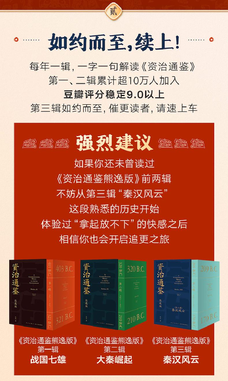 ●上市两年,经住了市场和读者口碑的双重考验。《资治通鉴熊逸版》一辑上市两年,销量近八万套;第二辑上市一年,销量近四万套,两辑的豆瓣评分都在9分以上。●前两辑没读?没关系,第三辑才是正片。第三辑讲述秦亡汉兴的精彩历史,其中有你非常熟悉的历史人物(胡亥、赵高、李斯、陈胜、吴广、刘邦、项羽、韩信等)、历史事件(陈胜吴广起义、楚汉争霸、鸿门宴、霸王别姬等)。跟随熊逸老师的脚步,用不一样的视角,把你熟悉的这段历史重走一遍。