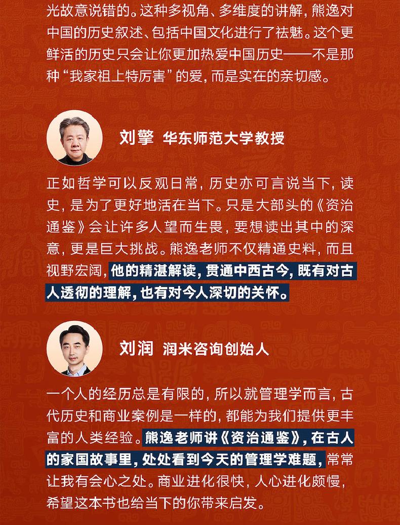 一个人的经历总是有限的,所以就管理学而言,古代历史和商业案例是一样的,都能为我们提供更丰富的人类经验。熊逸老师讲《资治通鉴》,在古人的家国故事里,处处看到今天的管理学难题,常常让我有会心之处。商业进化很快,人心进化颇慢,希望这本书也给当下的你带来启发。