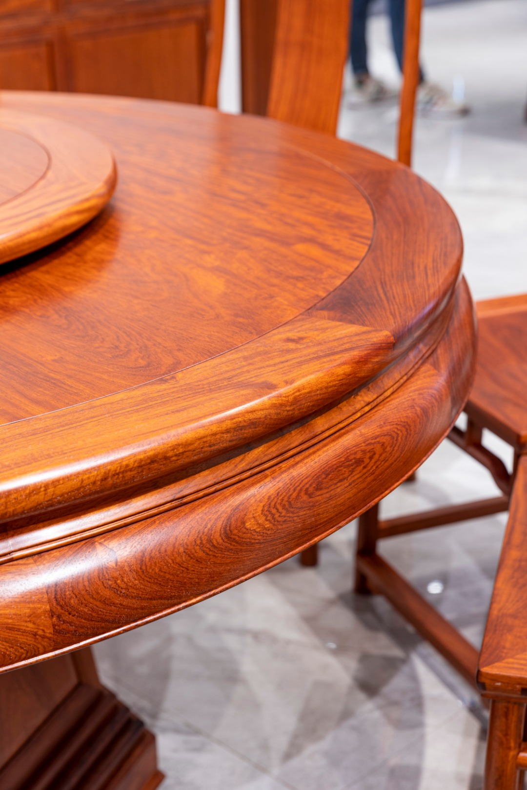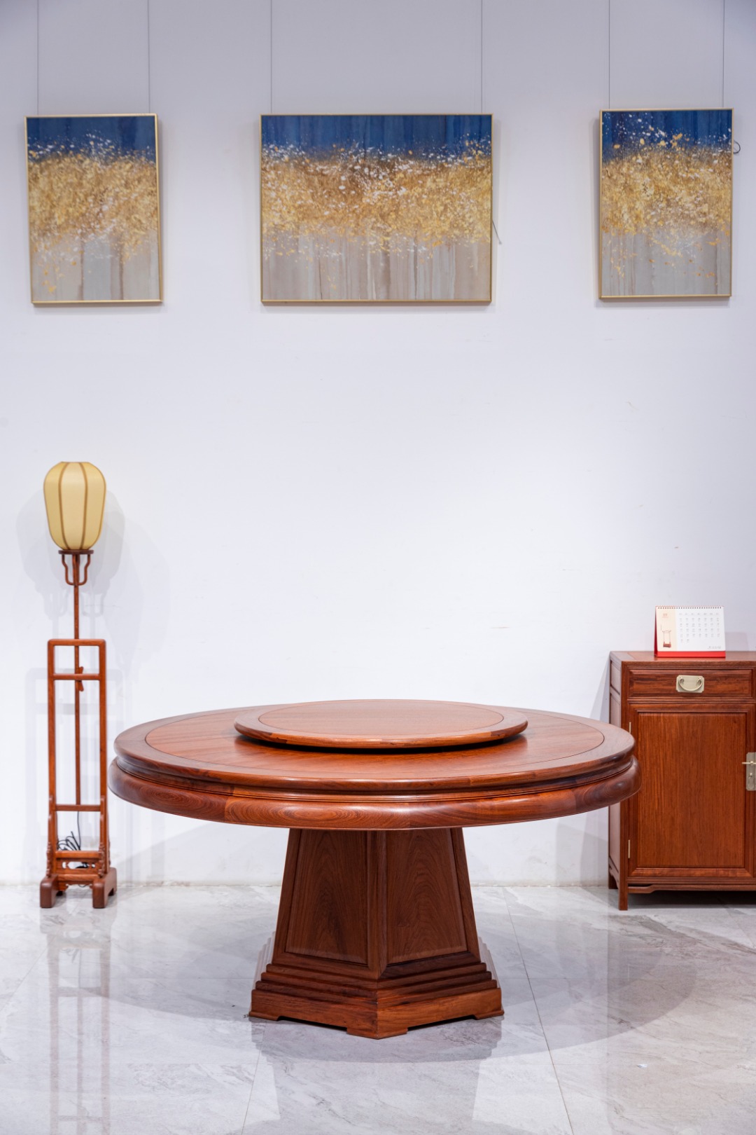 这款素边圆餐桌,牙板加厚,有束腰,圆形象征家庭幸福吉祥;束腰面板下挂牙结构是非常受力的,整器同层餐台同料所开,寓和谐同心;大小规格围坐适合不同人数,家人围坐,团结情感,共享美味佳肴,其乐融融;底座采用传统步步高升的六角底座做法,十分稳固。搭配灯挂椅,适宜大部分城市生活空间。