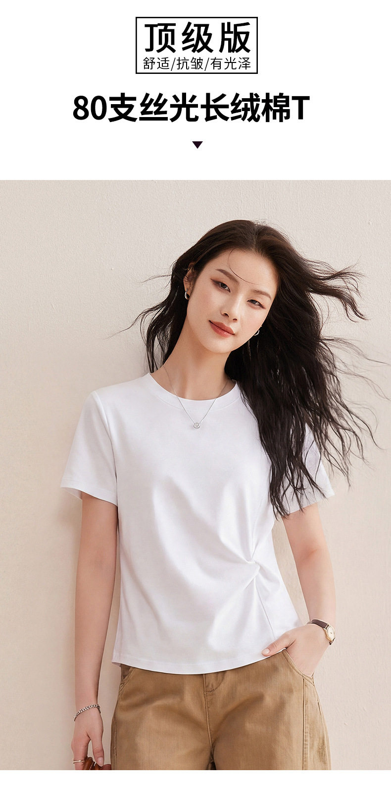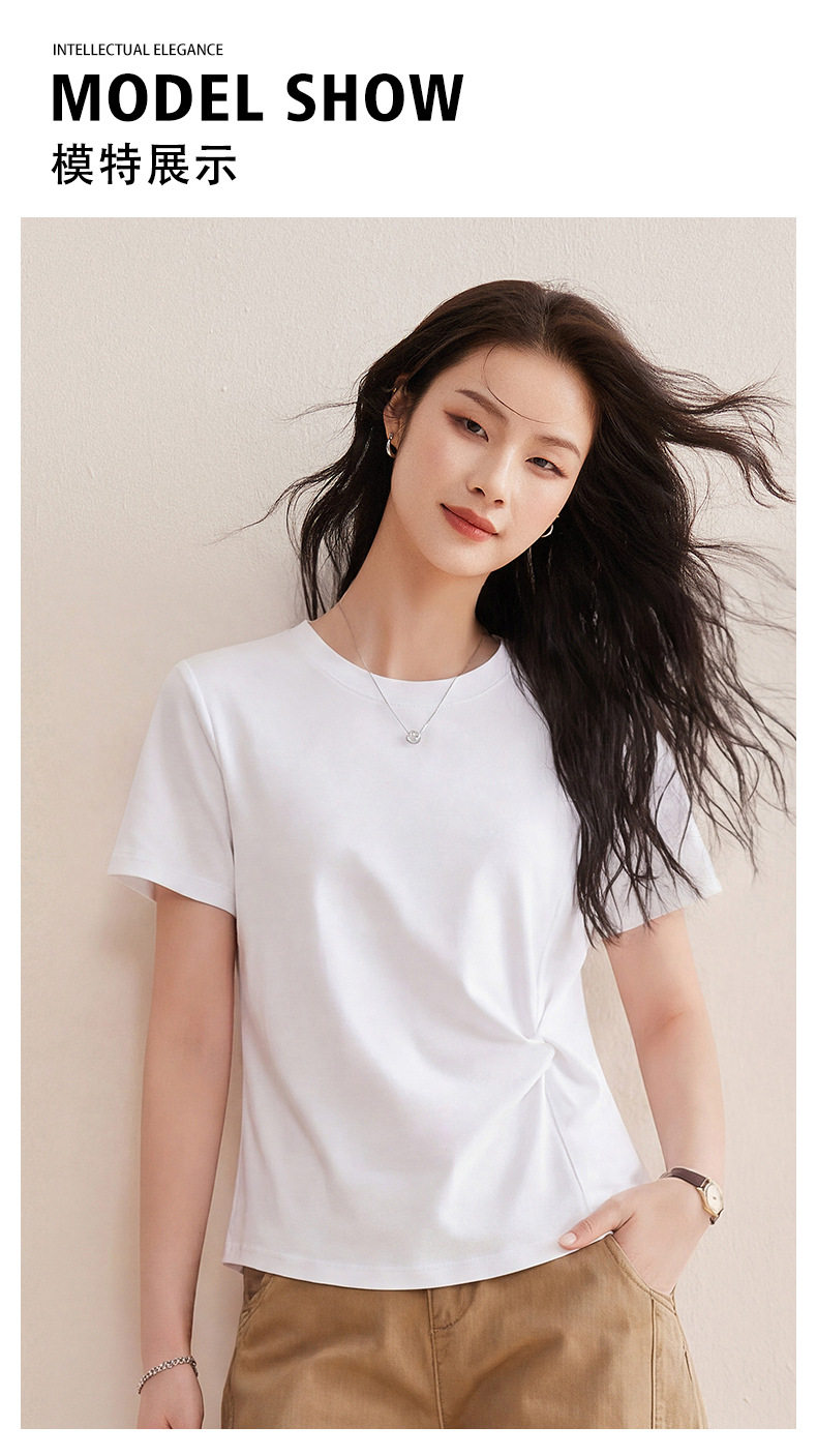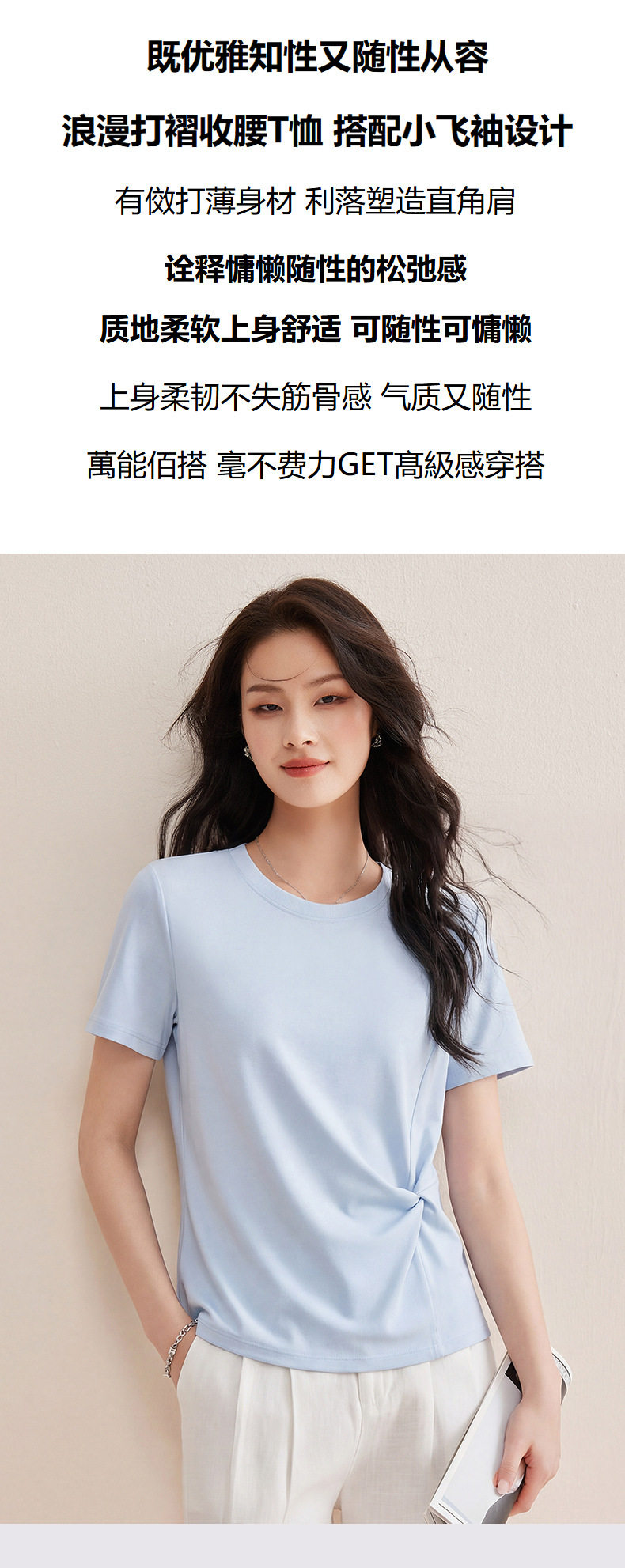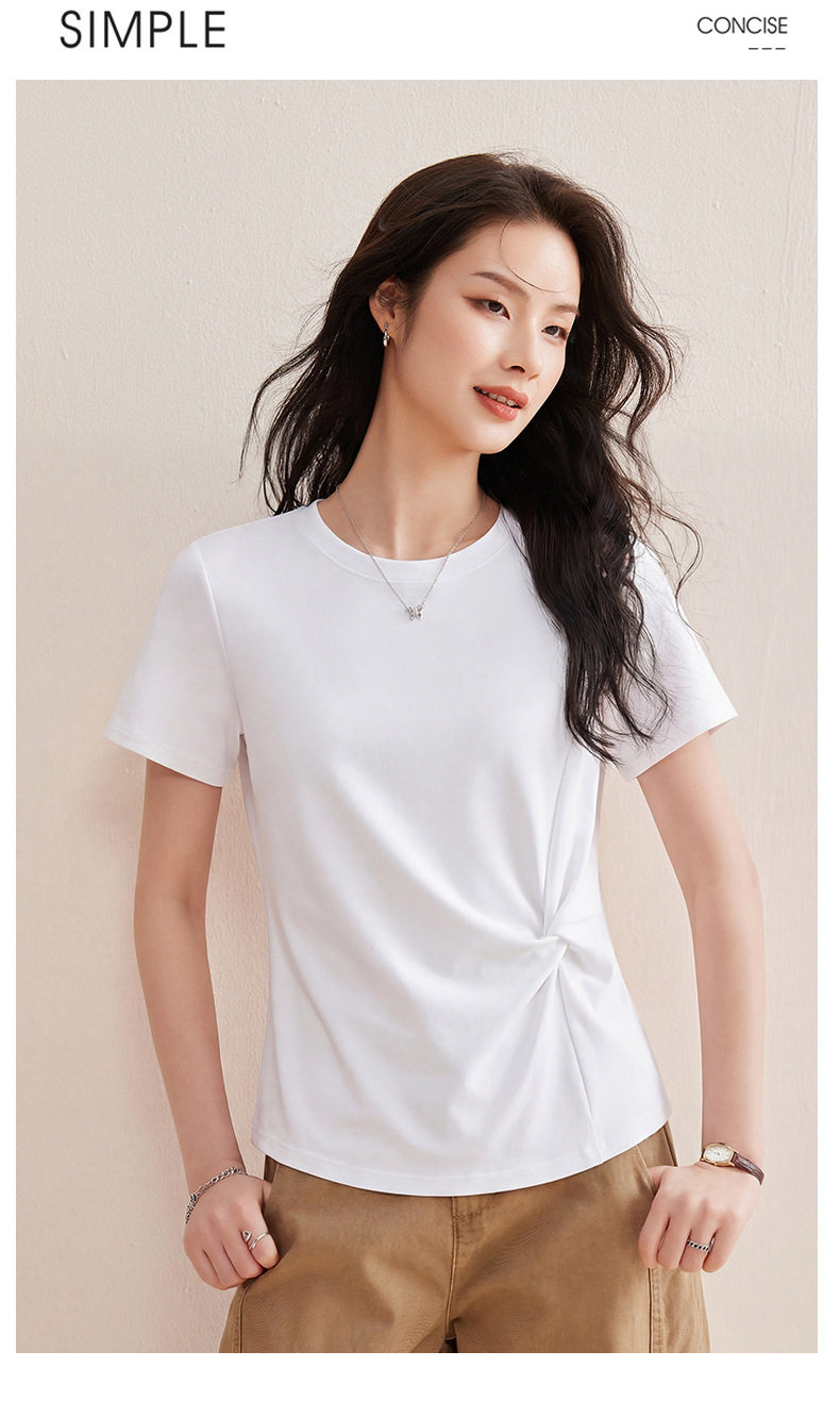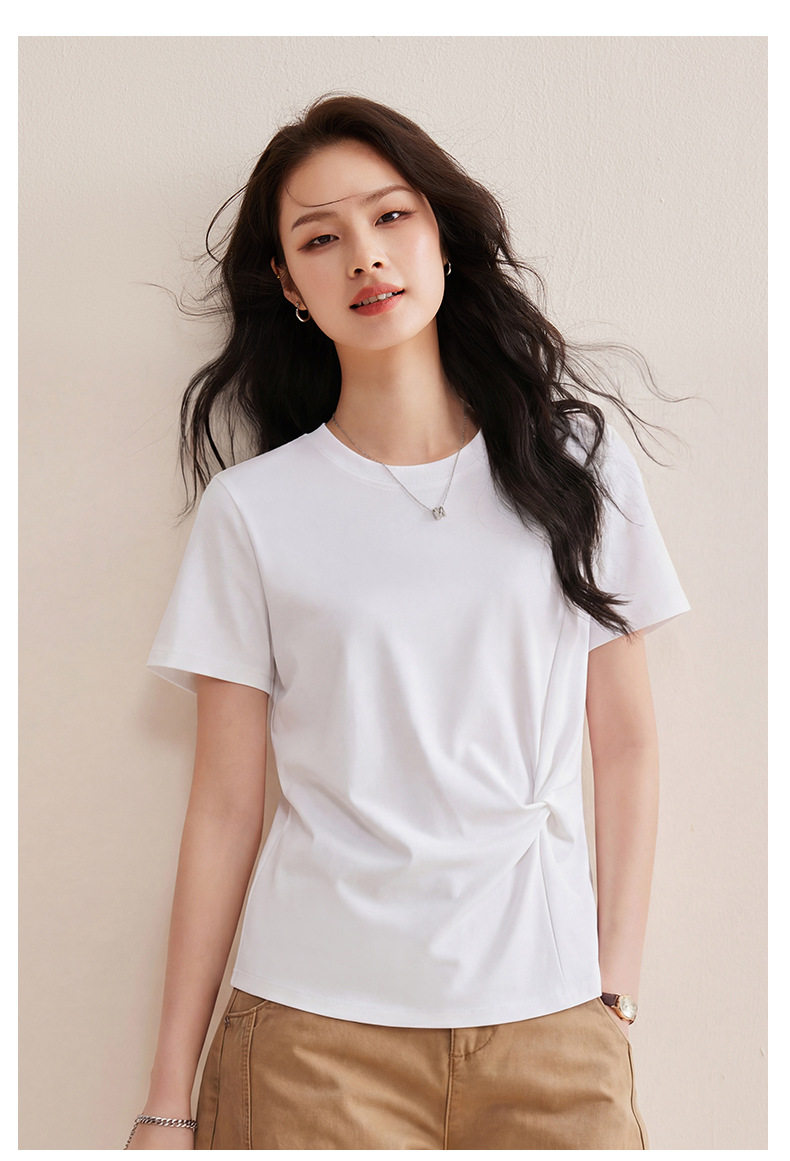 「自j」全新升级【铂金会员128/天猫169/差价41】(12049)洛诗琳时尚丝光棉短袖上衣2026夏季正肩修身扭结不规则T恤