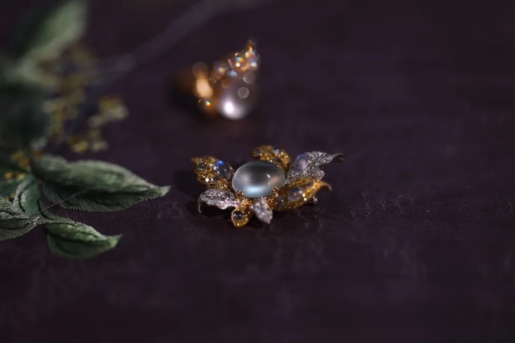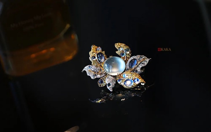 通体使用璀璨的大颗粒玫瑰切钻石,小白钻石,黄钻,以及戴着淡蓝色光晕的月光石。