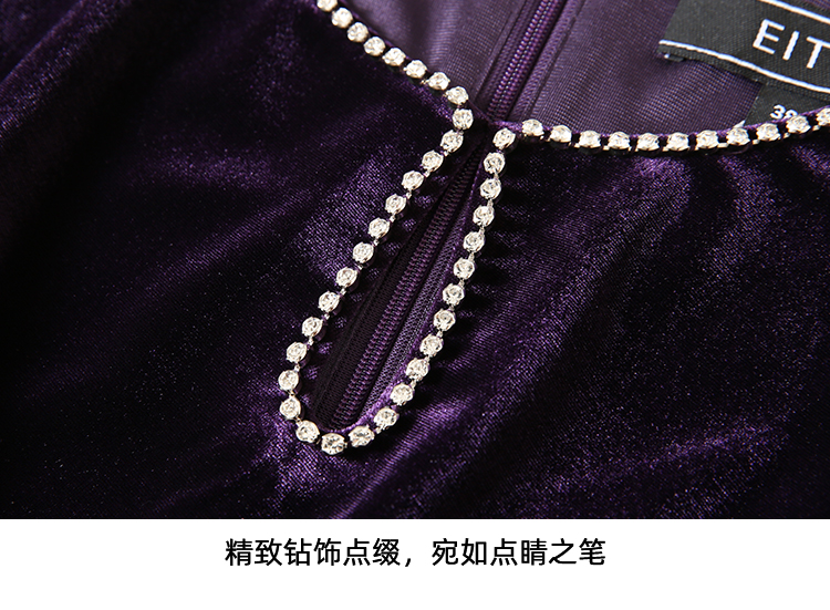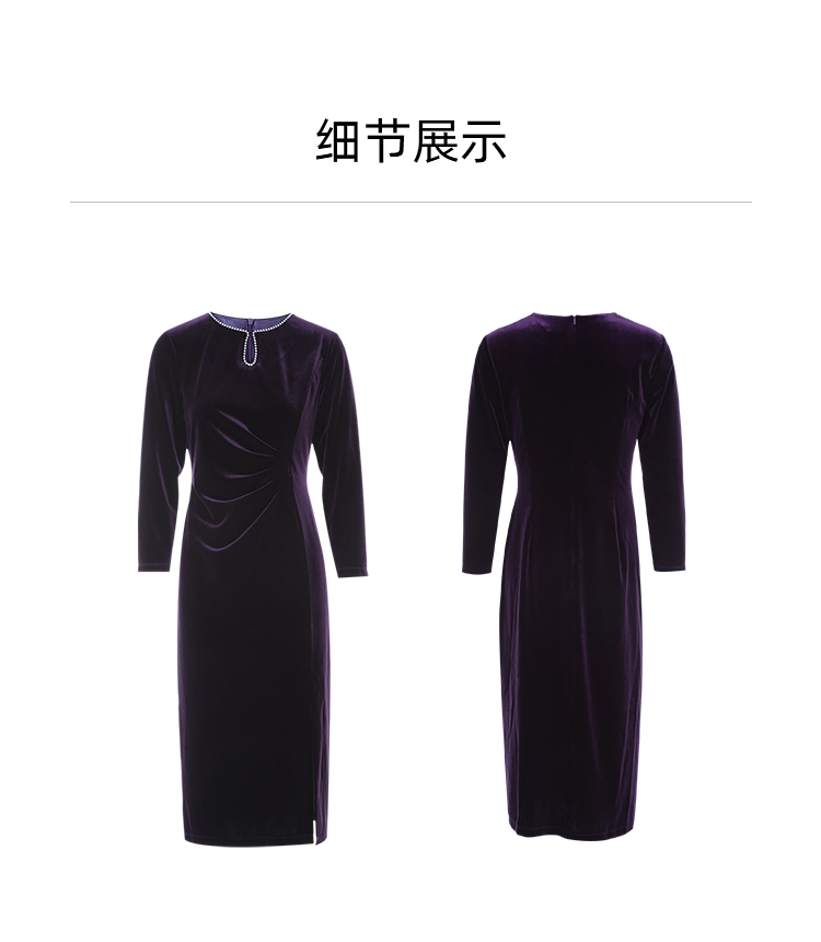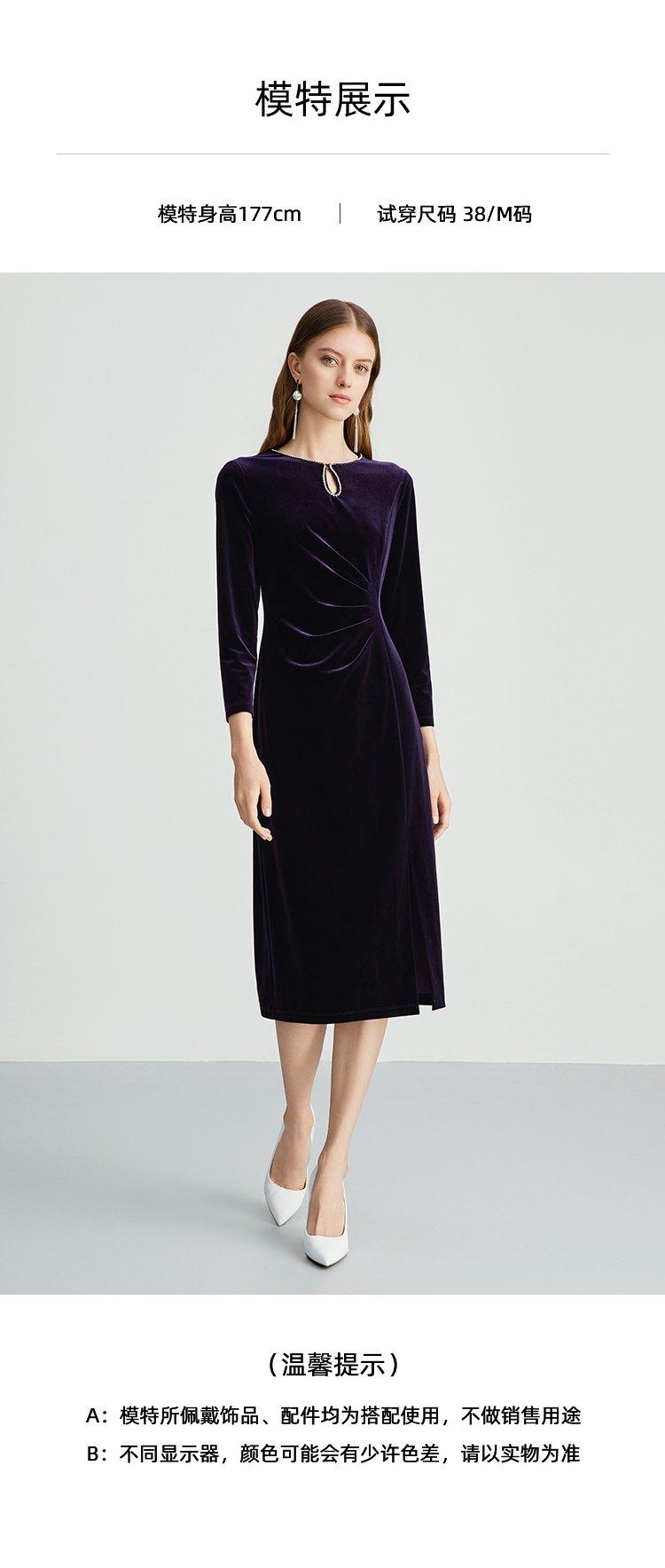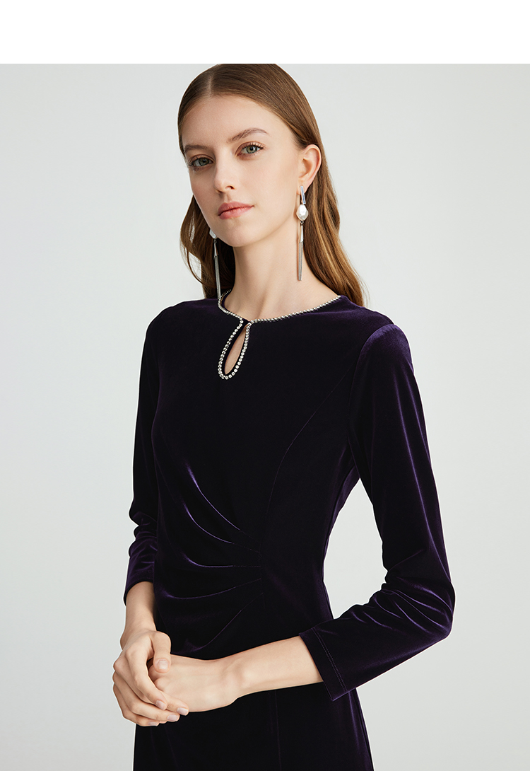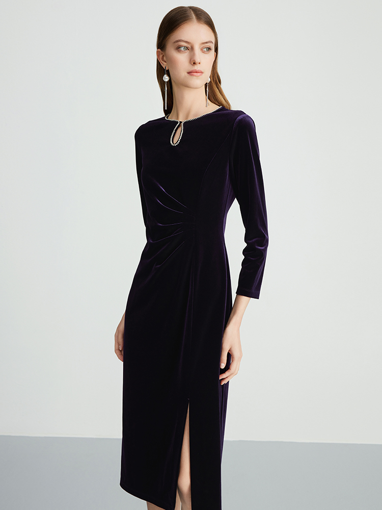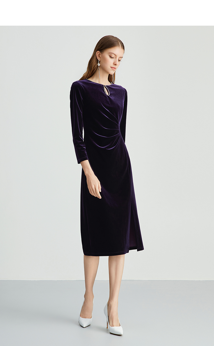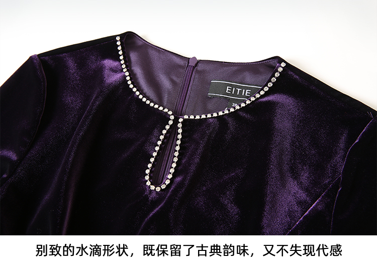 EITIE爱特爱优雅气质钻饰褶皱收腰开叉紫色丝绒连衣裙秋新款C2407404