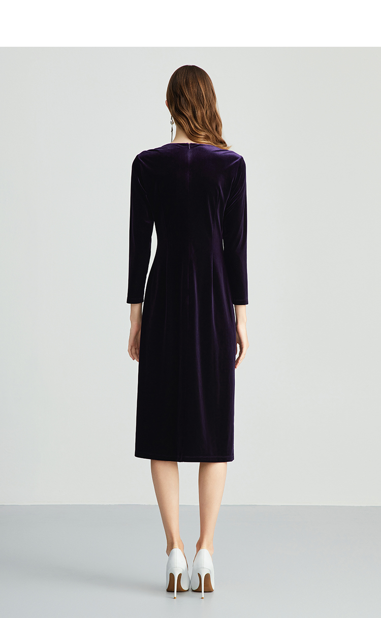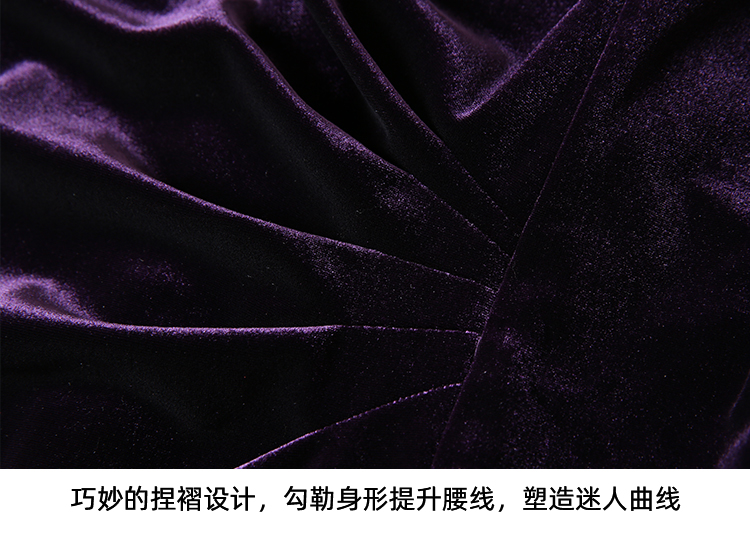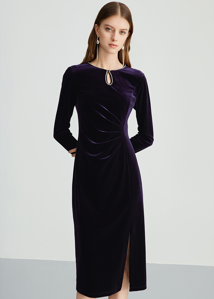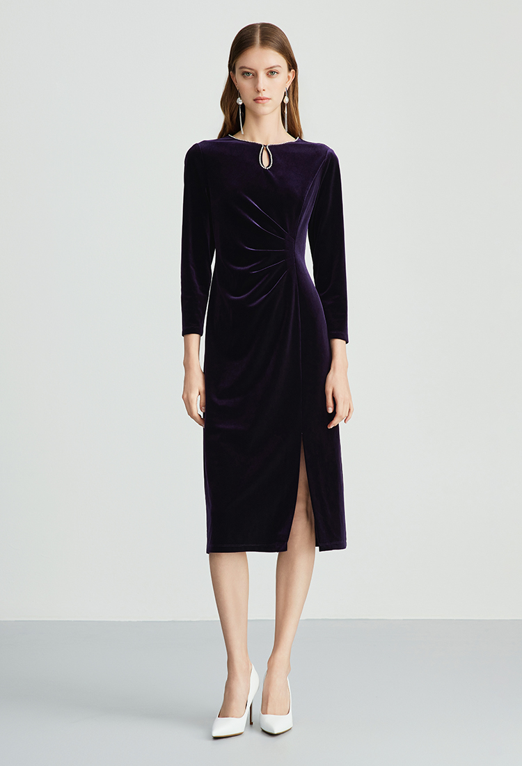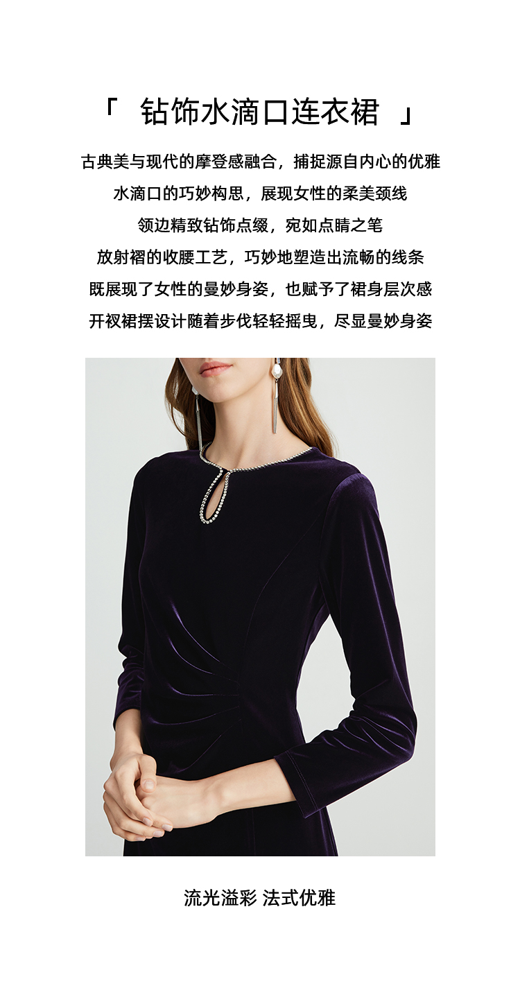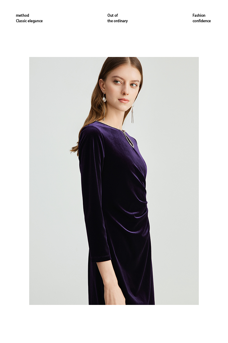 EITIE爱特爱优雅气质钻饰褶皱收腰开叉紫色丝绒连衣裙秋新款C2407404