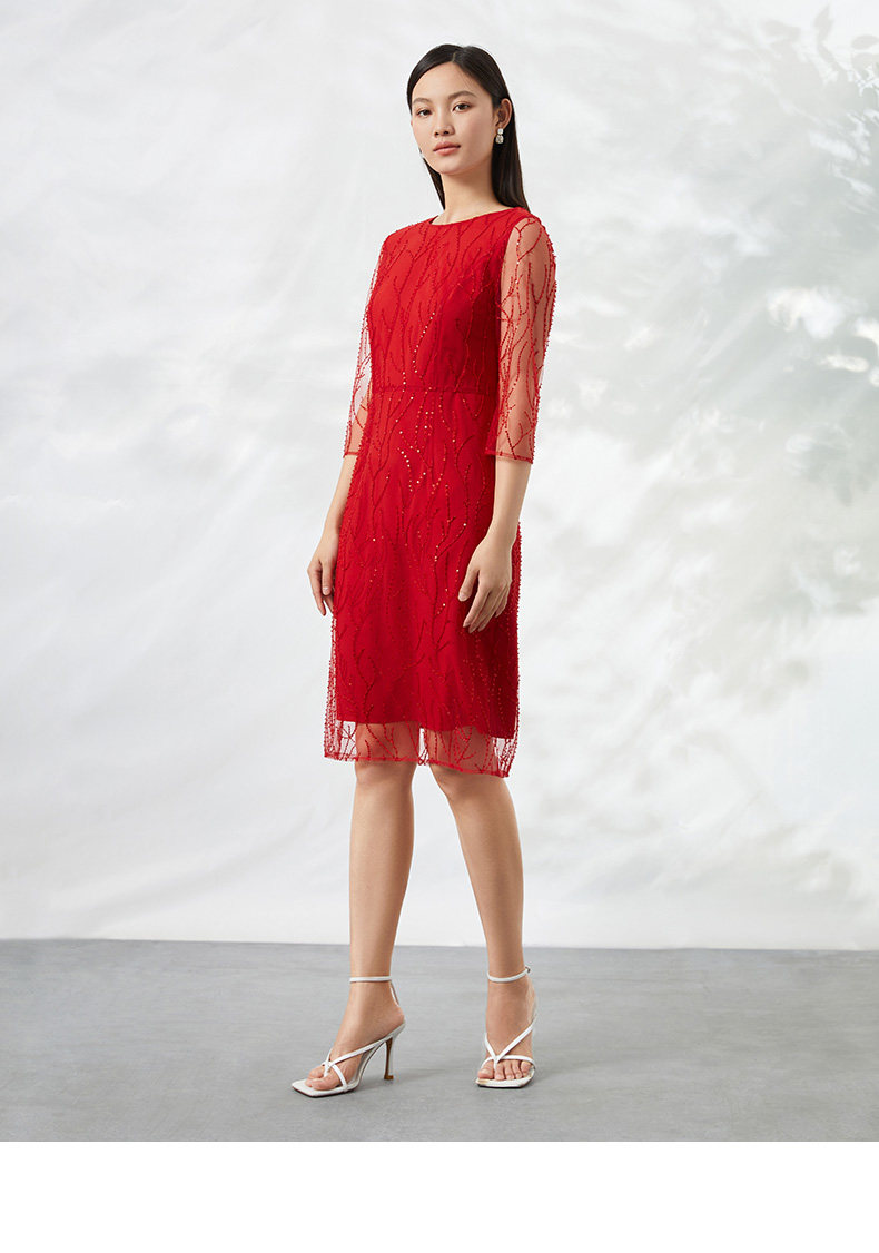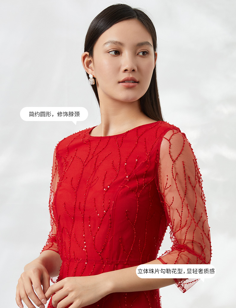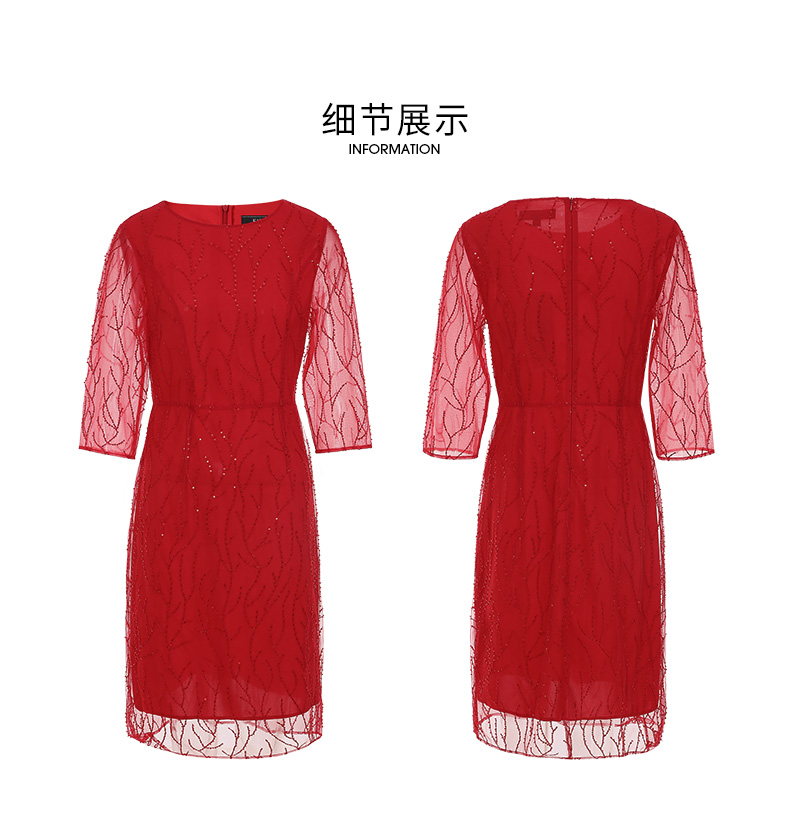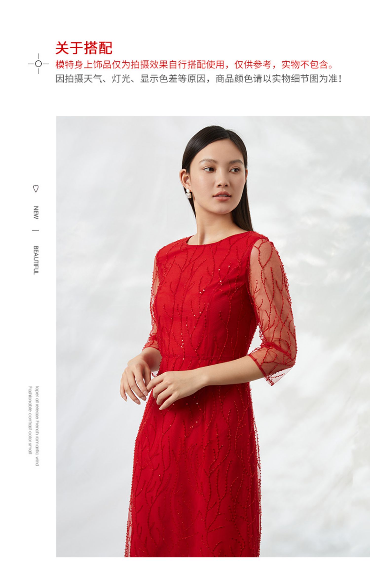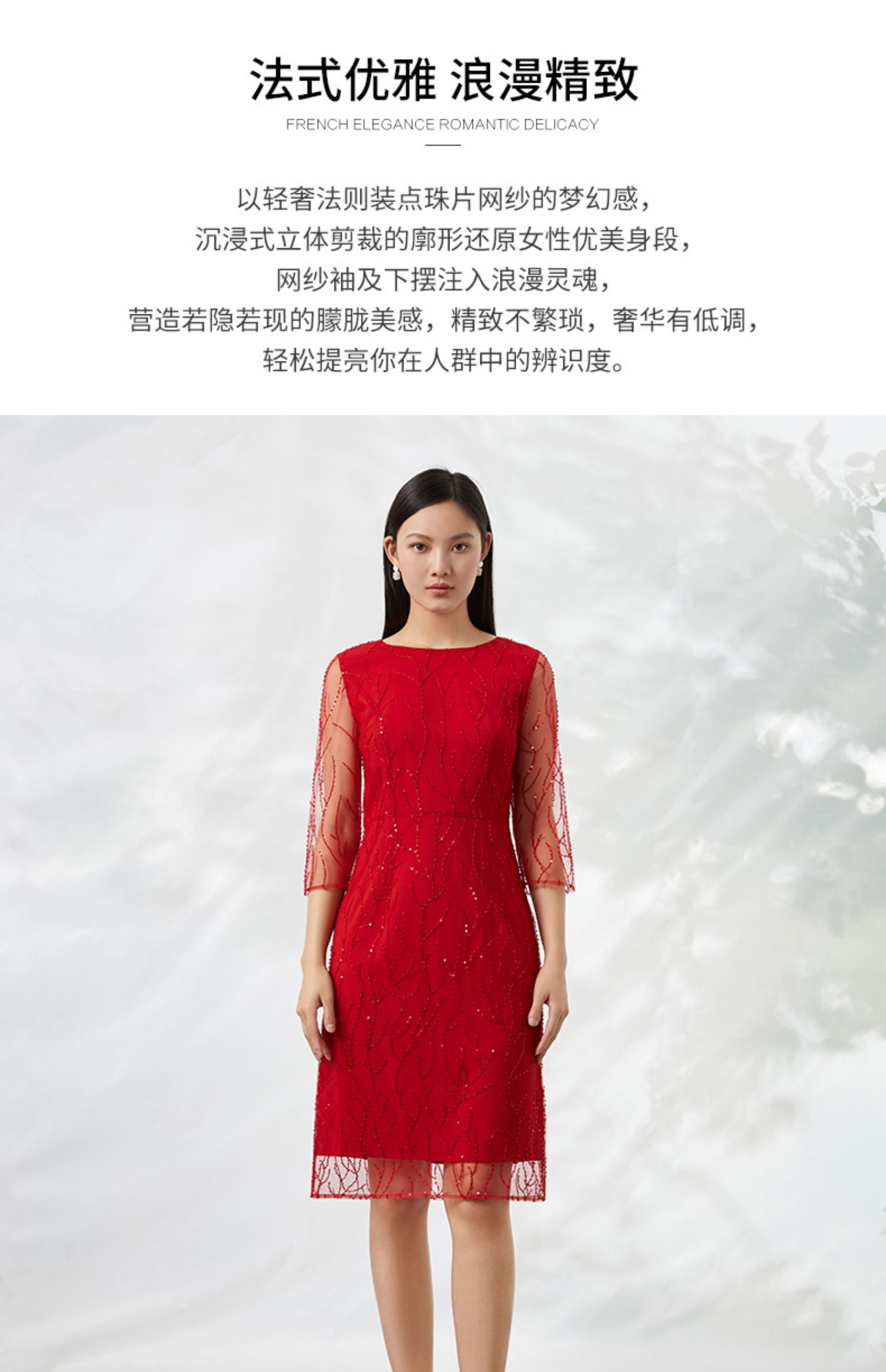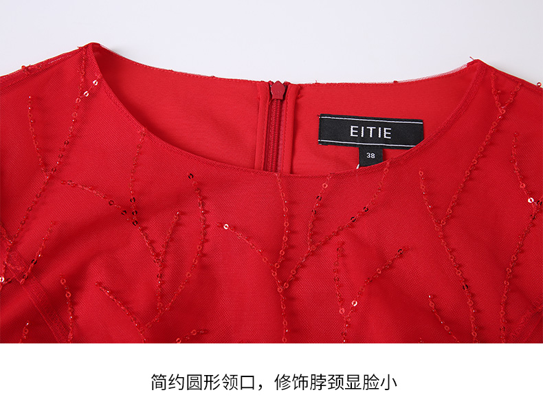 EITIE爱特爱秋季新款日常小礼服通勤气质网纱拼接红色连衣裙C2207004
