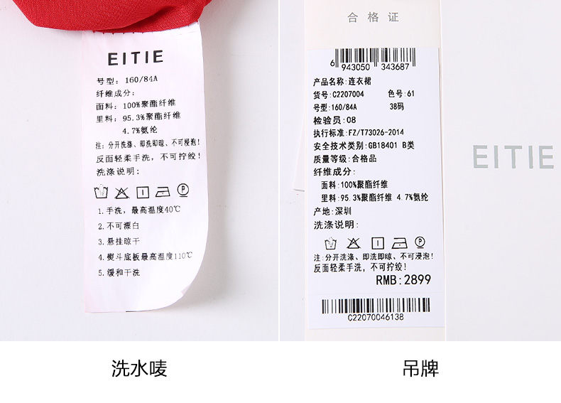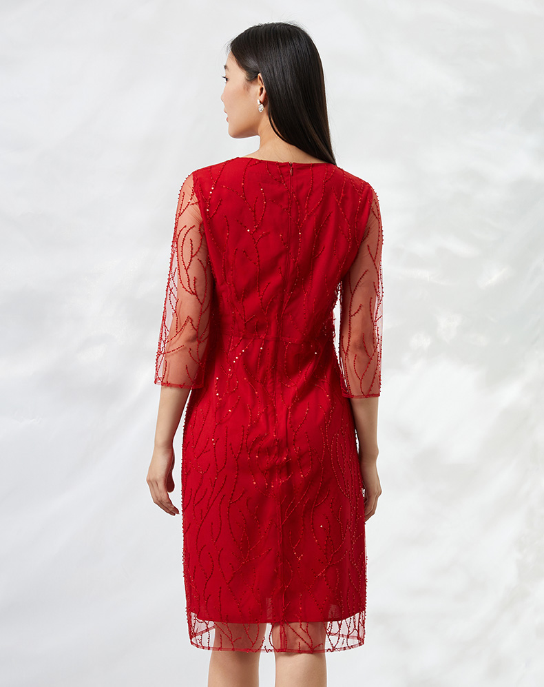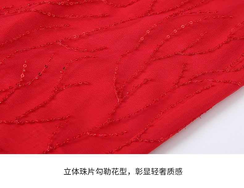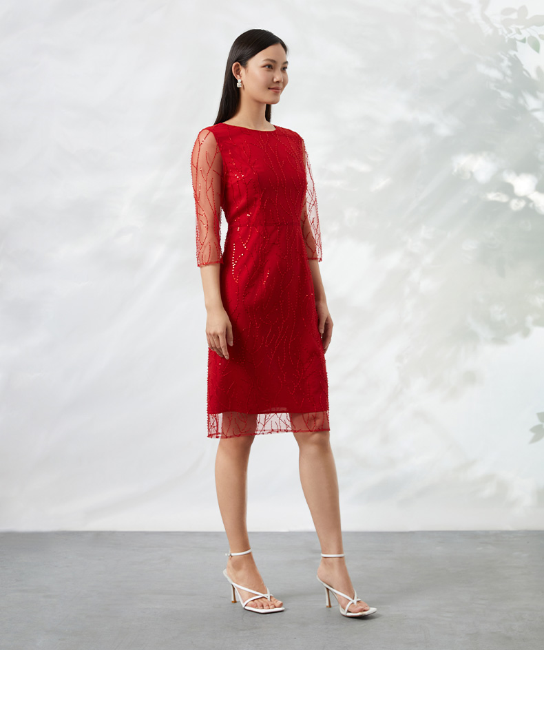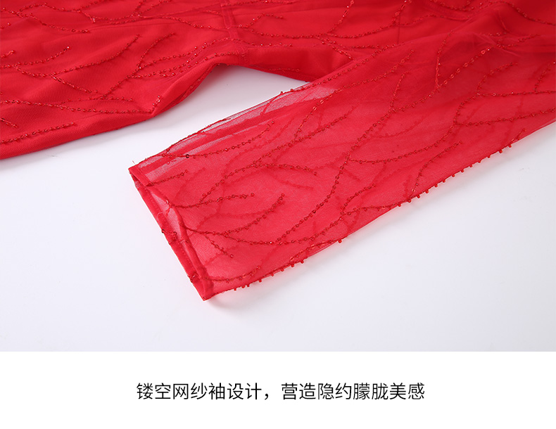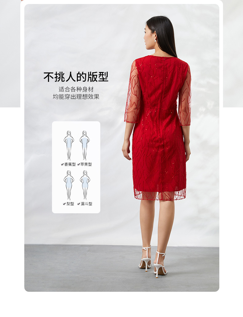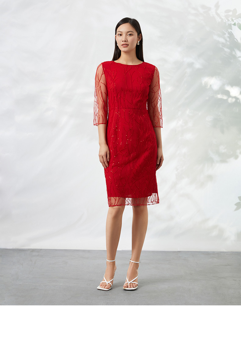 EITIE爱特爱秋季新款日常小礼服通勤气质网纱拼接红色连衣裙C2207004