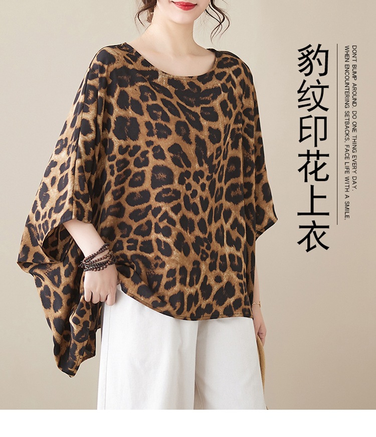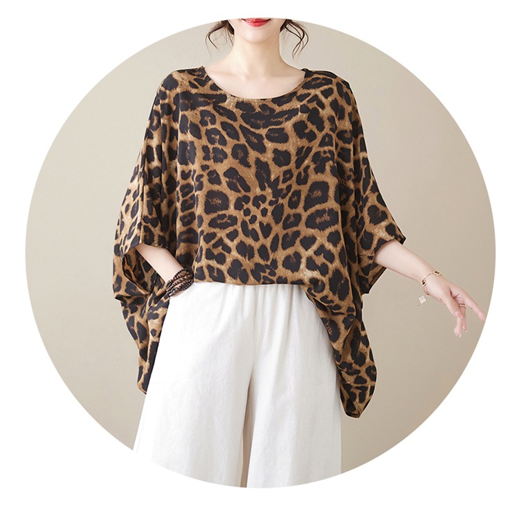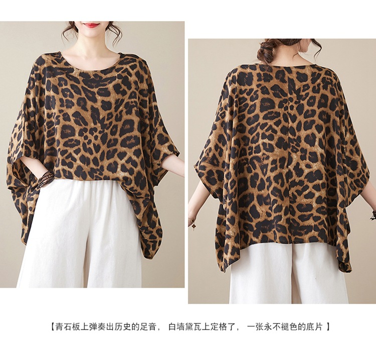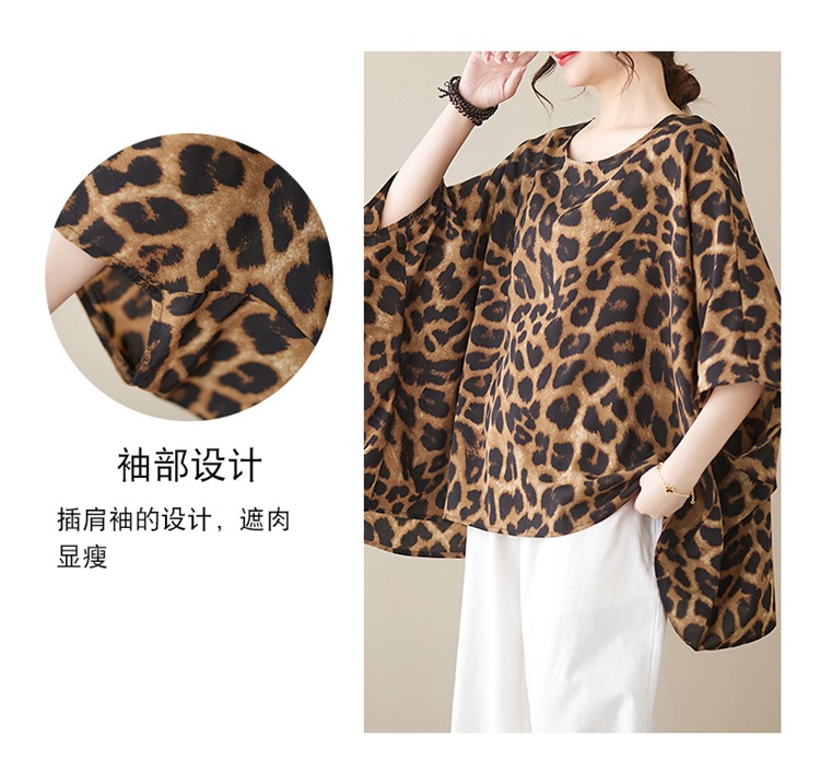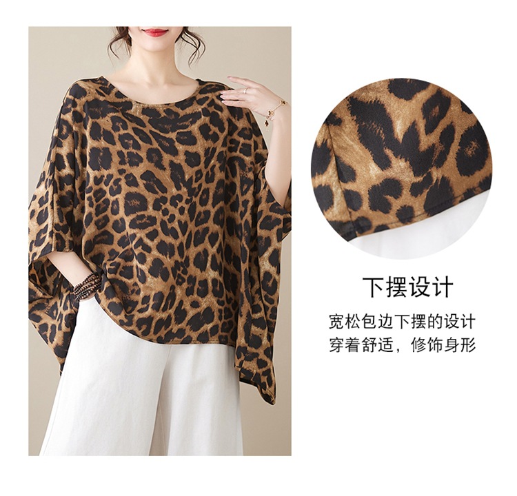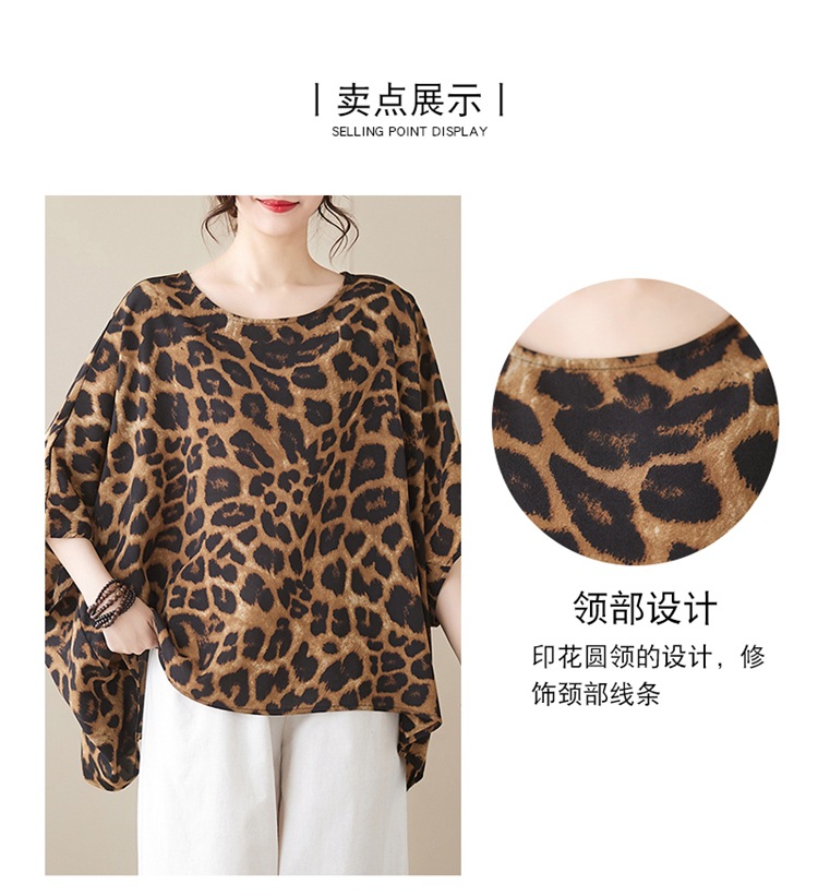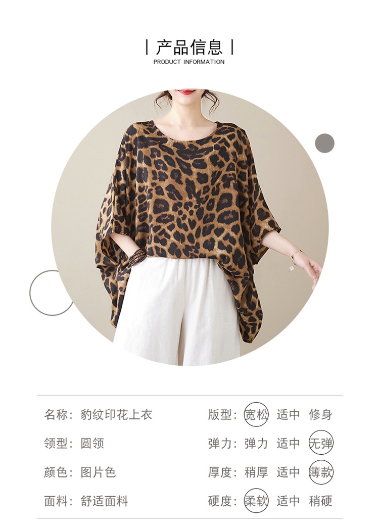 福利款~雀说时尚宽松大码女装新款复古文艺气质蝙蝠袖时尚豹纹花圆领T恤上衣AL