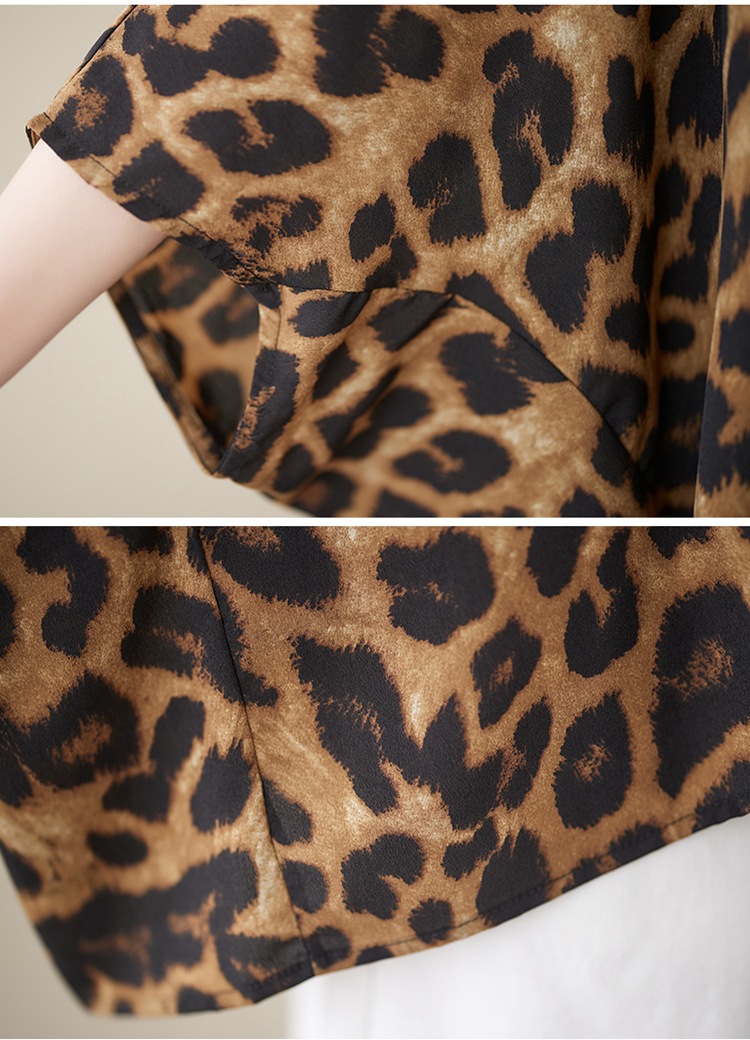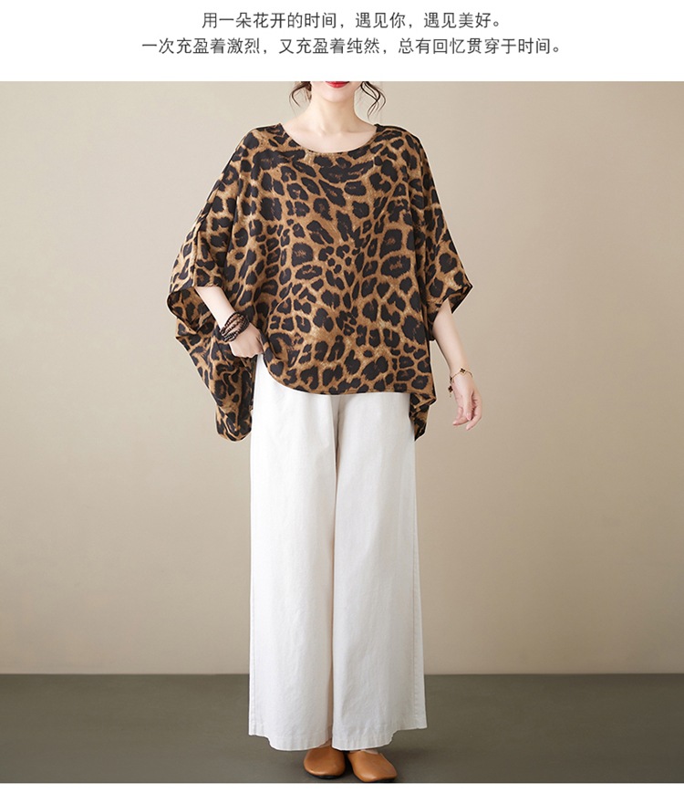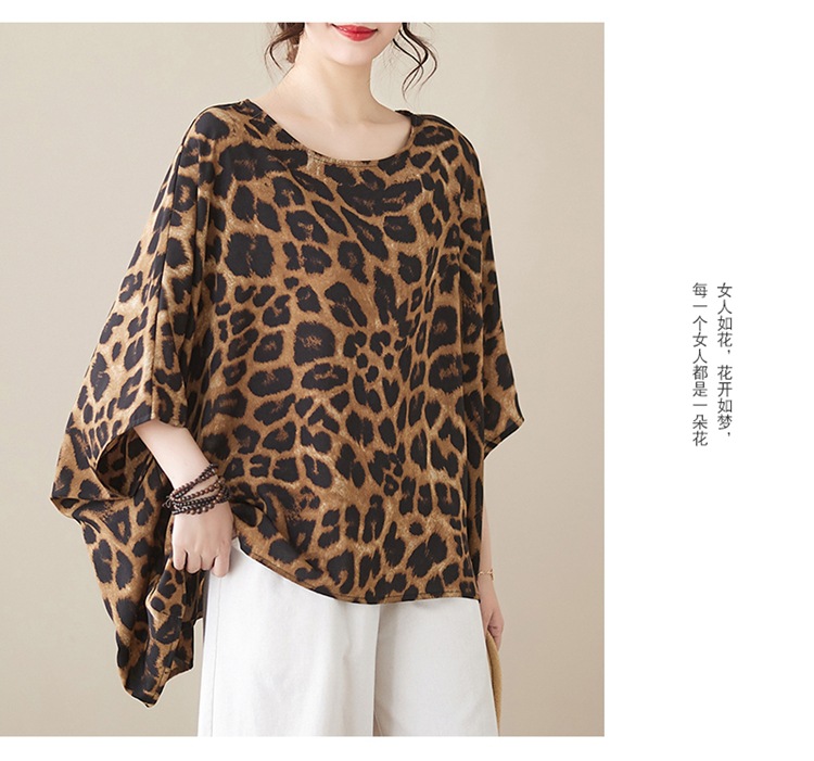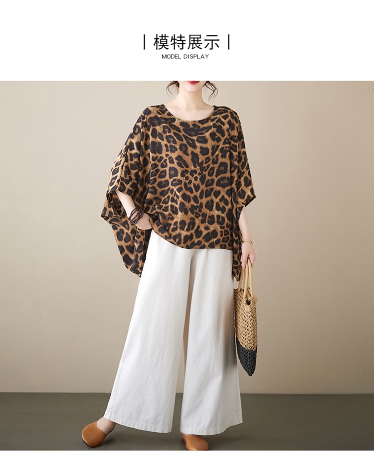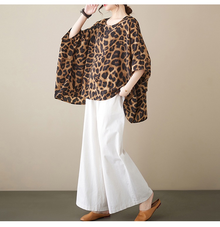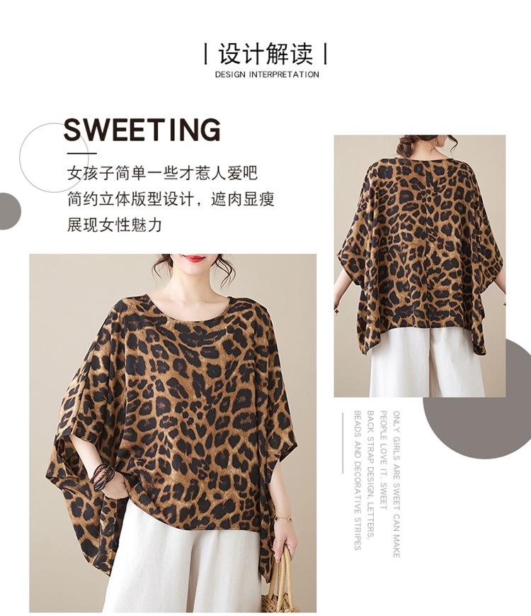 福利款~雀说时尚宽松大码女装新款复古文艺气质蝙蝠袖时尚豹纹花圆领T恤上衣AL