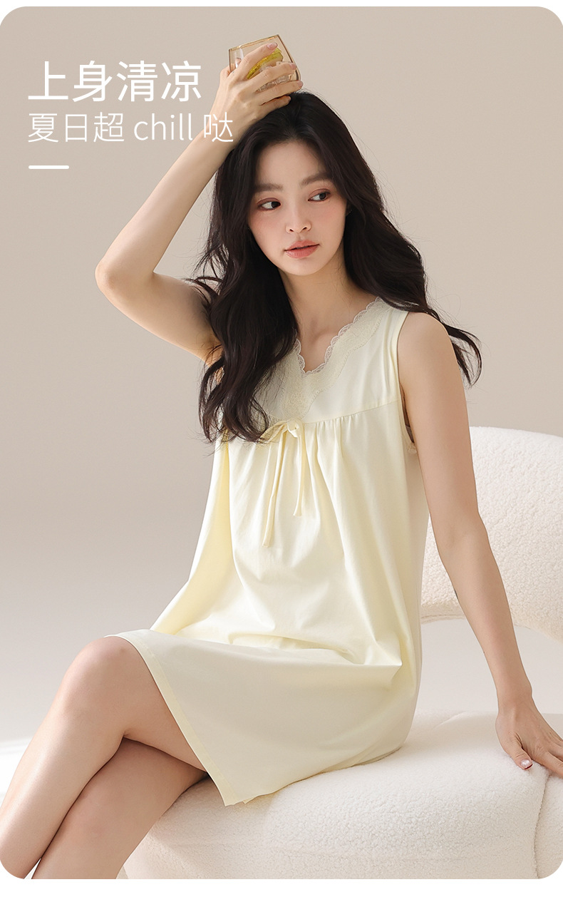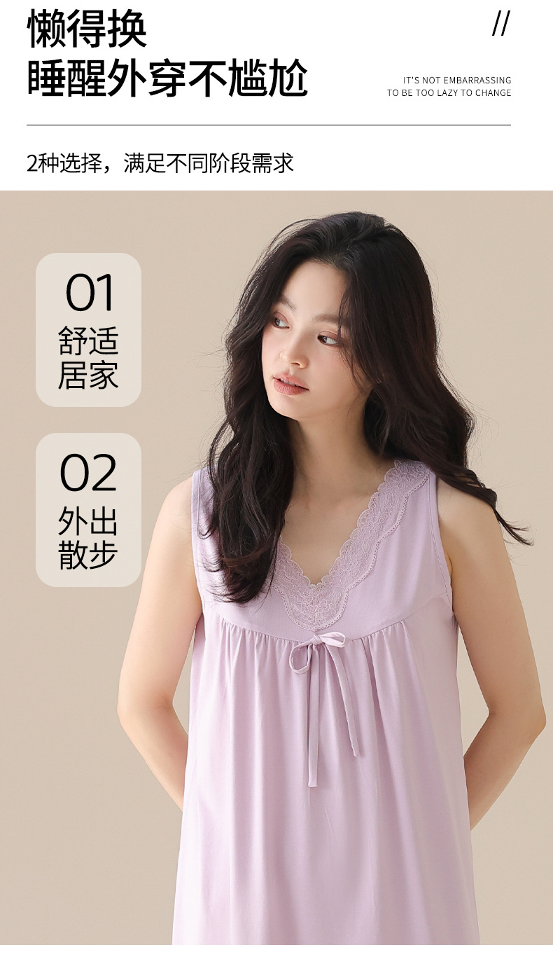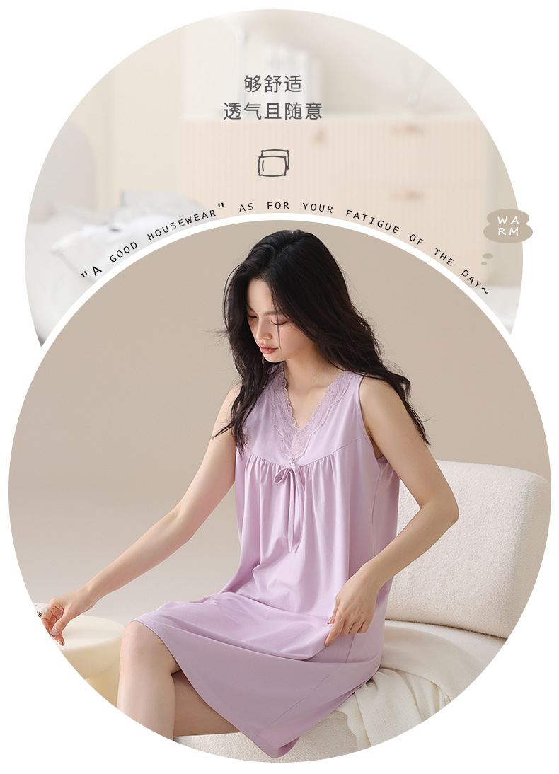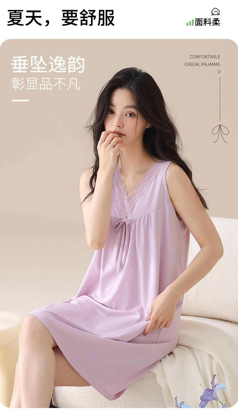 丁摩 夏季【棉+莫代尔】睡裙女士无袖V领蕾丝高级感家居服夏天女款中长裙5ZF-