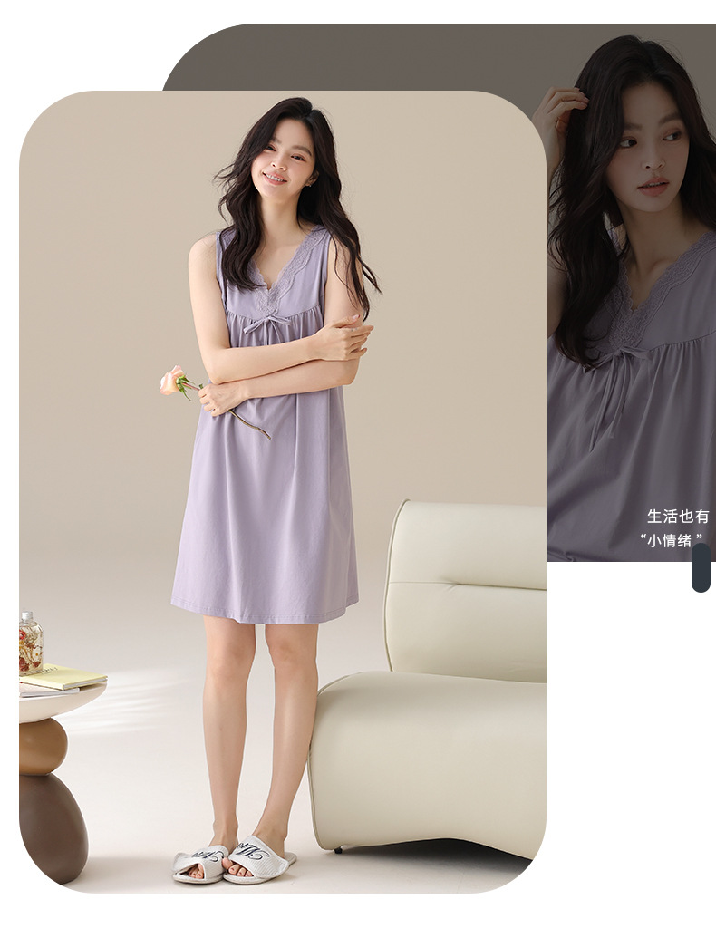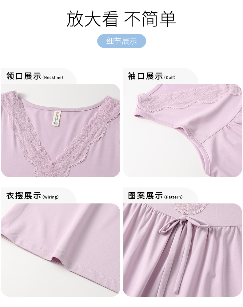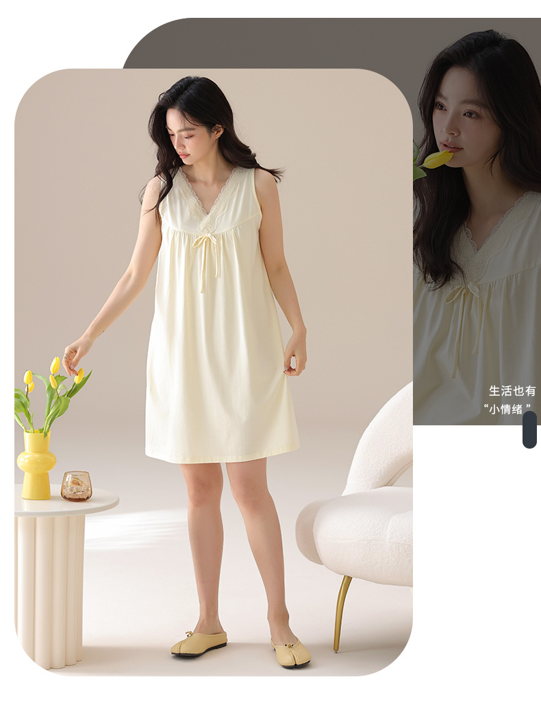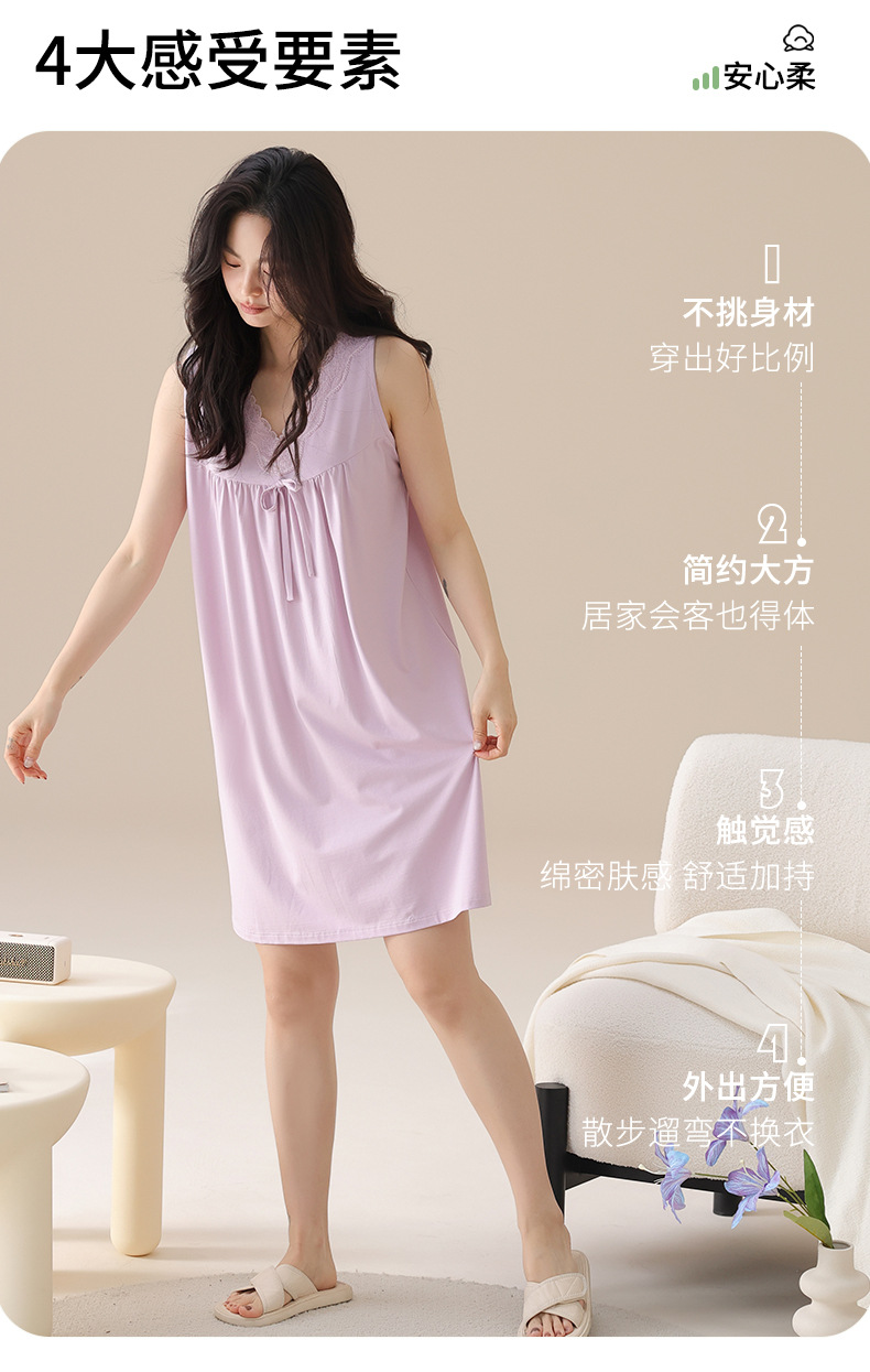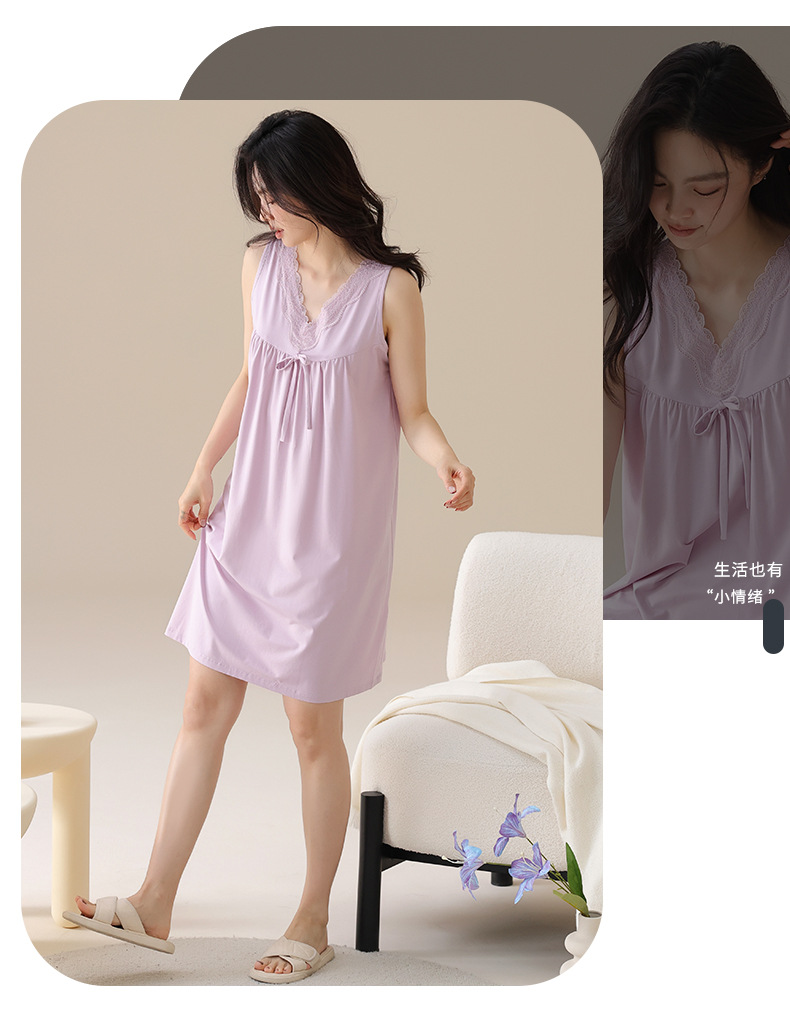 丁摩 夏季【棉+莫代尔】睡裙女士无袖V领蕾丝高级感家居服夏天女款中长裙5ZF-