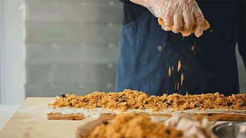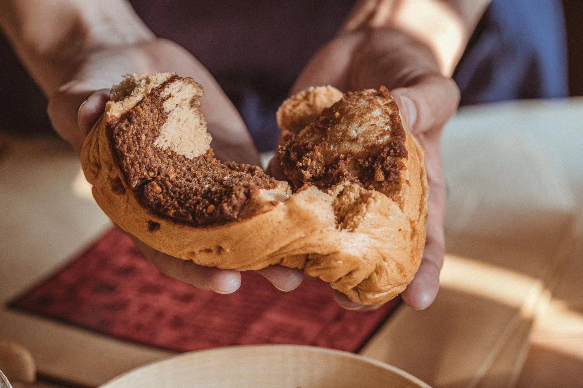 薄薄细碎的海苔裹在肉松里,有“四两拨千金”的意味,入口后很快挑动味蕾,与肉松、蛋黄酱一起在红糖馒头中构成奇异的风味魅力。