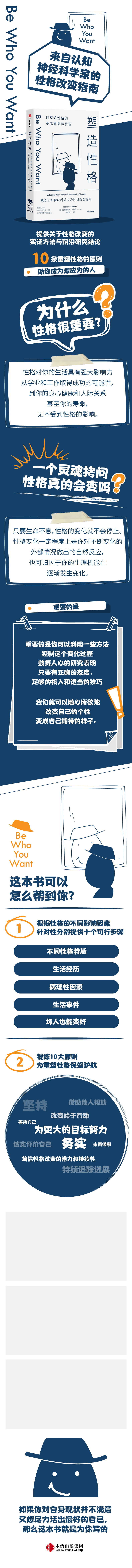 本书讲述了罪犯如何改过自新,羞怯的名人如何重新发出自己的声音,瘾君子如何洗心革面并超越自我,同时融合了最新的、令人信服的心理学研究成果。读完本书,你会发现人的性格并非无法改变。是的,如果你想改变自己,你完全可以做到。虽然这个过程不会很快或很轻松,但你的确可以做到。