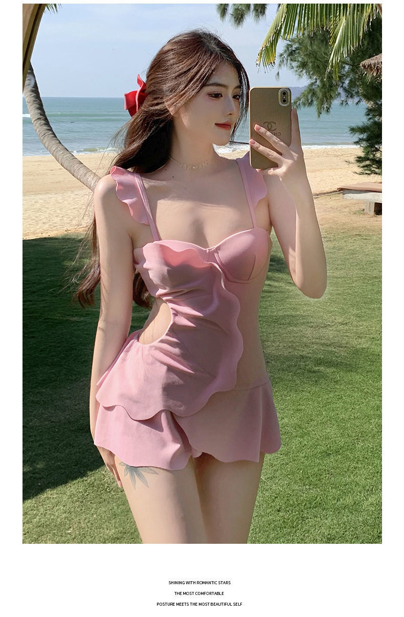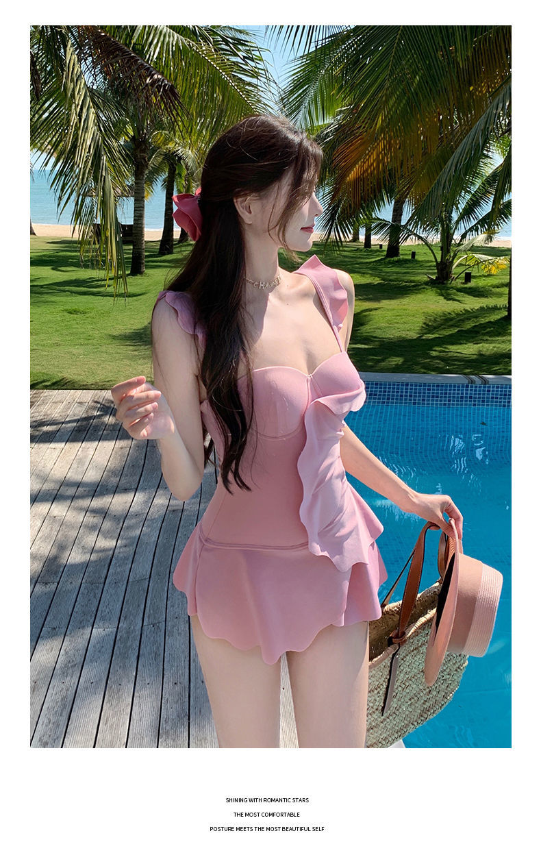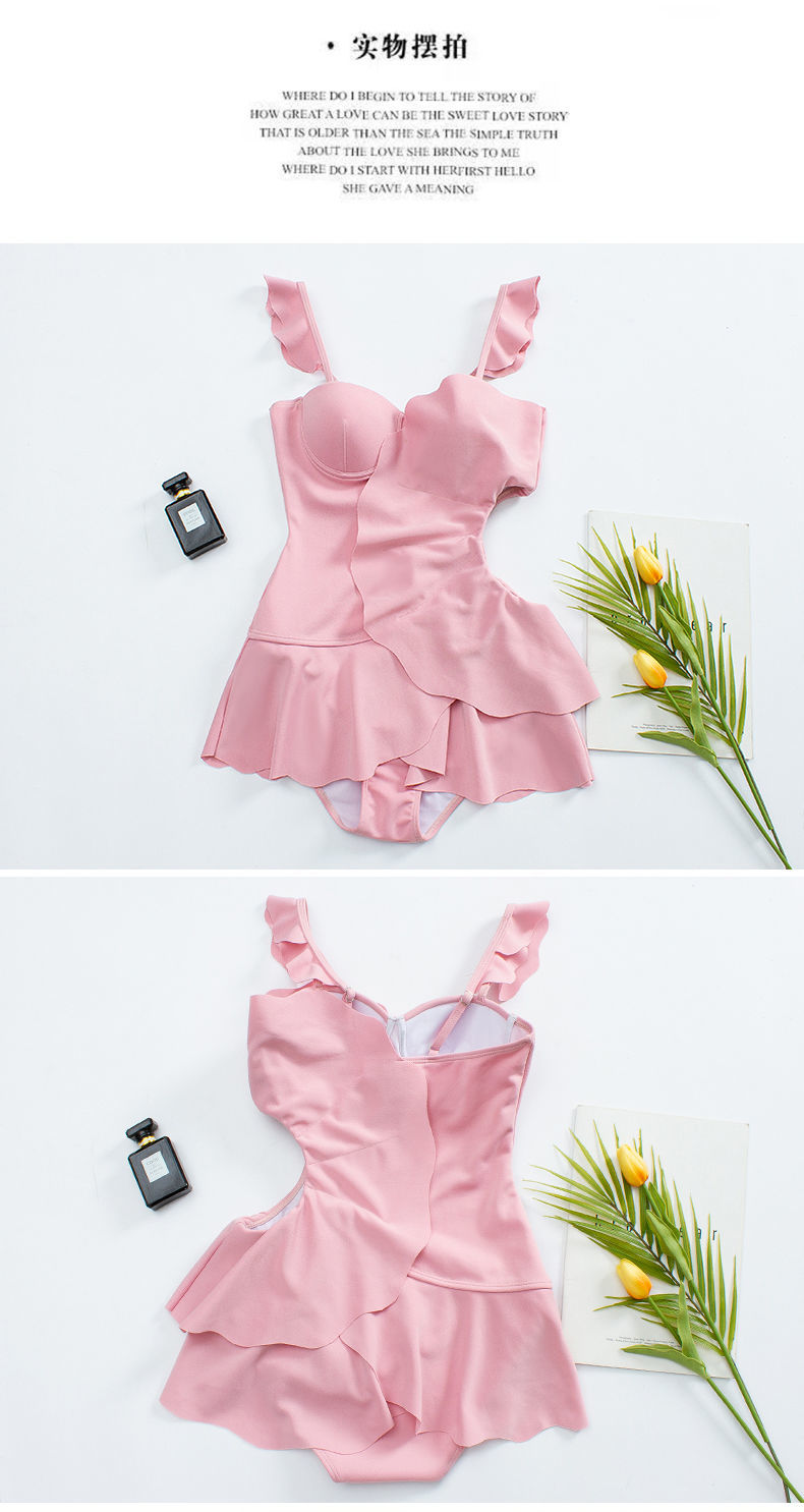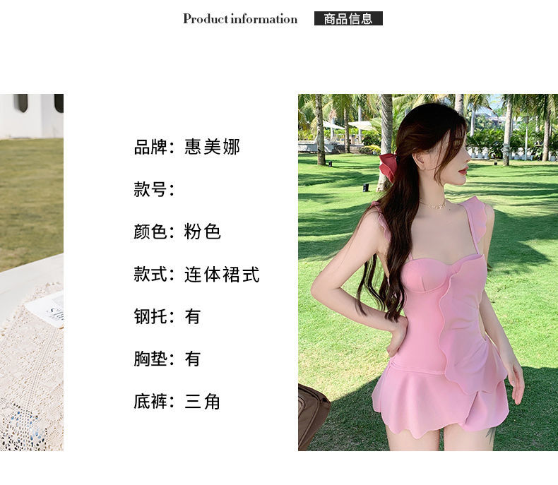 【连体式荷叶边裙式泳衣】黛唯梵泳衣女夏纯欲风仙女范遮肚显瘦性感荷叶边可爱保守连体裙式泳装