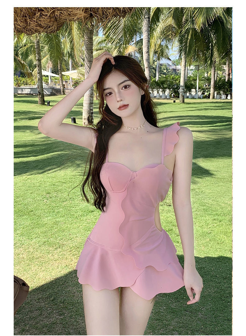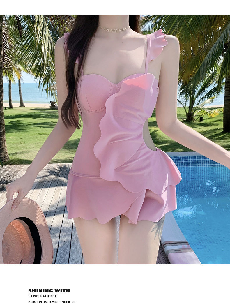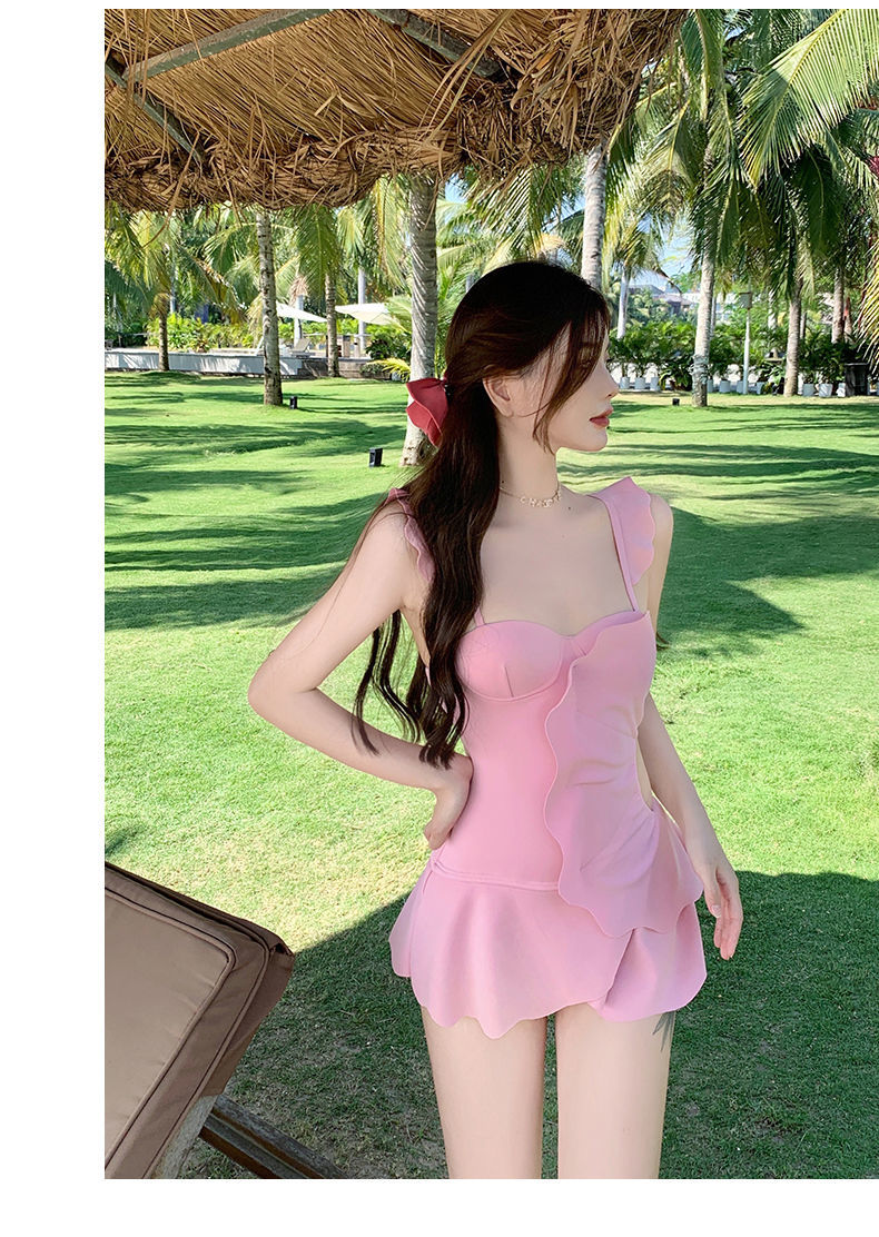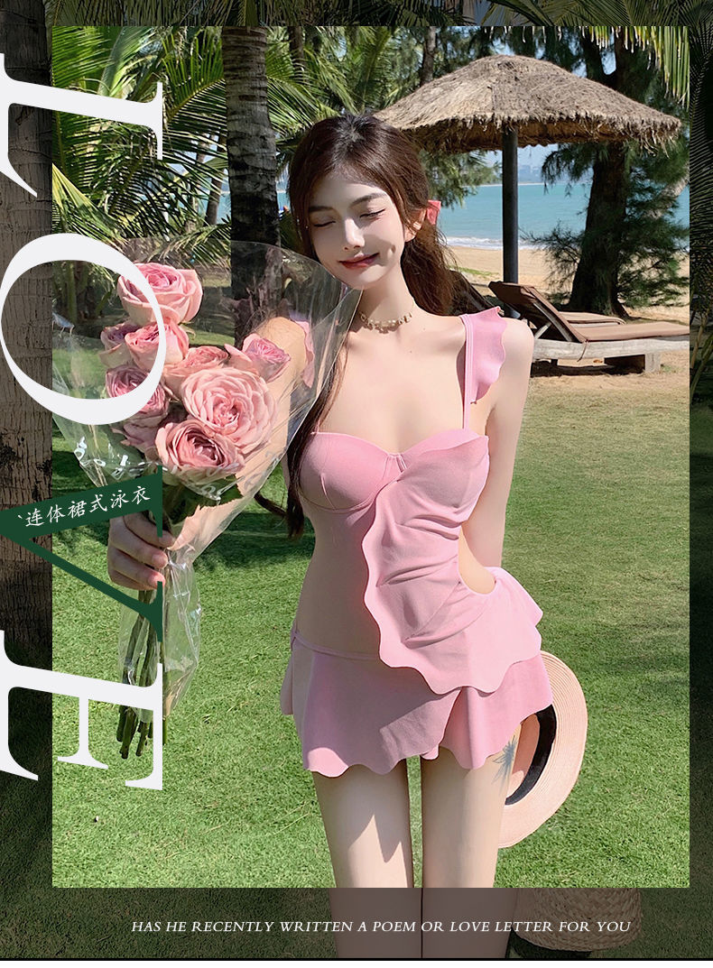 【连体式荷叶边裙式泳衣】黛唯梵泳衣女夏纯欲风仙女范遮肚显瘦性感荷叶边可爱保守连体裙式泳装