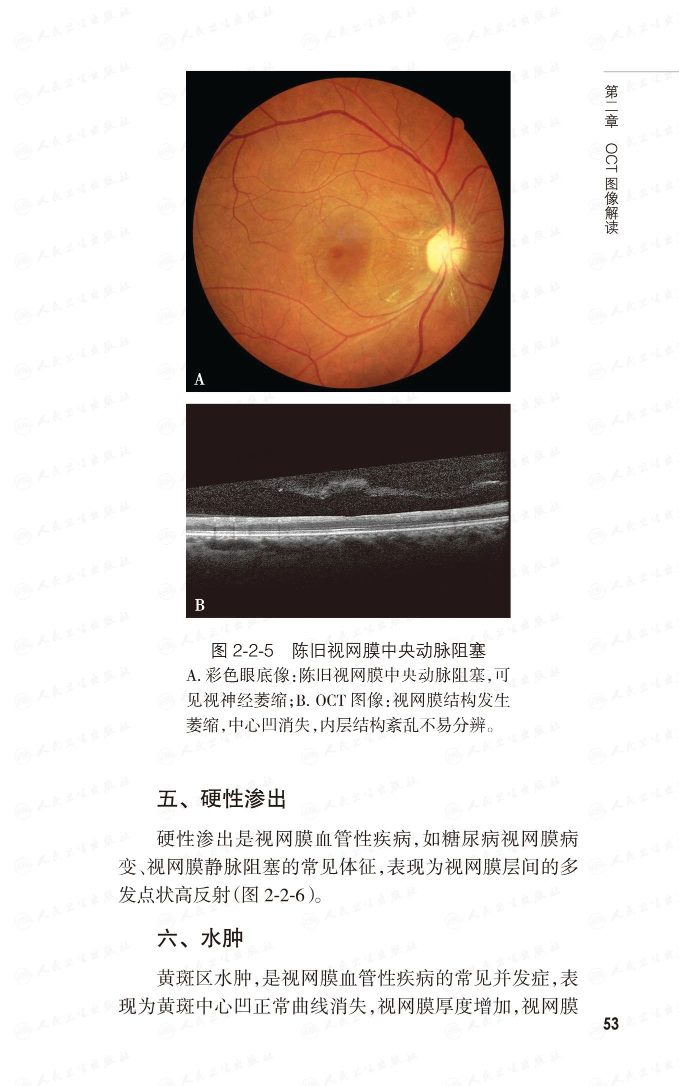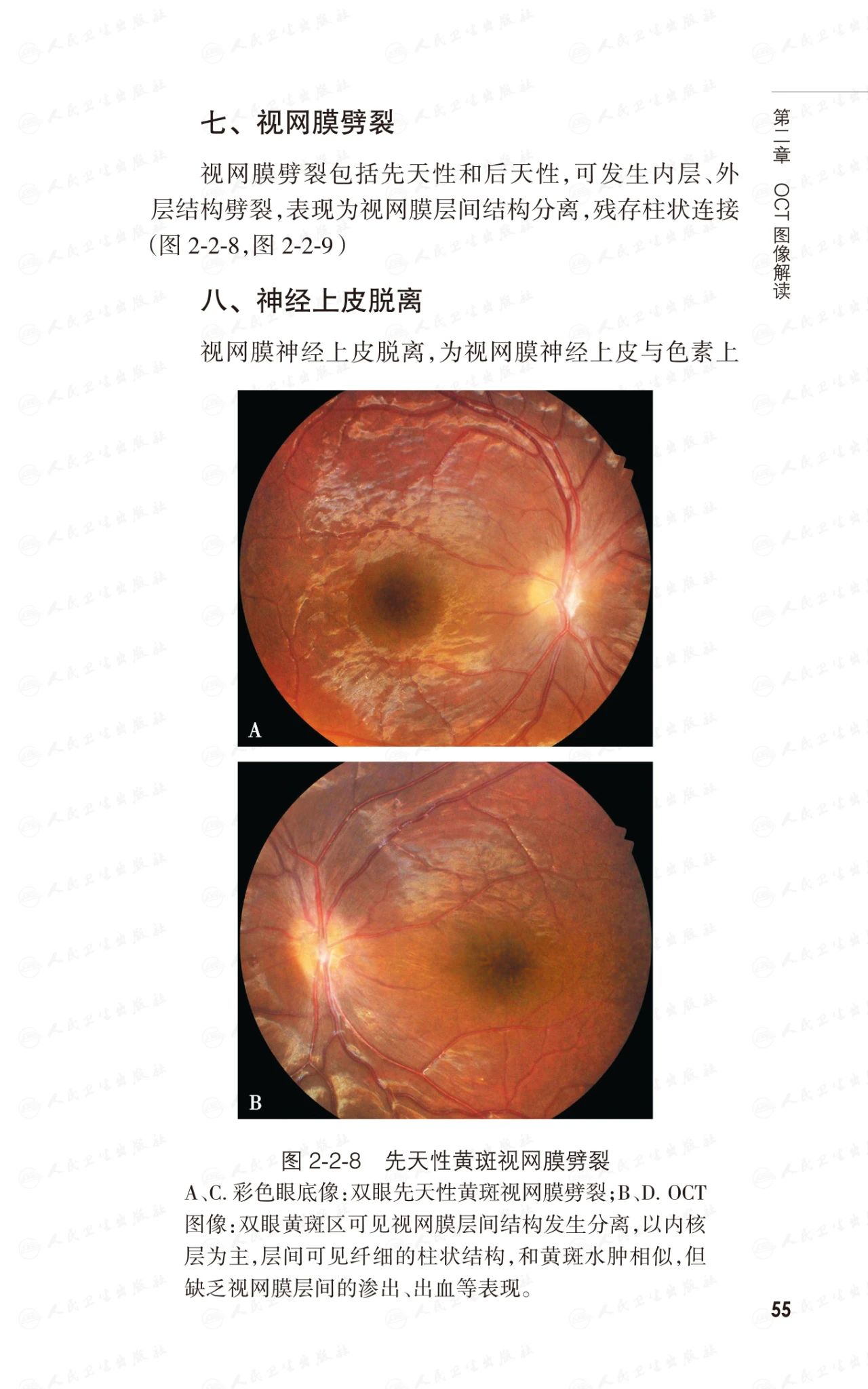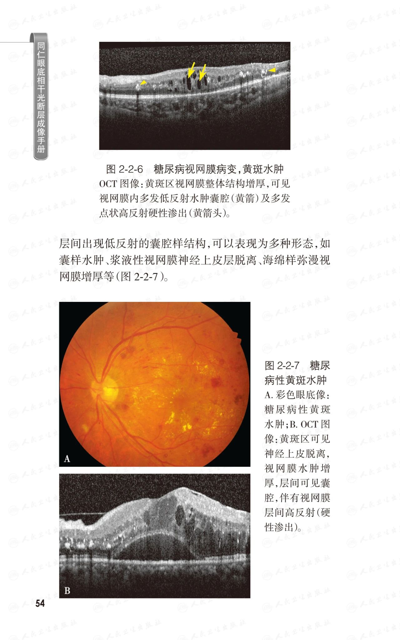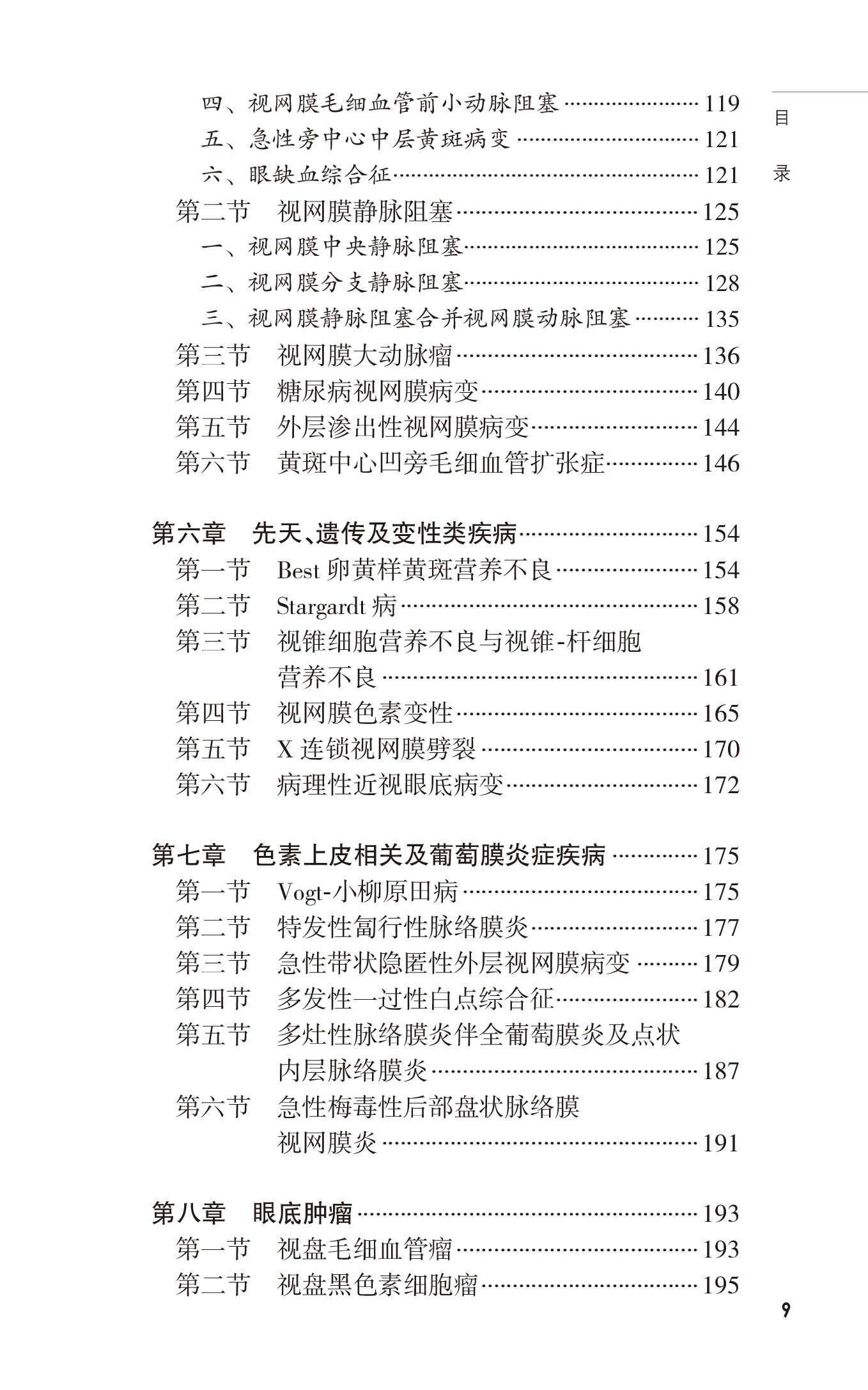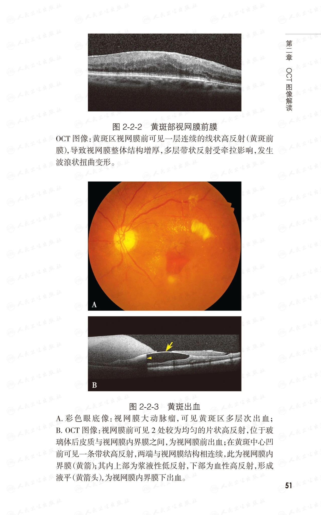2. 清晰配图,注重指导 每例病变体征均同时展现彩色眼底像和B扫描图像,对照显示以帮助读者更好地理解疾病。图片精挑细选,均为临床真实照片,并用指示箭头标注病变体征,方便读者自学。